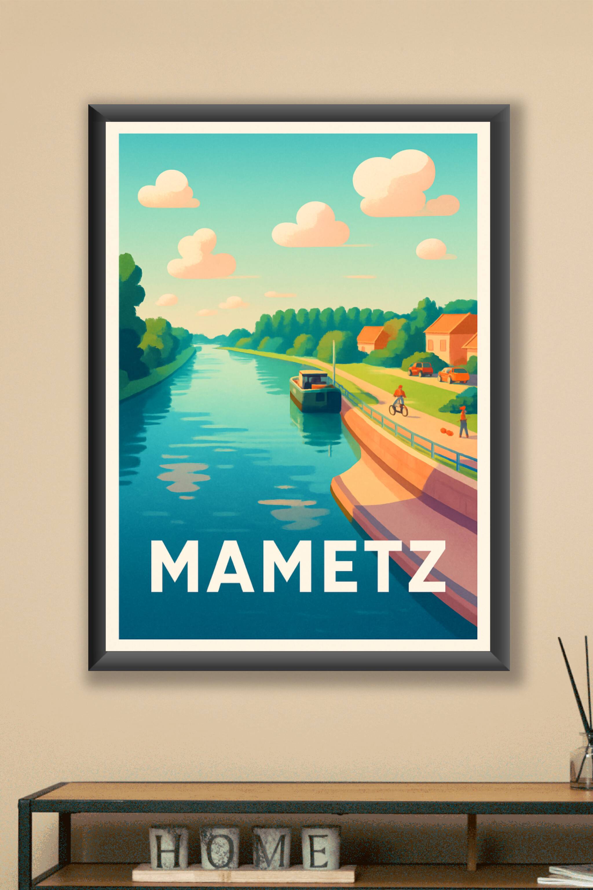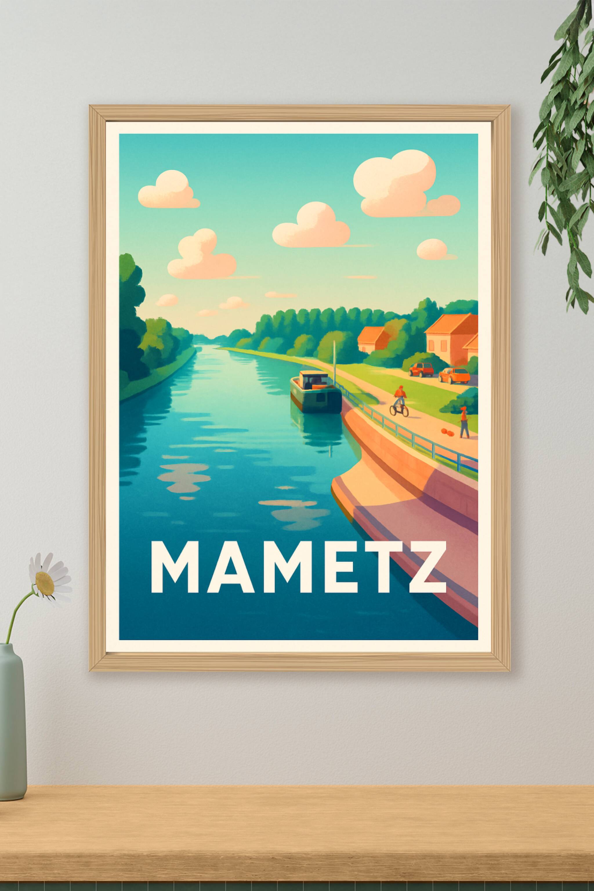 Découvrez la douceur de vivre à Mametz avec cette affiche illustrée qui met en scène une rivière paisible bordée de verdure et de petites maisons c...