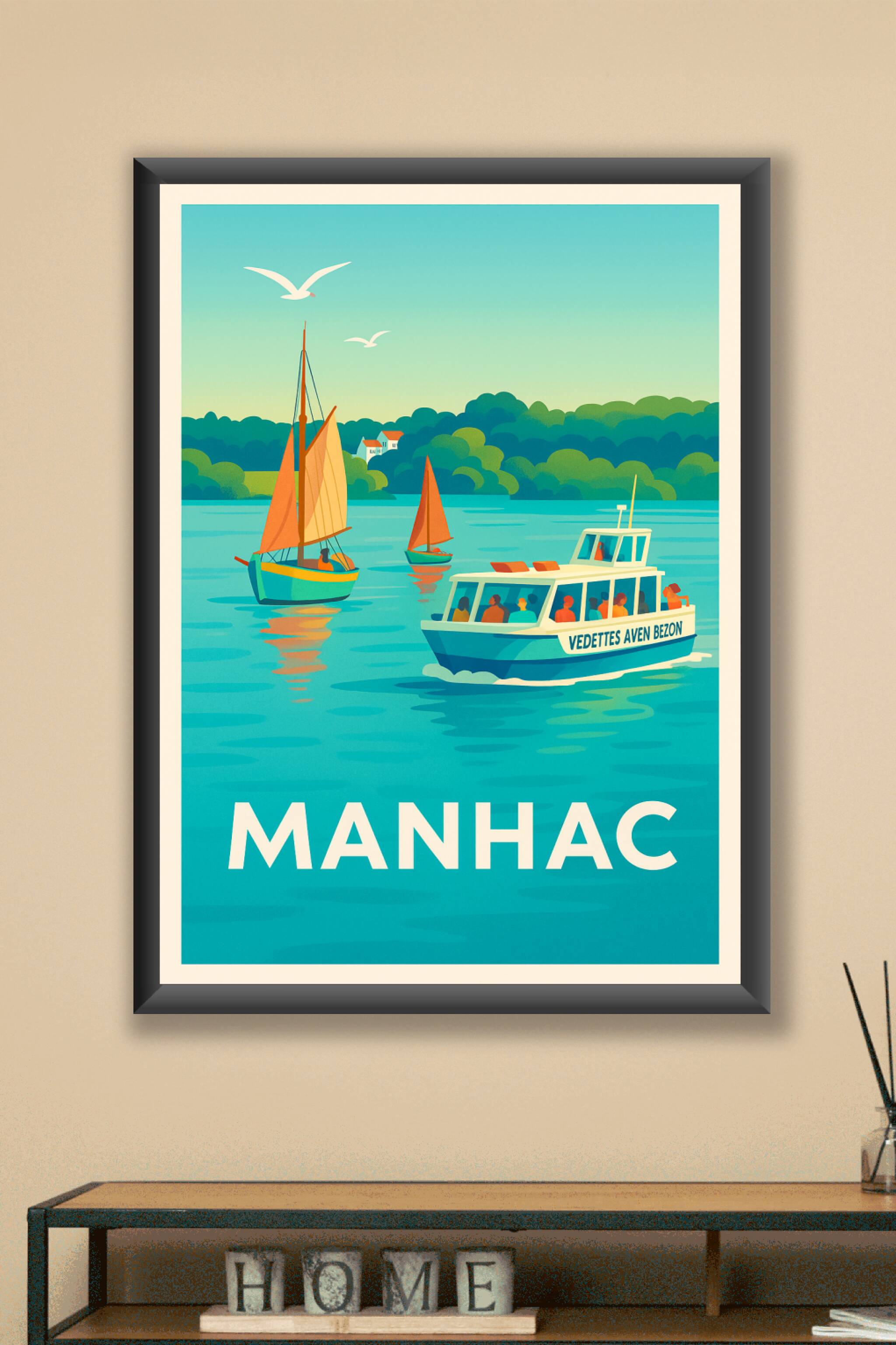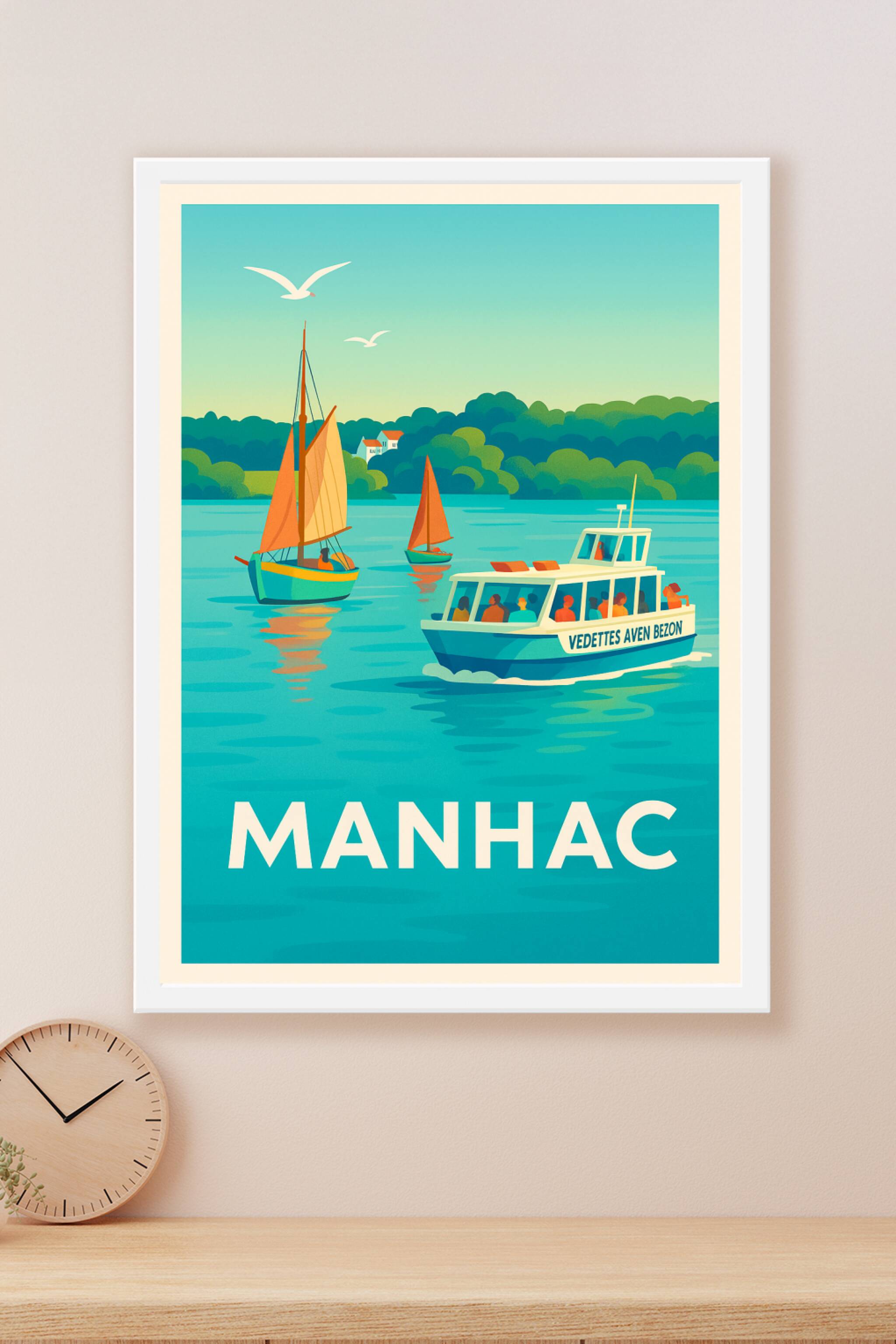 Découvrez la sérénité et la douceur de vivre de Manhac avec cette affiche au style vintage évoquant une balade en vedette et voiliers sur une eau c...
