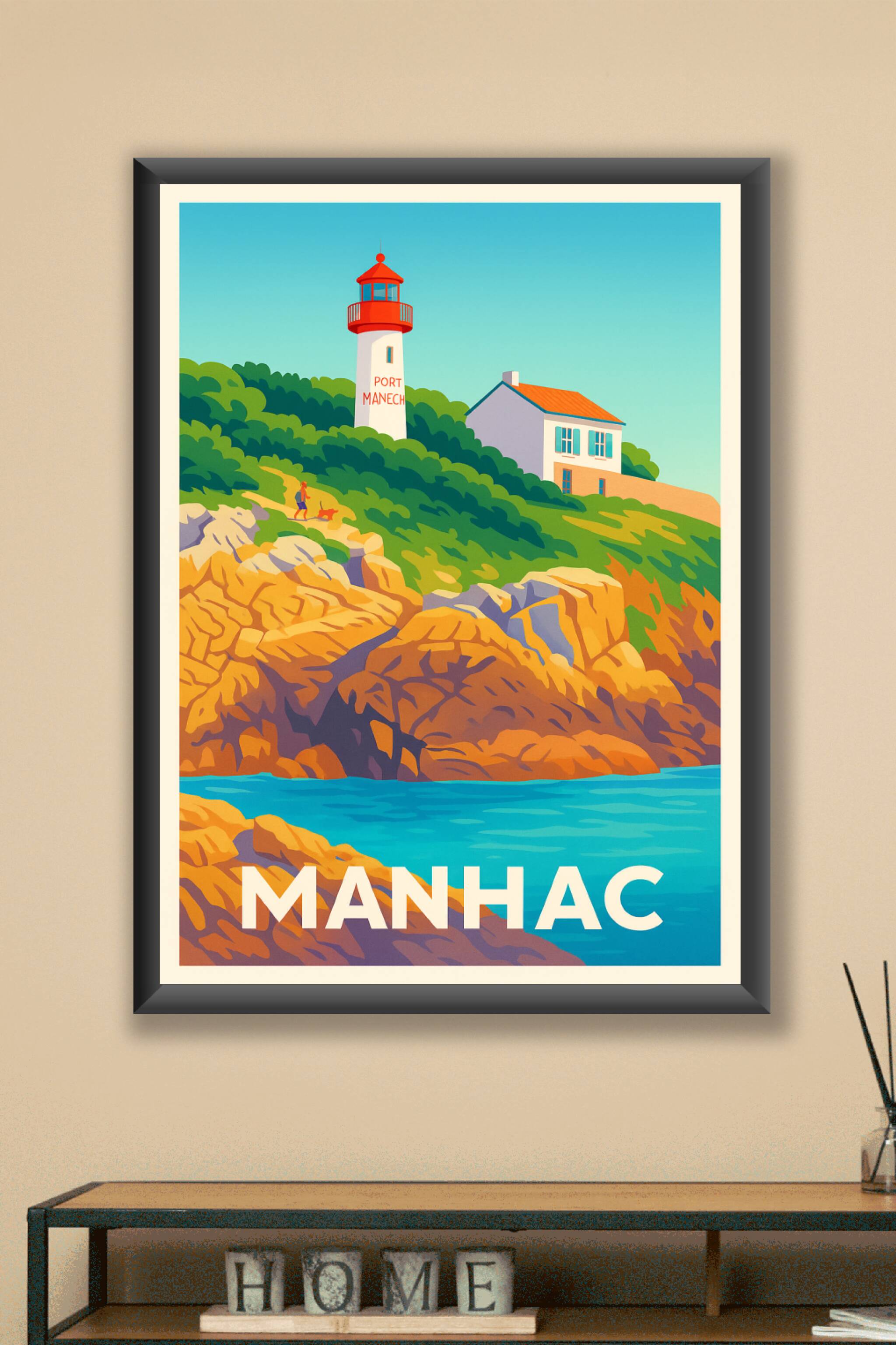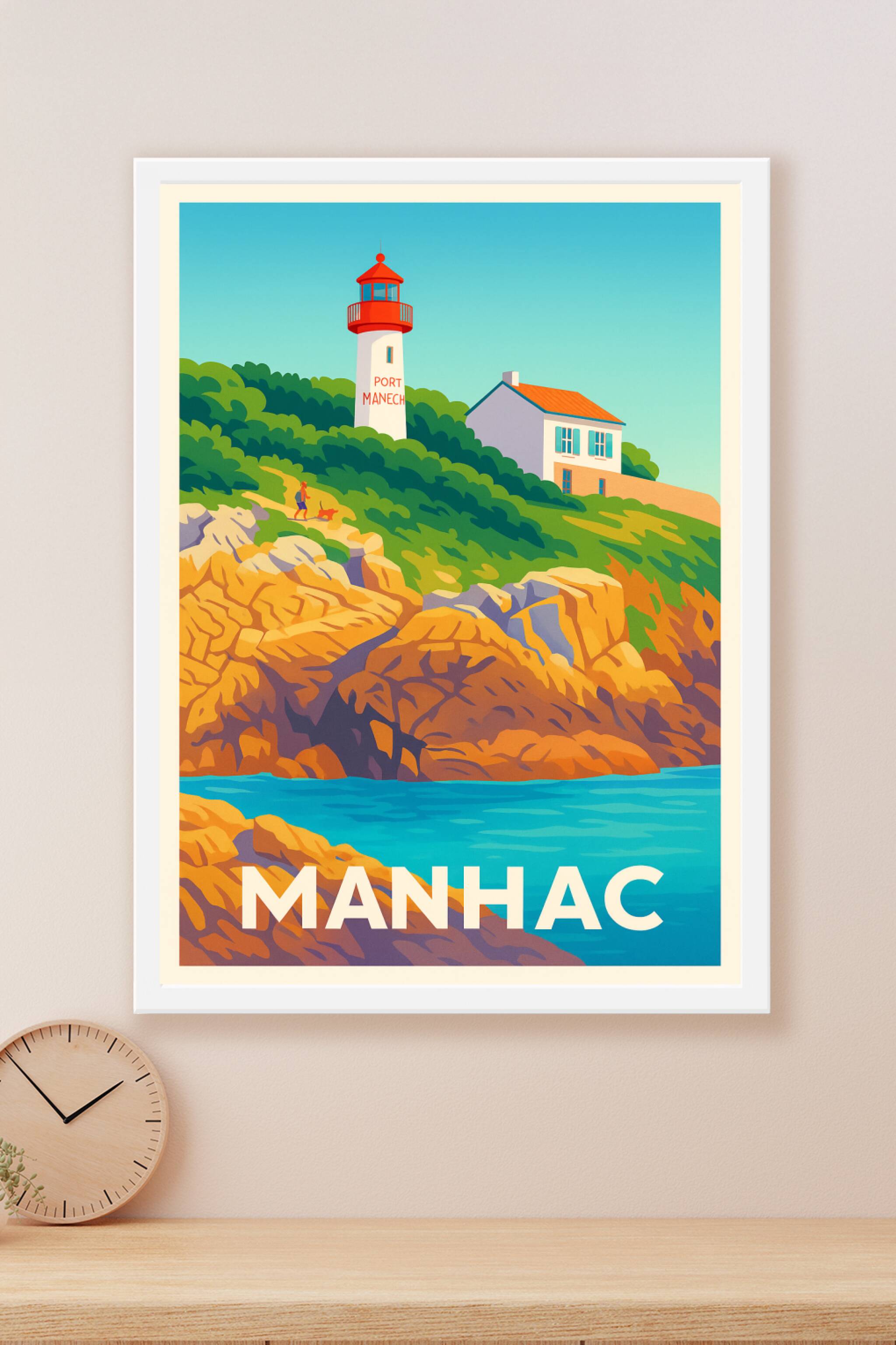 Découvrez la beauté authentique de Manhac avec cette affiche représentant le phare emblématique de Port Manéch, perché sur des falaises dorées surp...