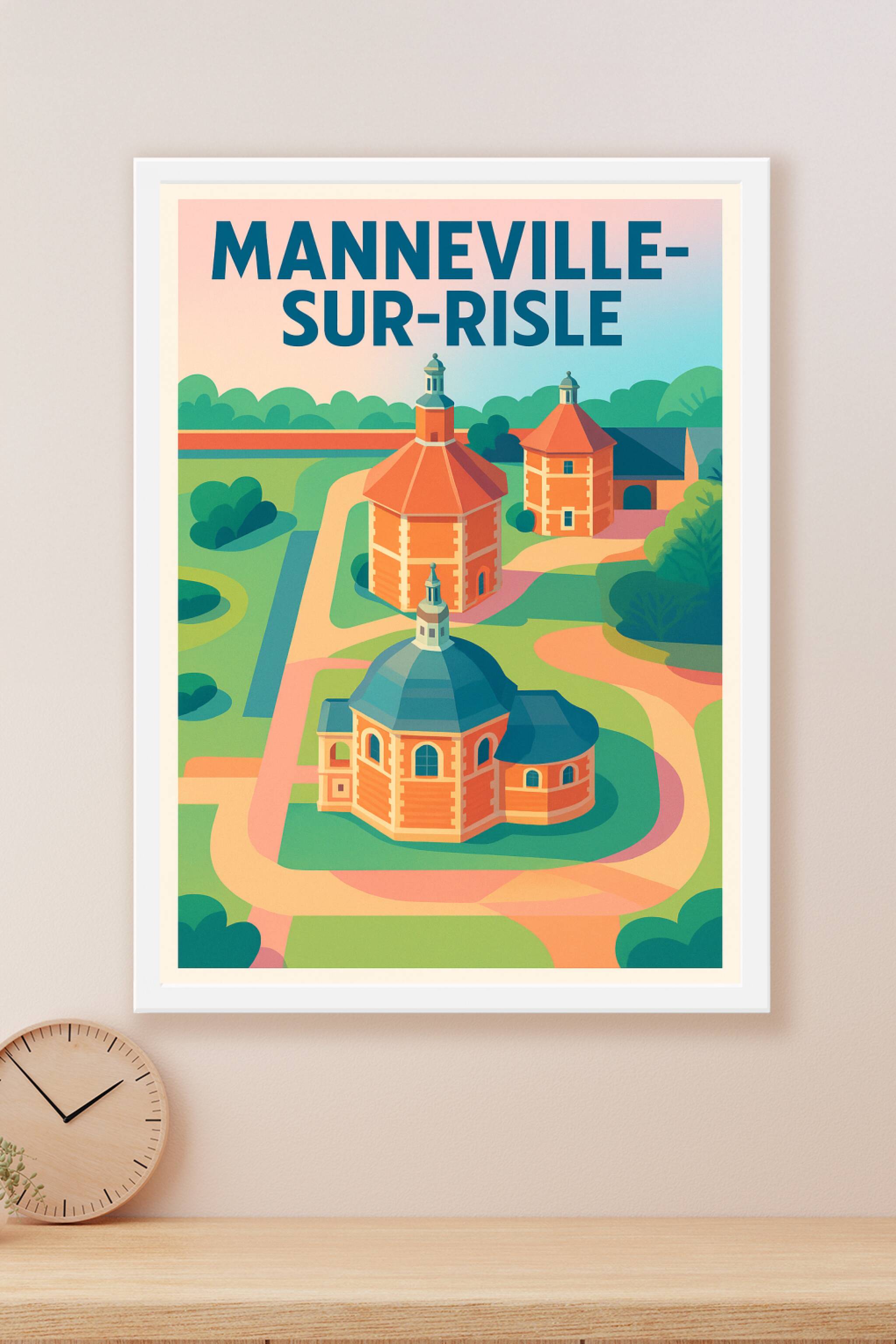 Découvrez l'élégance et la sérénité de Manneville-sur-Risle à travers cette affiche au design vintage et coloré qui met en valeur les bâtiments emb...