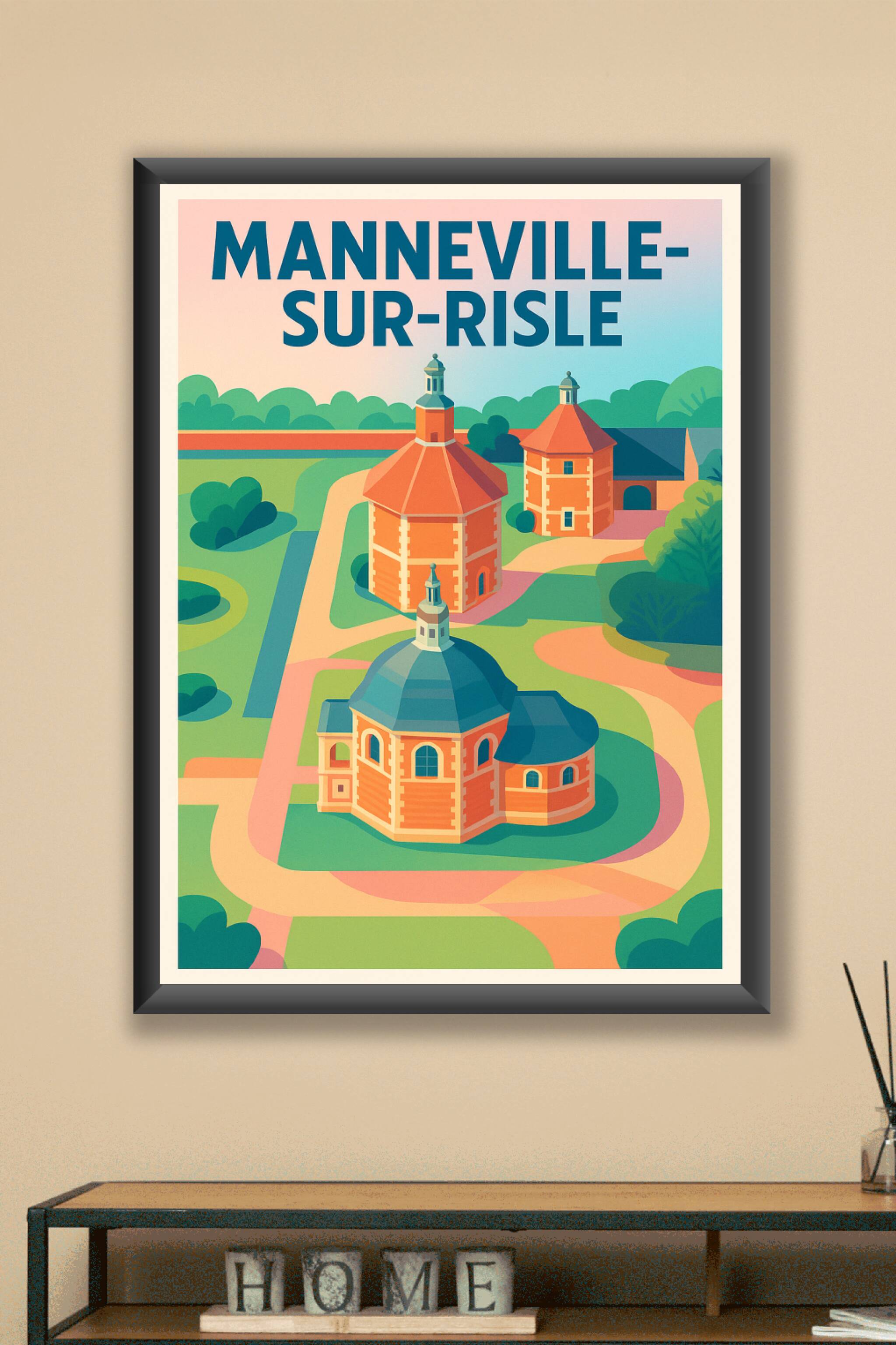 Découvrez l'élégance et la sérénité de Manneville-sur-Risle à travers cette affiche au design vintage et coloré qui met en valeur les bâtiments emblématiques de la ville dans un paysage apaisant. Ce poster est idéal pour apporter une touche d'authenticité et de charme normand à votre décoration intérieure. Imprimée en tirage Fine Art sur papier 305g coton de haute qualité, cette affiche vous garantit des couleurs éclatantes et une texture raffinée. Disponible en formats A1 à A4, avec ou sans cadre, elle s'adapte à tous vos espaces, que ce soit au salon, bureau ou chambre. Offrez-vous ou faites plaisir avec un souvenir imprimé en France, parfait pour les amateurs d'art et les passionnés des villages normands.