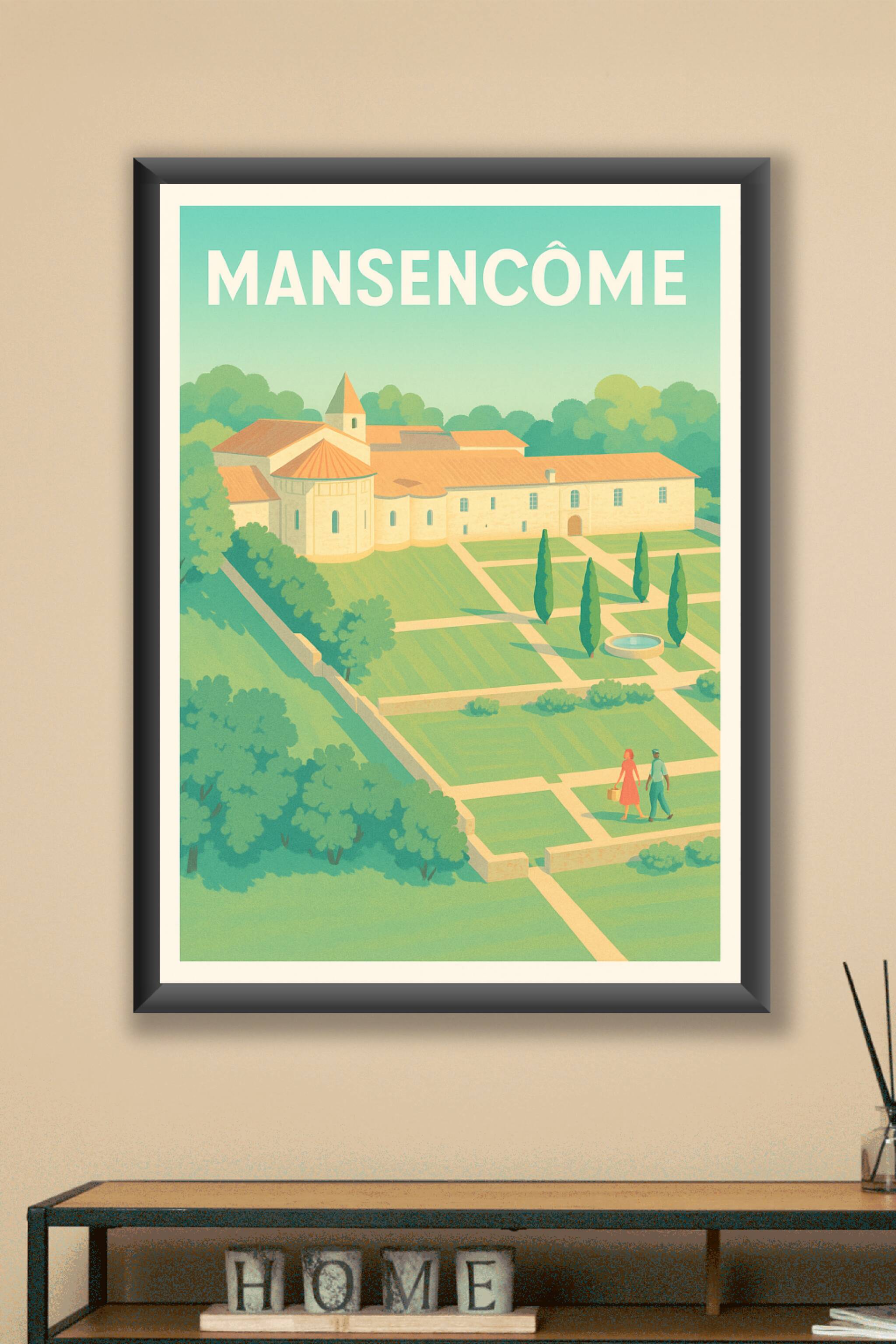 Découvrez la sérénité et le charme bucolique de Mansencôme avec cette affiche illustrée. Ce poster met en lumière un paysage apaisant où la nature ...