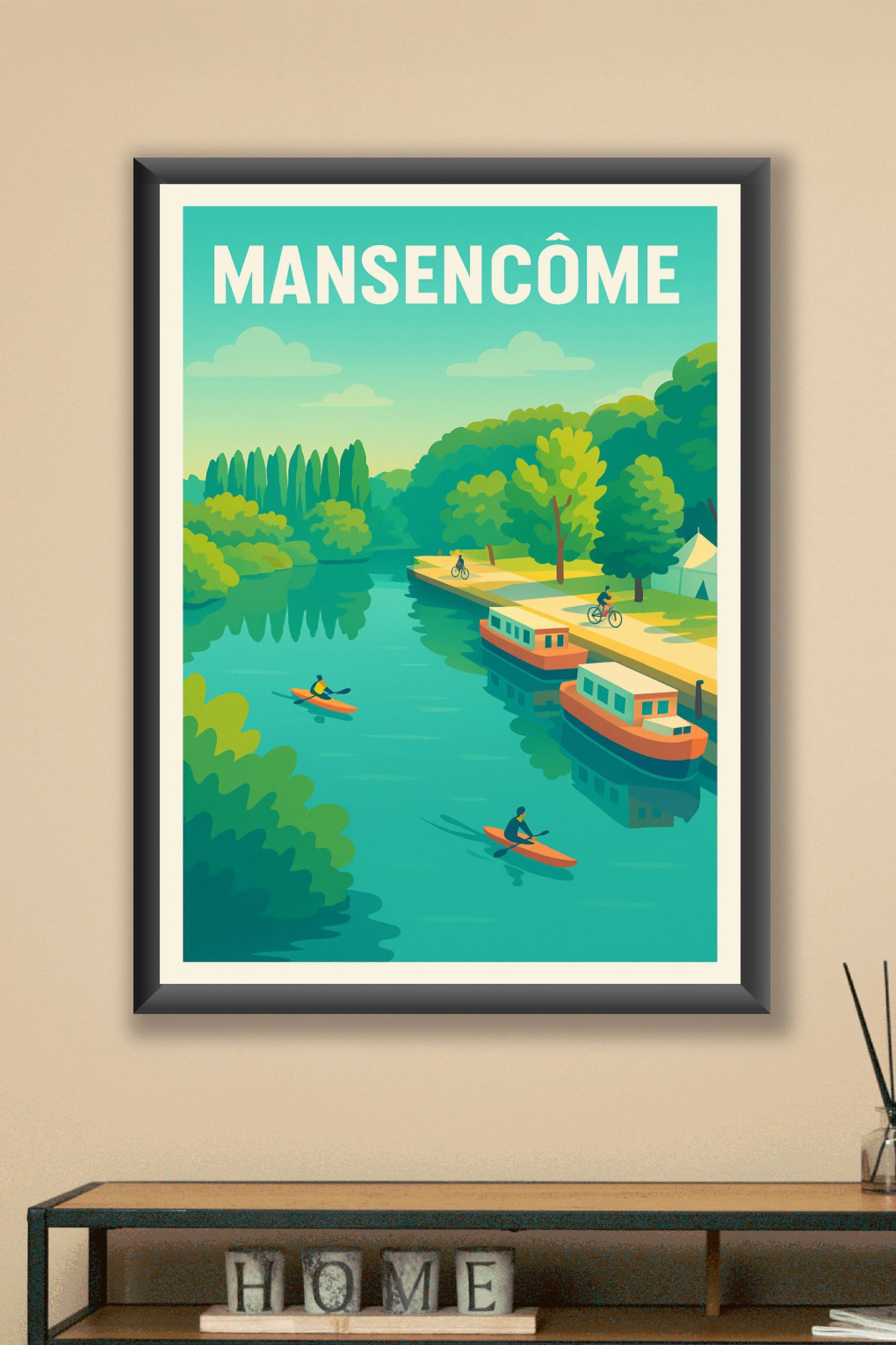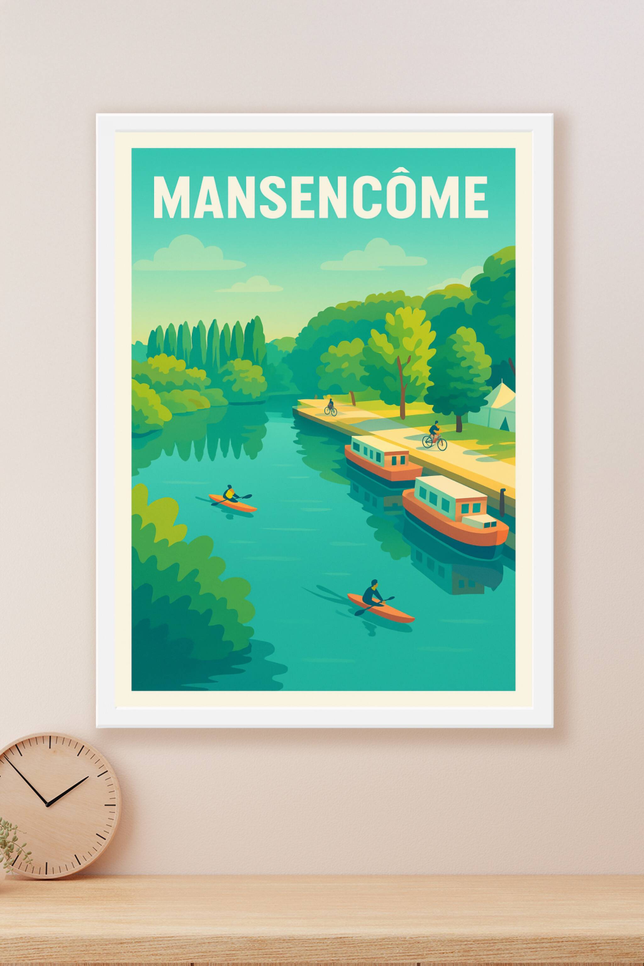 Découvrez la sérénité des paysages de Mansencôme avec cette affiche illustrée aux couleurs apaisantes. Représentant une rivière bordée de verdure, ...