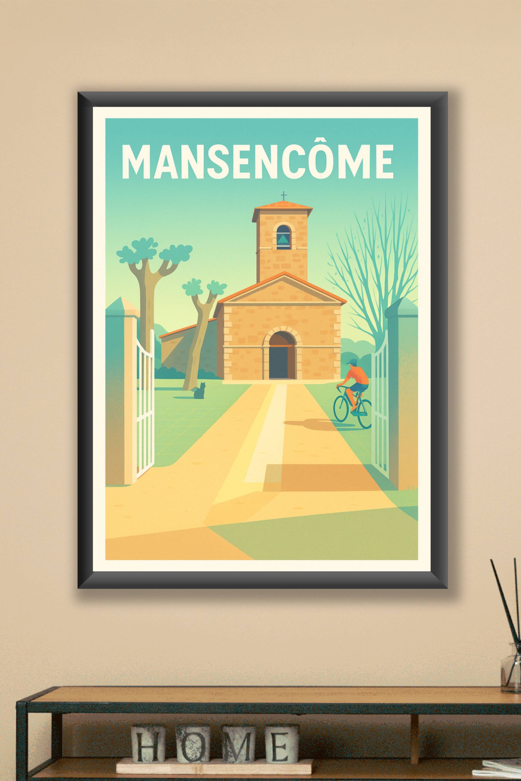 Découvrez cette affiche illustrée avec douceur qui capture l'atmosphère tranquille de Mansencôme, mettant en scène une charmante chapelle baignée p...
