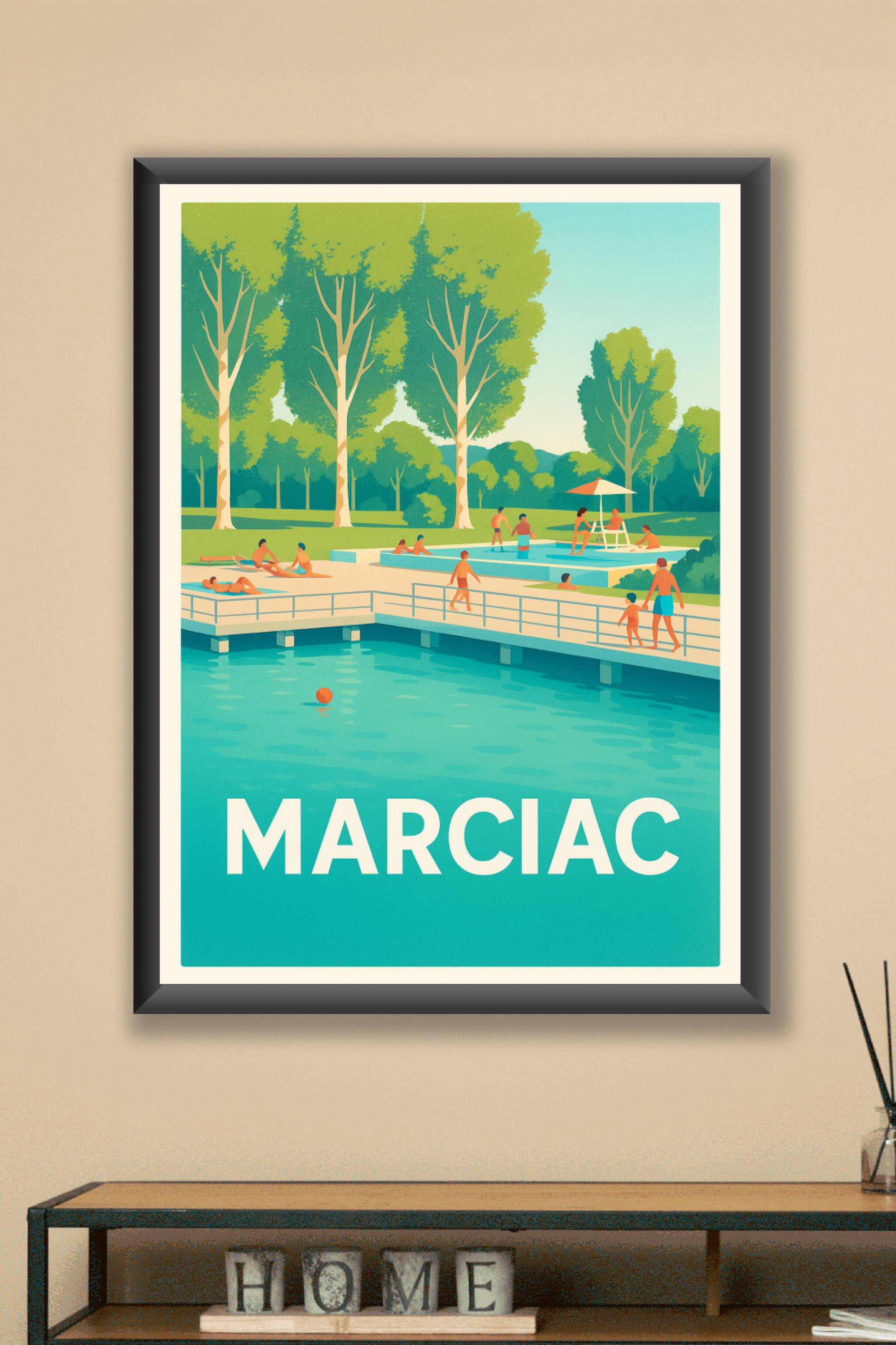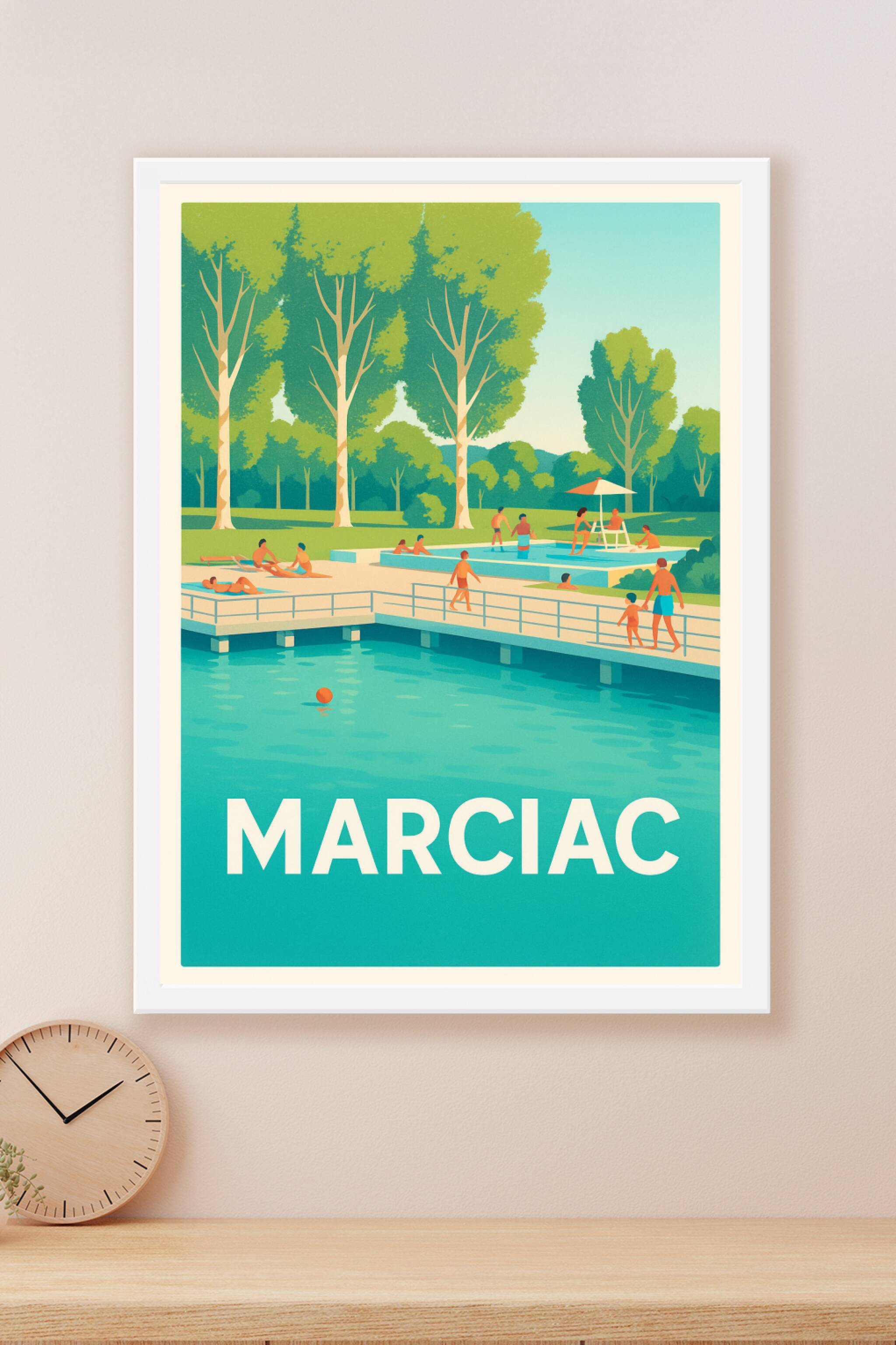 Découvrez l'ambiance paisible et joyeuse de Marciac avec cette affiche au style rétro qui met en scène une piscine en plein air entourée d'arbres l...