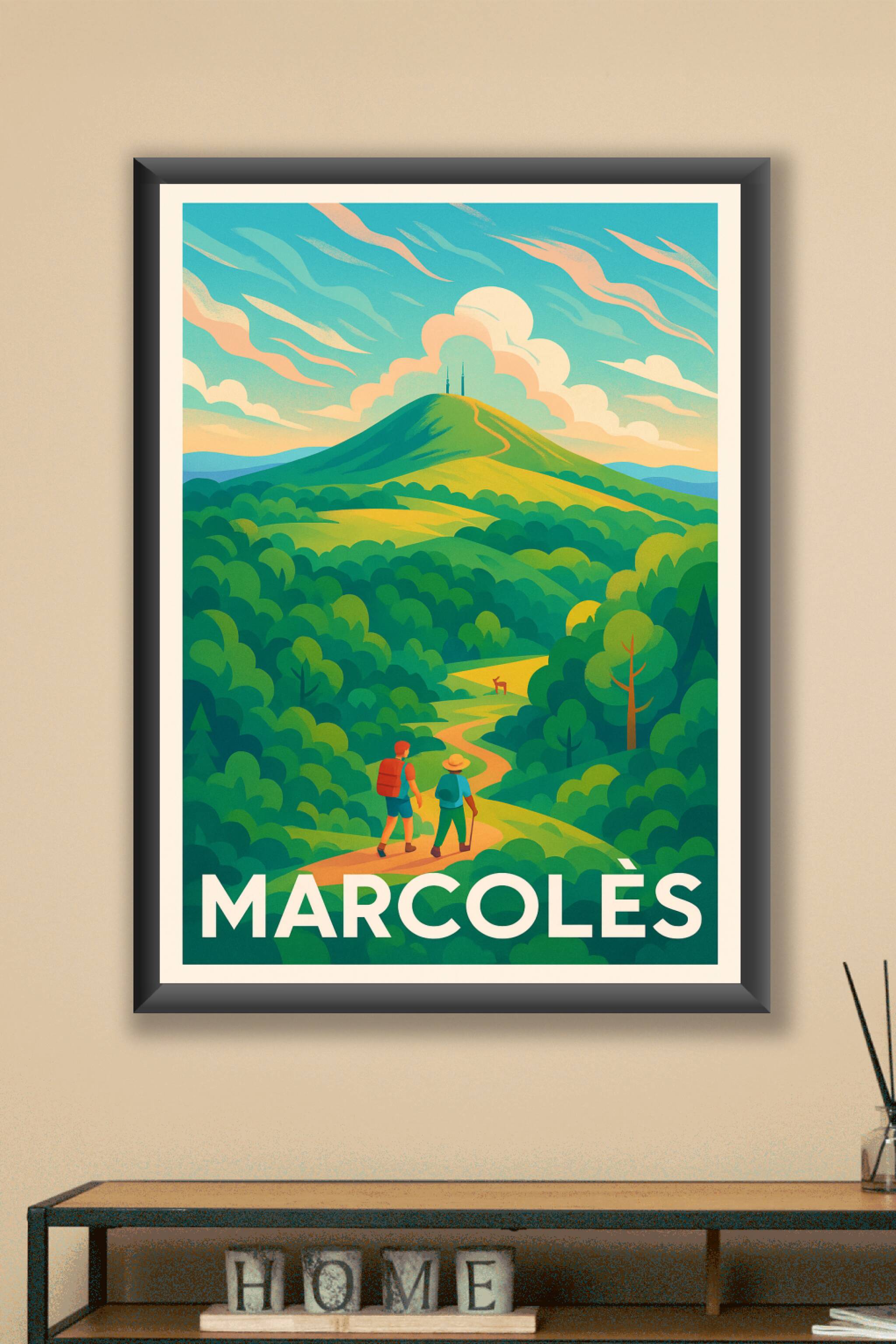 Découvrez l'ambiance paisible et verdoyante de Marcolès avec cette affiche illustrée mettant en scène une randonnée dans un paysage vallonné et lum...