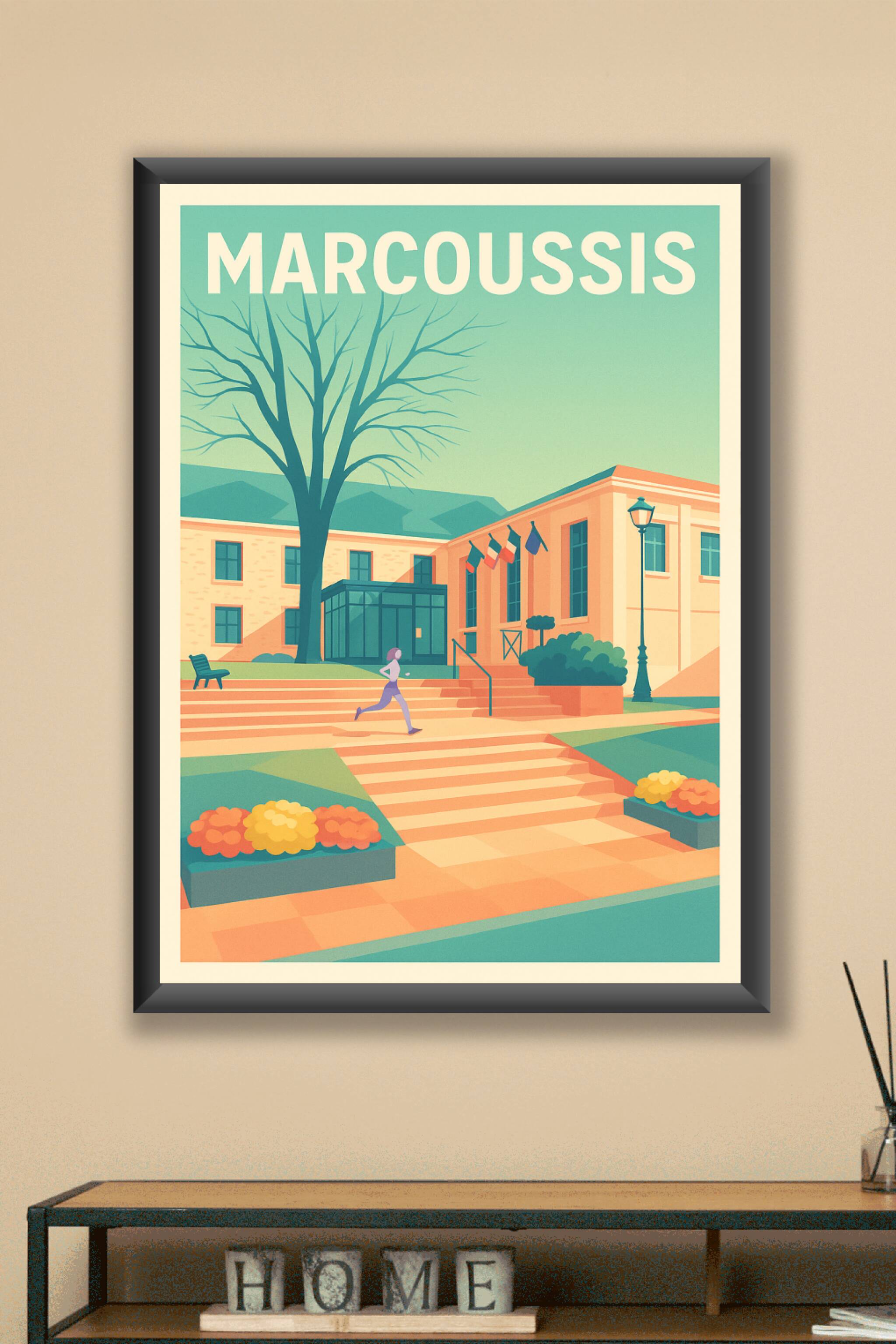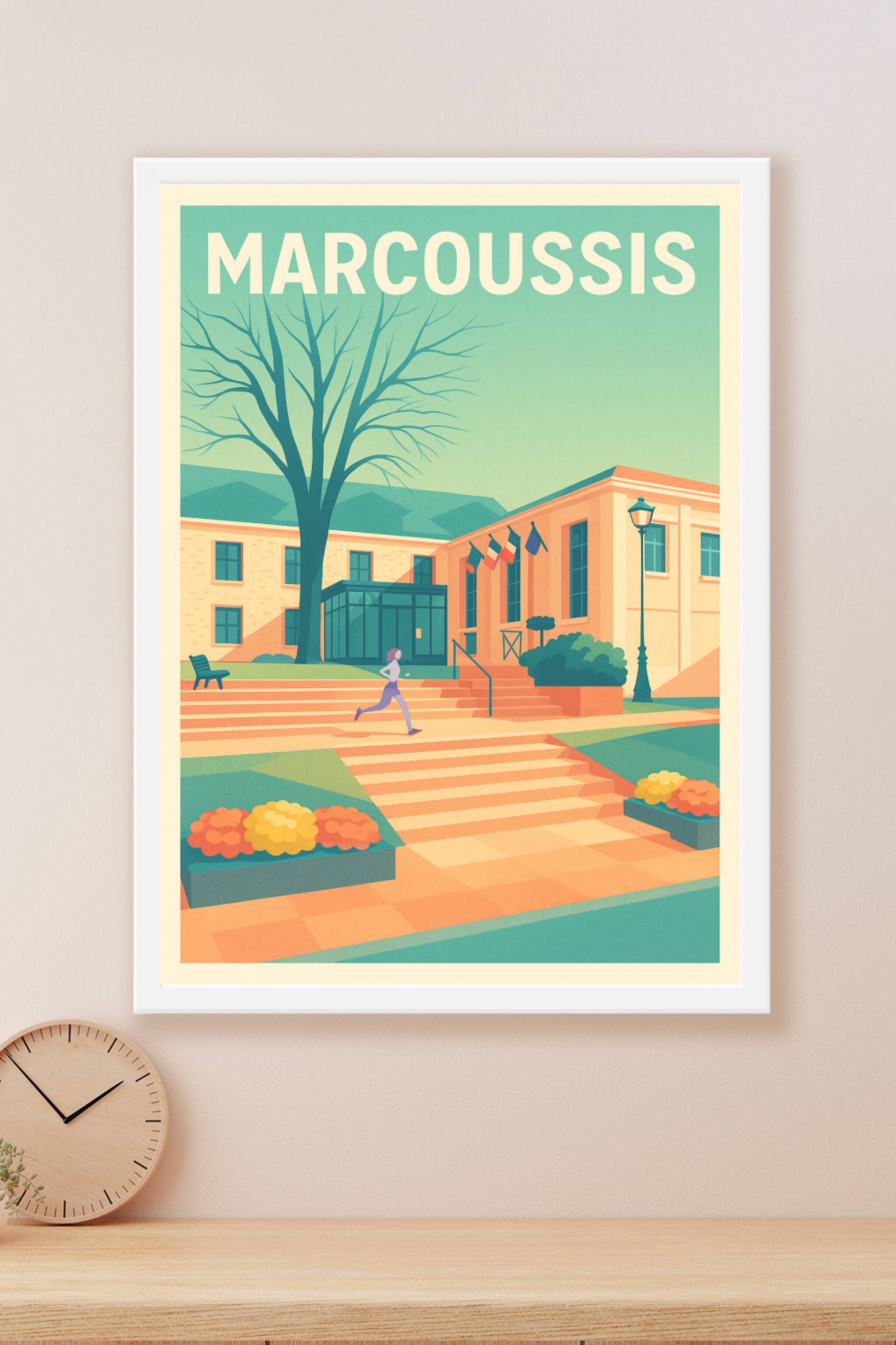 Découvrez cette affiche inspirante qui capture l'essence tranquille et charmante de Marcoussis. Avec une illustration stylisée mettant en avant l'a...