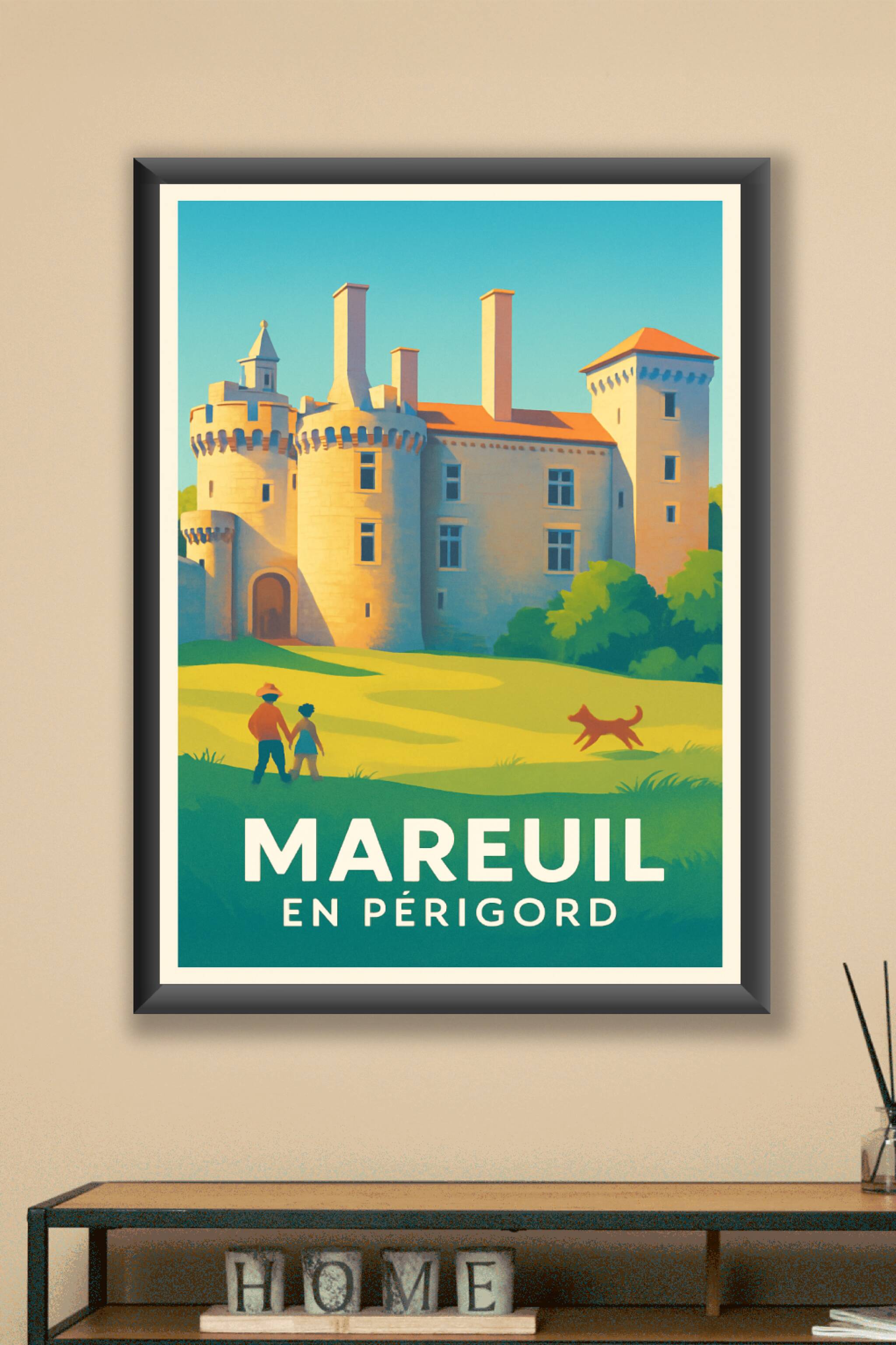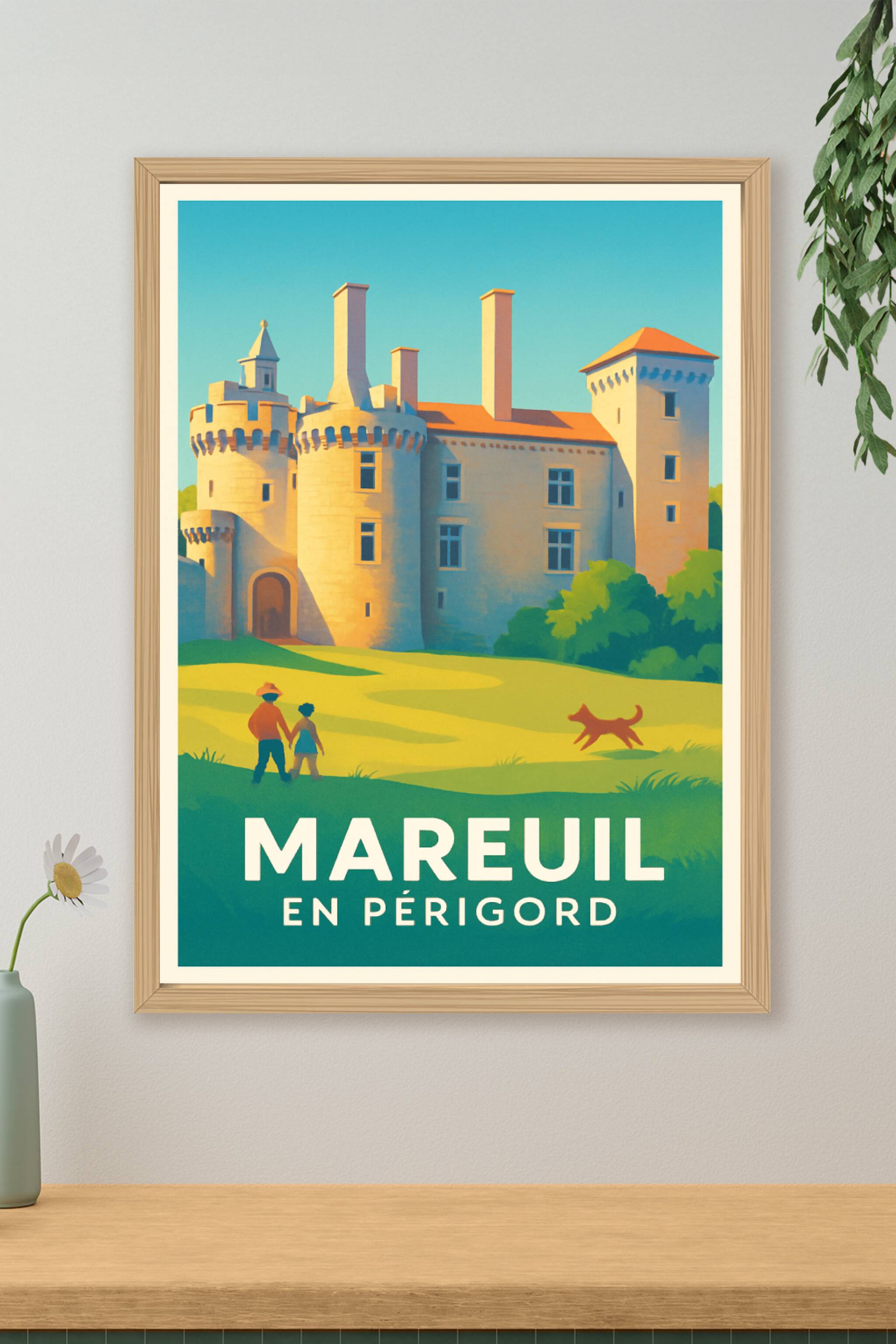 Découvrez Mareuil en Périgord à travers cette affiche illustrée mettant en lumière son patrimoine remarquable avec ce château emblématique baigné de lumière. Ce poster aux couleurs douces évoque la sérénité et la richesse historique de cette charmante commune du Périgord. Disponible en tirage "Fine Art" sur papier 305g coton, chaque affiche garantit une qualité d'impression exceptionnelle, des détails précis et des couleurs vibrantes. Choisissez parmi les formats A1 à A4, avec ou sans cadre, pour sublimer votre intérieur ou offrir un cadeau authentique aux passionnés de patrimoine. Une décoration élégante et raffinée, 100% fabriquée en France, pour apporter une touche d'histoire et de nature chez vous.