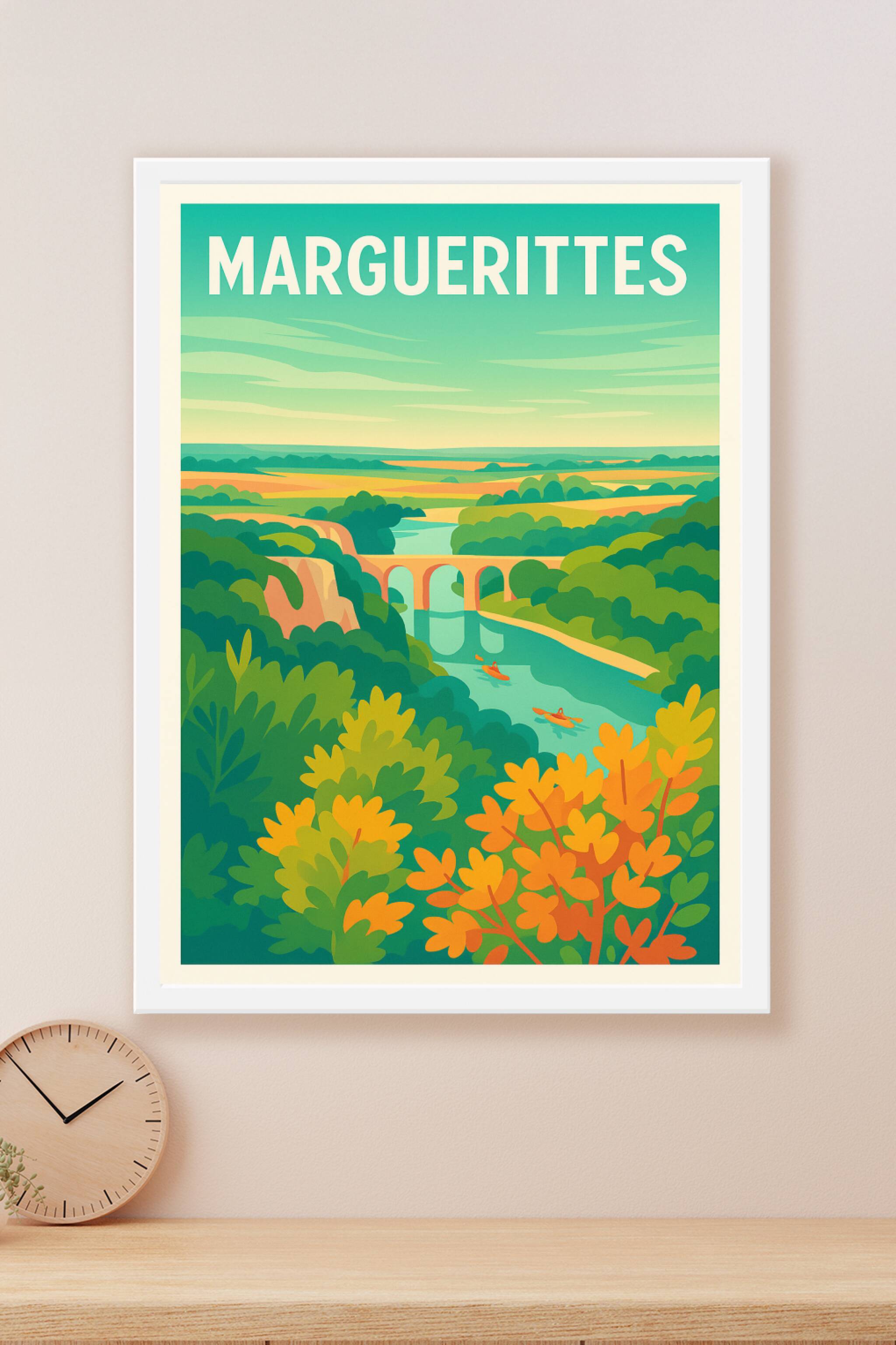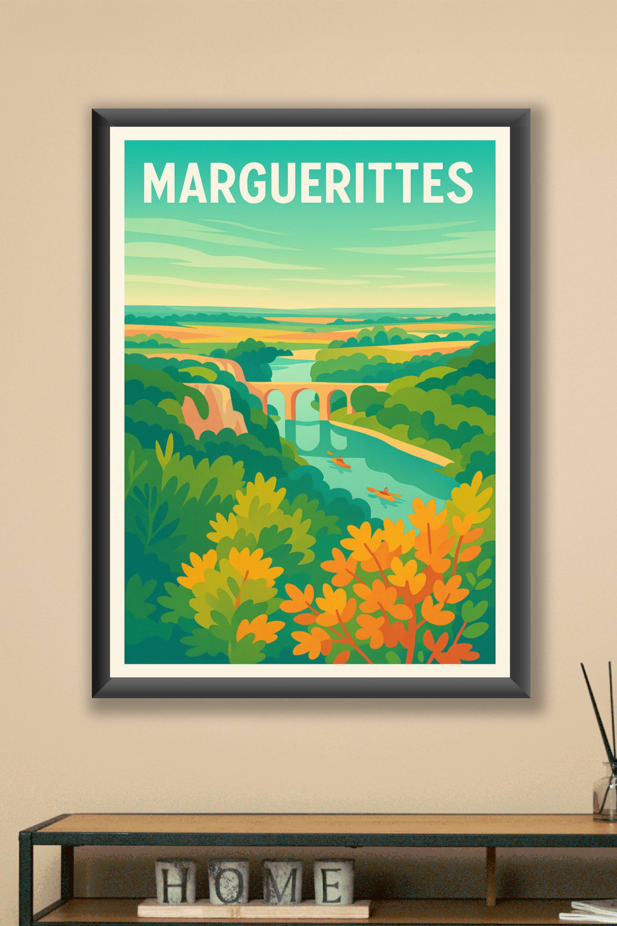 Découvrez la beauté paisible de Marguerittes avec cette affiche aux teintes douces et vibrantes. Ce poster illustre un paysage bucolique, entre riv...