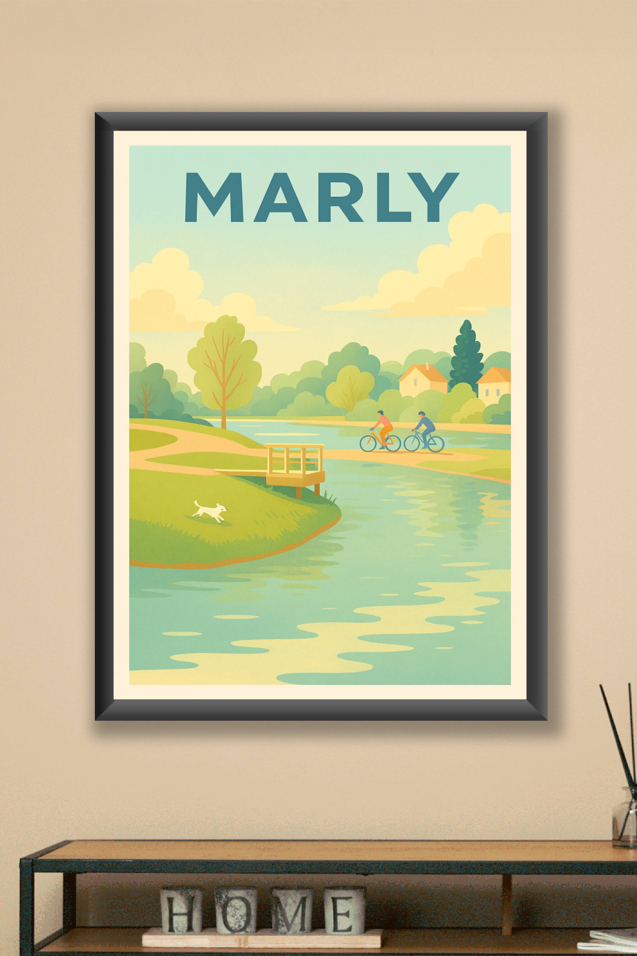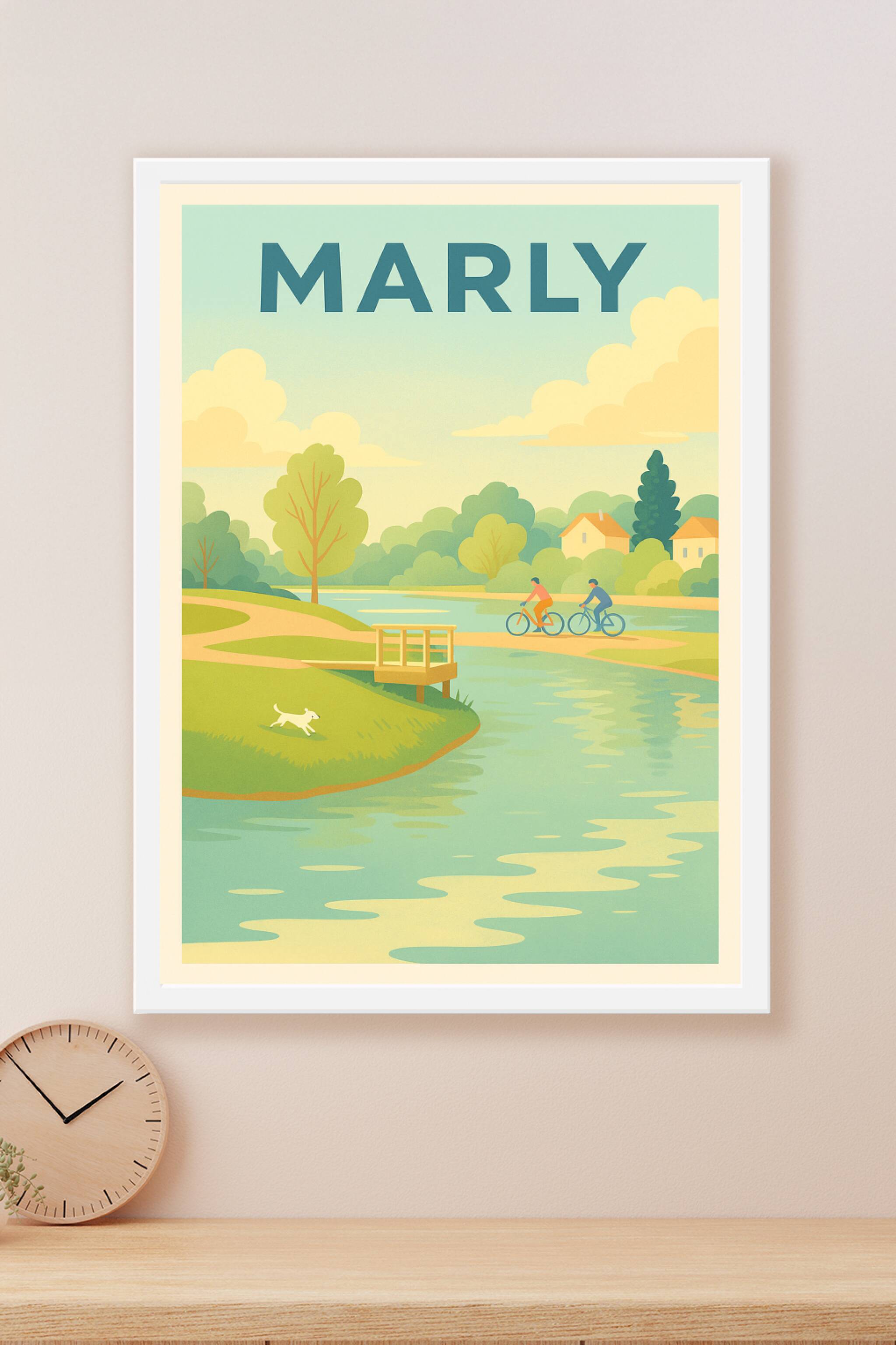 Découvrez l'atmosphère paisible de Marly avec cette affiche illustrée qui capture un paysage bucolique où le calme des berges se mêle aux petites m...