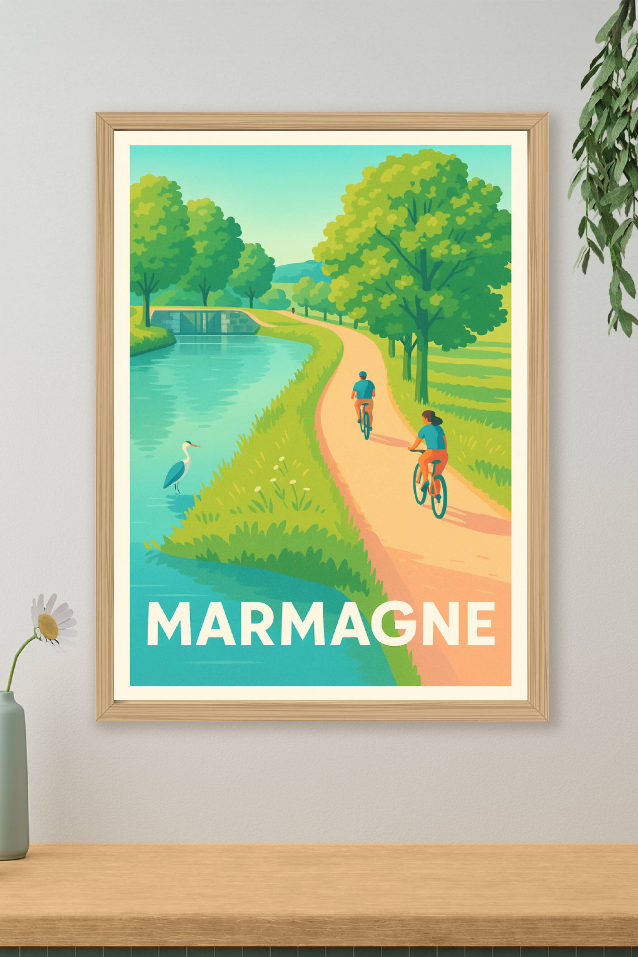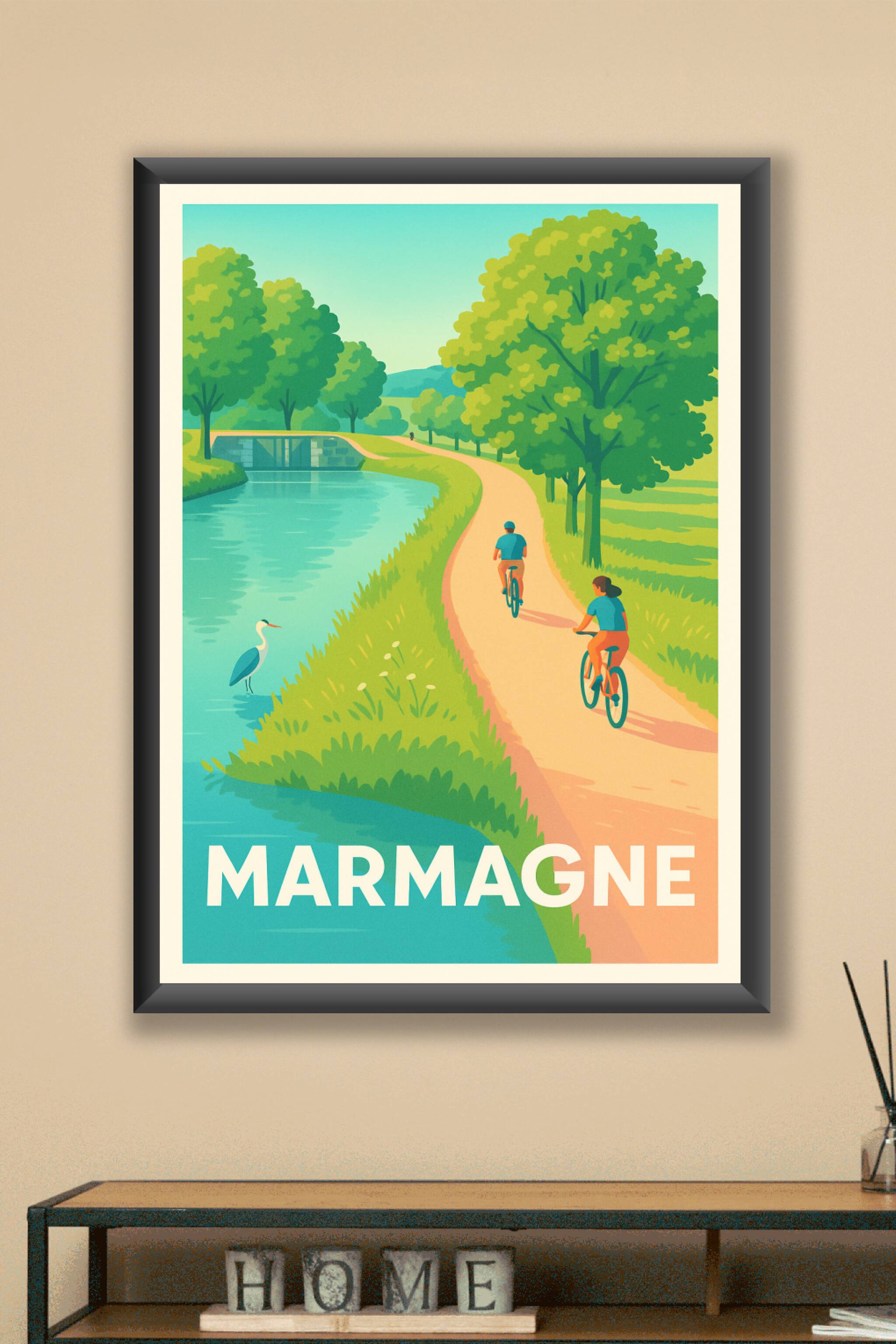 Découvrez la quiétude de Marmagne à travers cette affiche illustrée mettant en scène un chemin paisible le long d'un cours d'eau, idéal pour une ba...