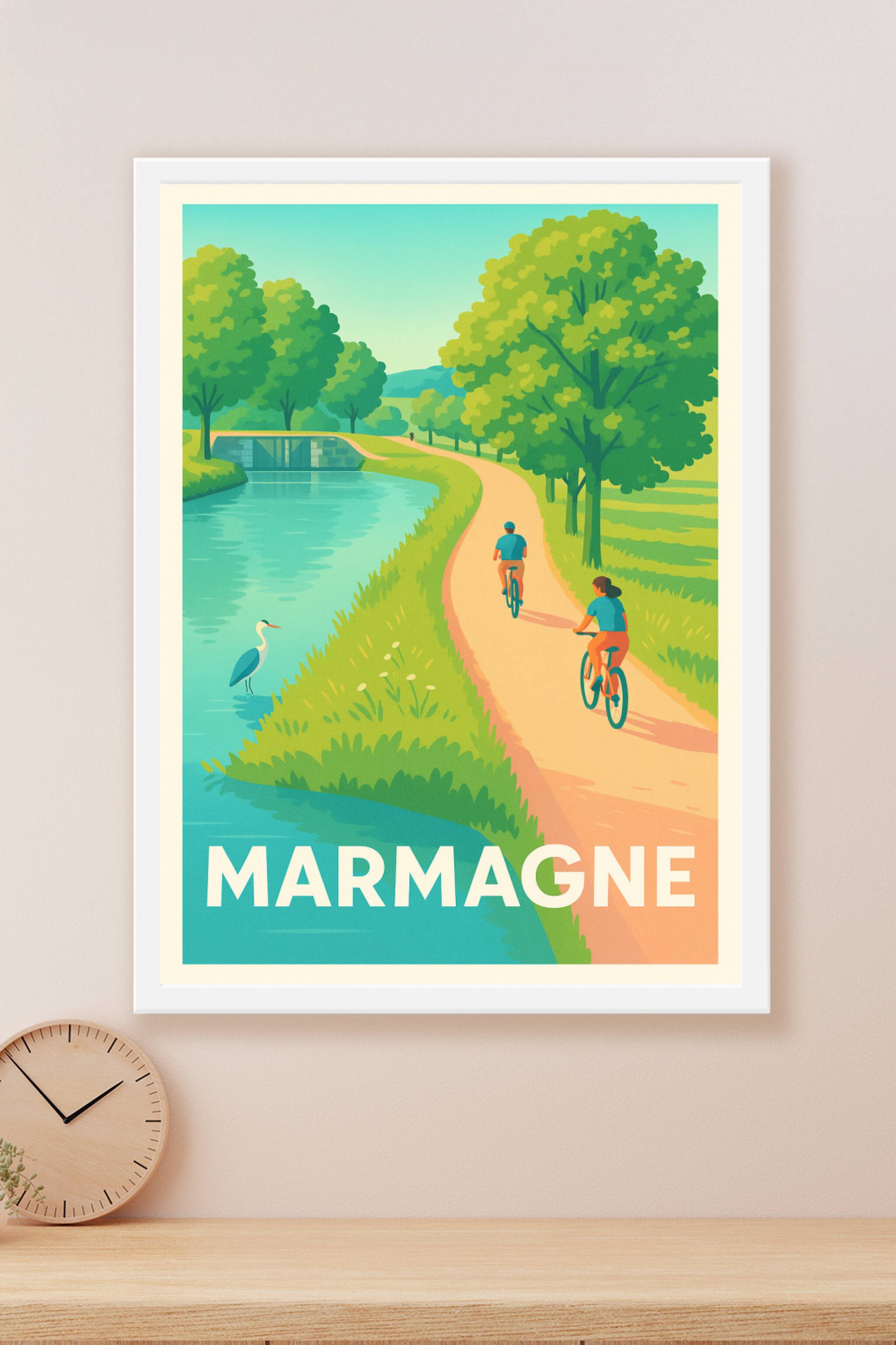 Découvrez la quiétude de Marmagne à travers cette affiche illustrée mettant en scène un chemin paisible le long d'un cours d'eau, idéal pour une balade à vélo. Cette scène empreinte de douceur et de verdure capture l'essence même des espaces naturels préservés et invite à l'évasion au cœur de la campagne française.Ce poster est imprimé en tirage Fine Art sur papier coton 305g, garantissant une qualité d'impression exceptionnelle et une durabilité sans pareil. Disponible en formats A1 à A4, avec ou sans cadre, il s'adapte parfaitement à tous les styles d'intérieur, que ce soit pour décorer un salon, un bureau ou une chambre.Offrez-vous ou offrez à un proche ce souvenir élégant et apaisant de Marmagne, sublimé par une impression haut de gamme 100% fabriquée en France.