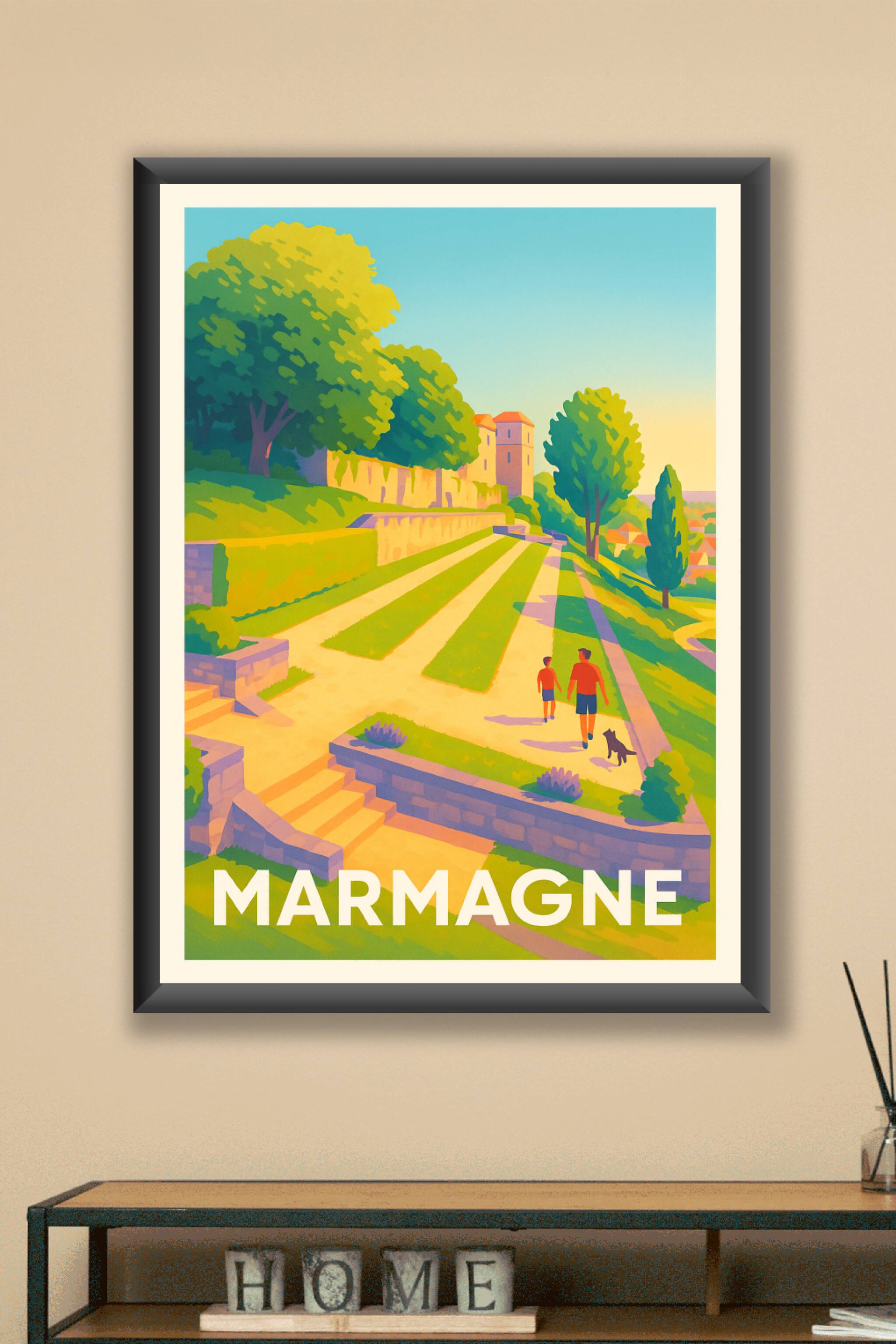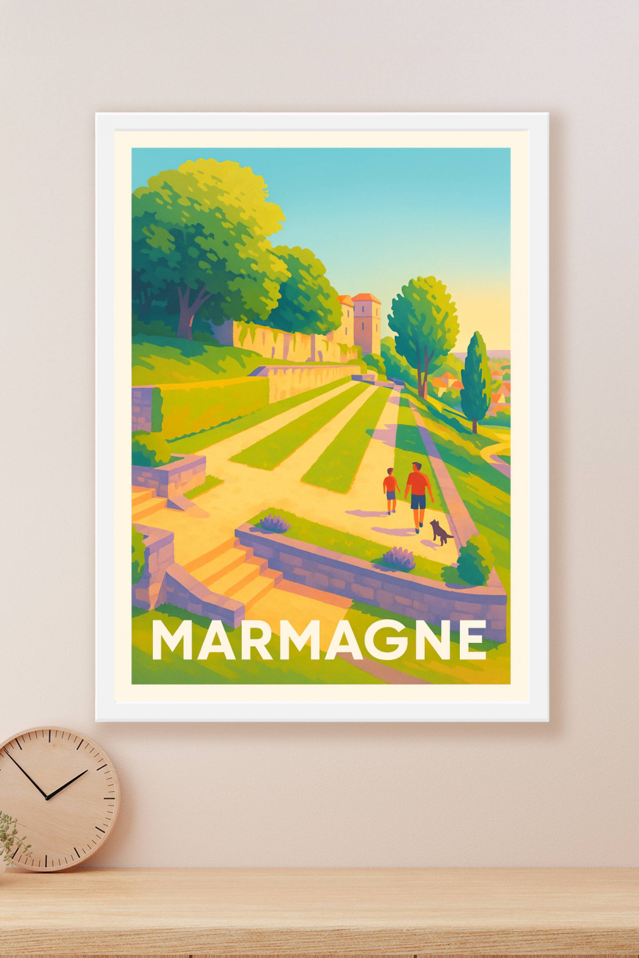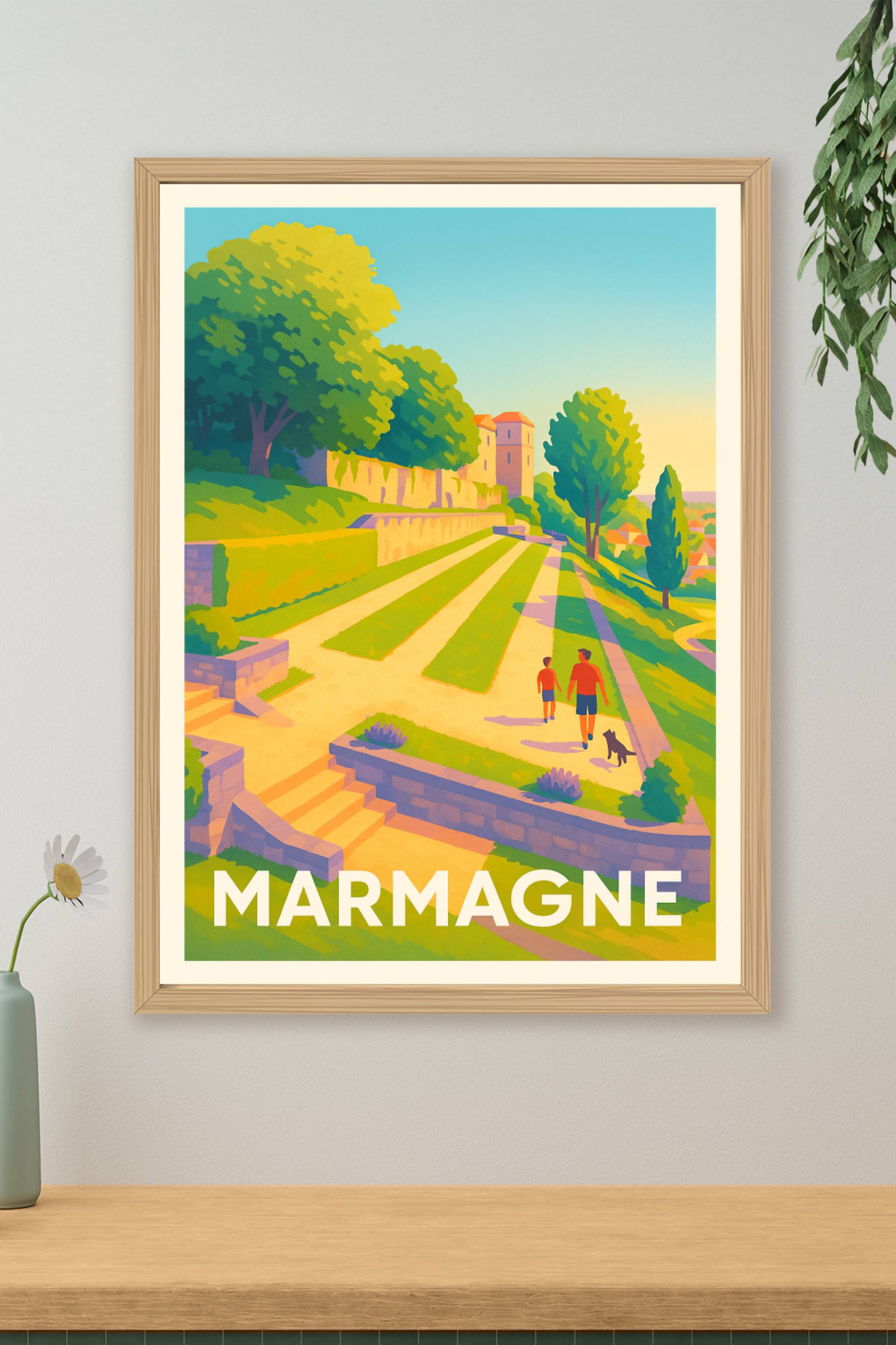 Découvrez l'élégance paisible de Marmagne avec ce poster illustré aux couleurs douces et lumineuses, mettant en scène une promenade familiale au cœ...