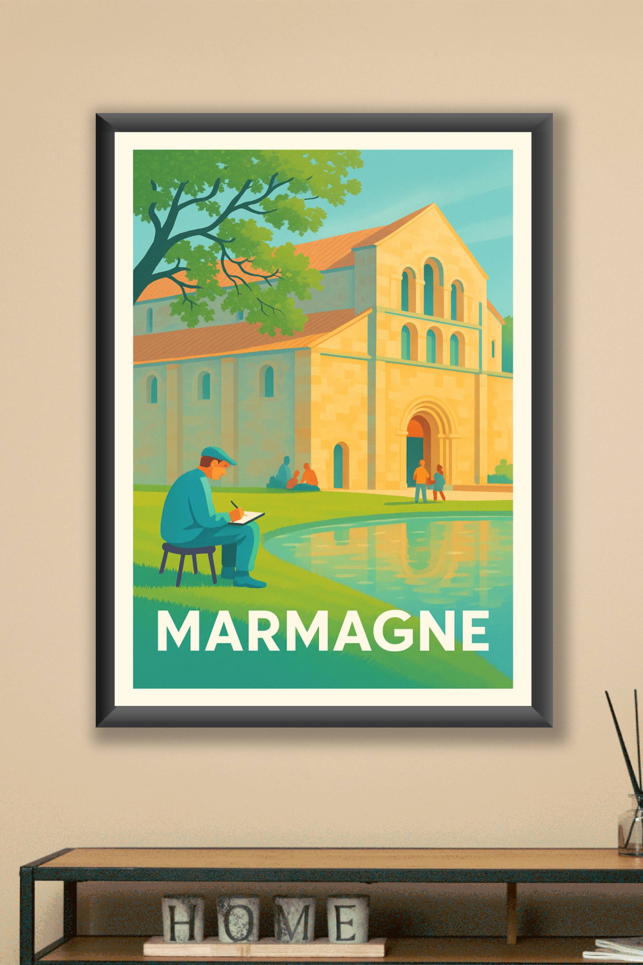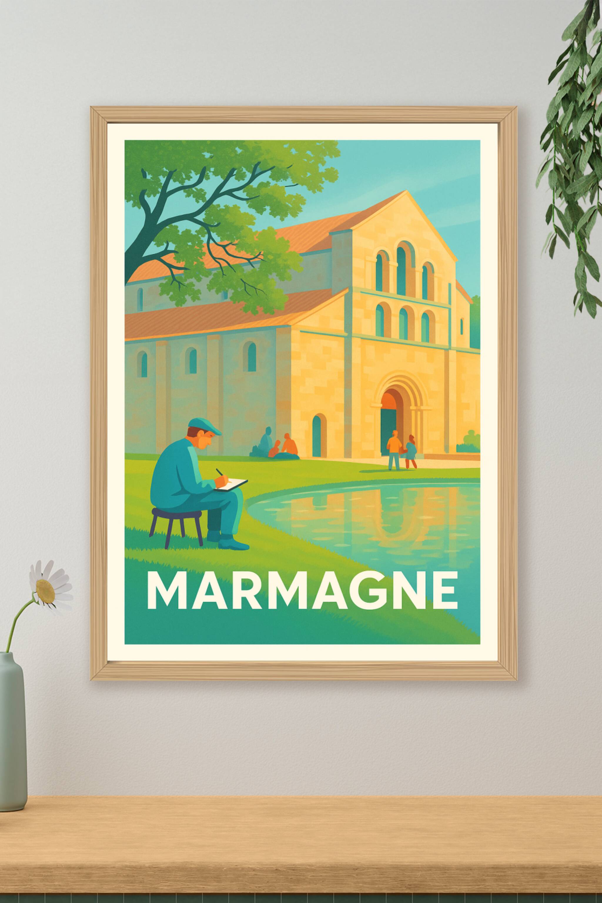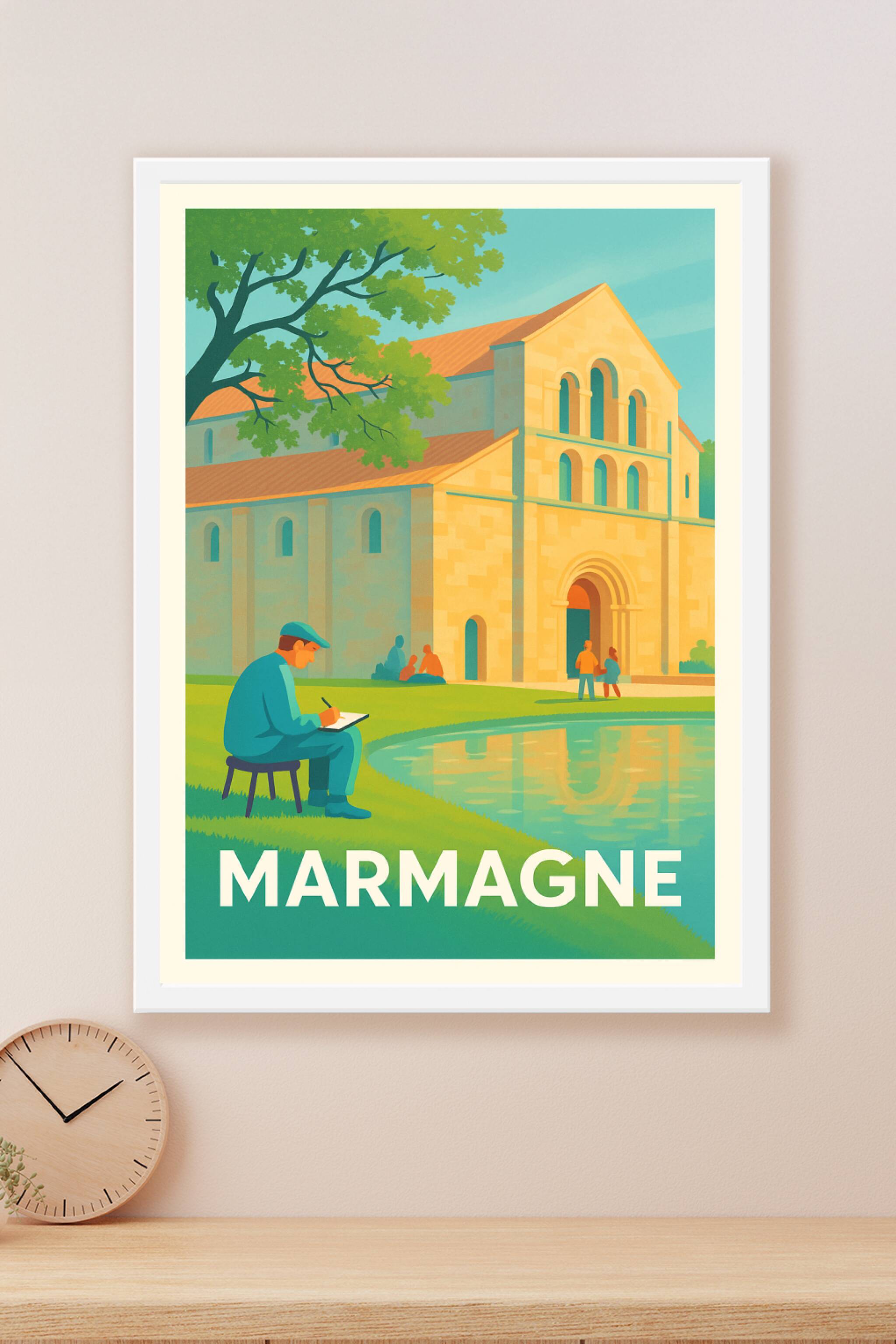 Découvrez l'élégance intemporelle de Marmagne avec cette affiche illustrée mettant en avant son architecture harmonieuse et son cadre naturel apais...