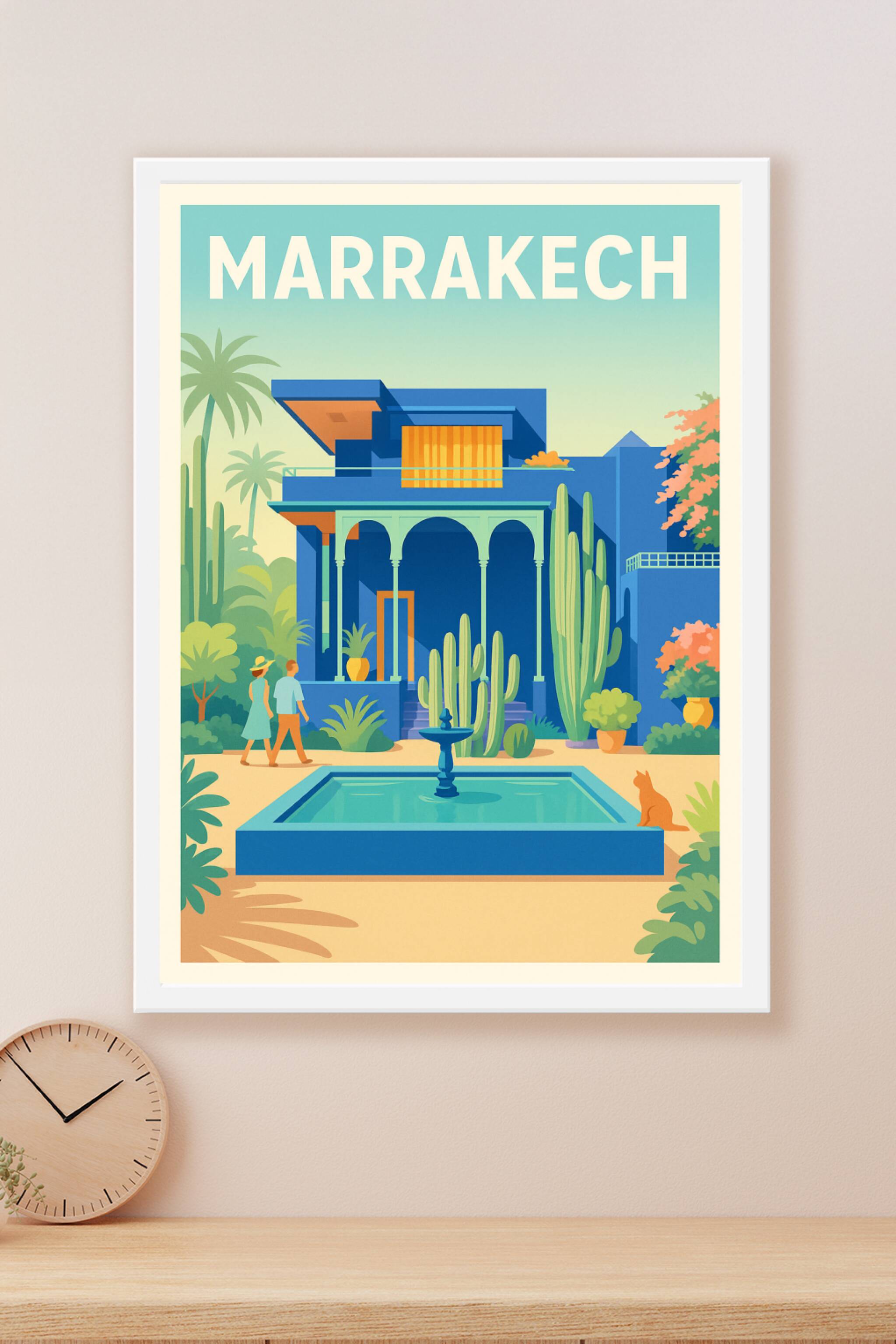 Découvrez l'élégance colorée de Marrakech avec cette affiche inspirée du célèbre Jardin Majorelle. Ce poster au style graphique met en lumière l'architecture bleu vif entourée de cactus, d'une fontaine apaisante et d'une végétation luxuriante, pour une ambiance chaleureuse et dépaysante. Imprimée en tirage "Fine Art" sur papier 305g coton, cette affiche garantit une qualité d'impression exceptionnelle et des couleurs éclatantes. Disponible en formats A1 à A4, avec ou sans cadre, ce poster s'intègre parfaitement à votre décoration intérieure, apportant une touche d'exotisme et de lumière à votre espace. Profitez d'un produit 100% fabriqué en France, idéal pour offrir ou sublimer votre intérieur avec une touche marocaine raffinée.