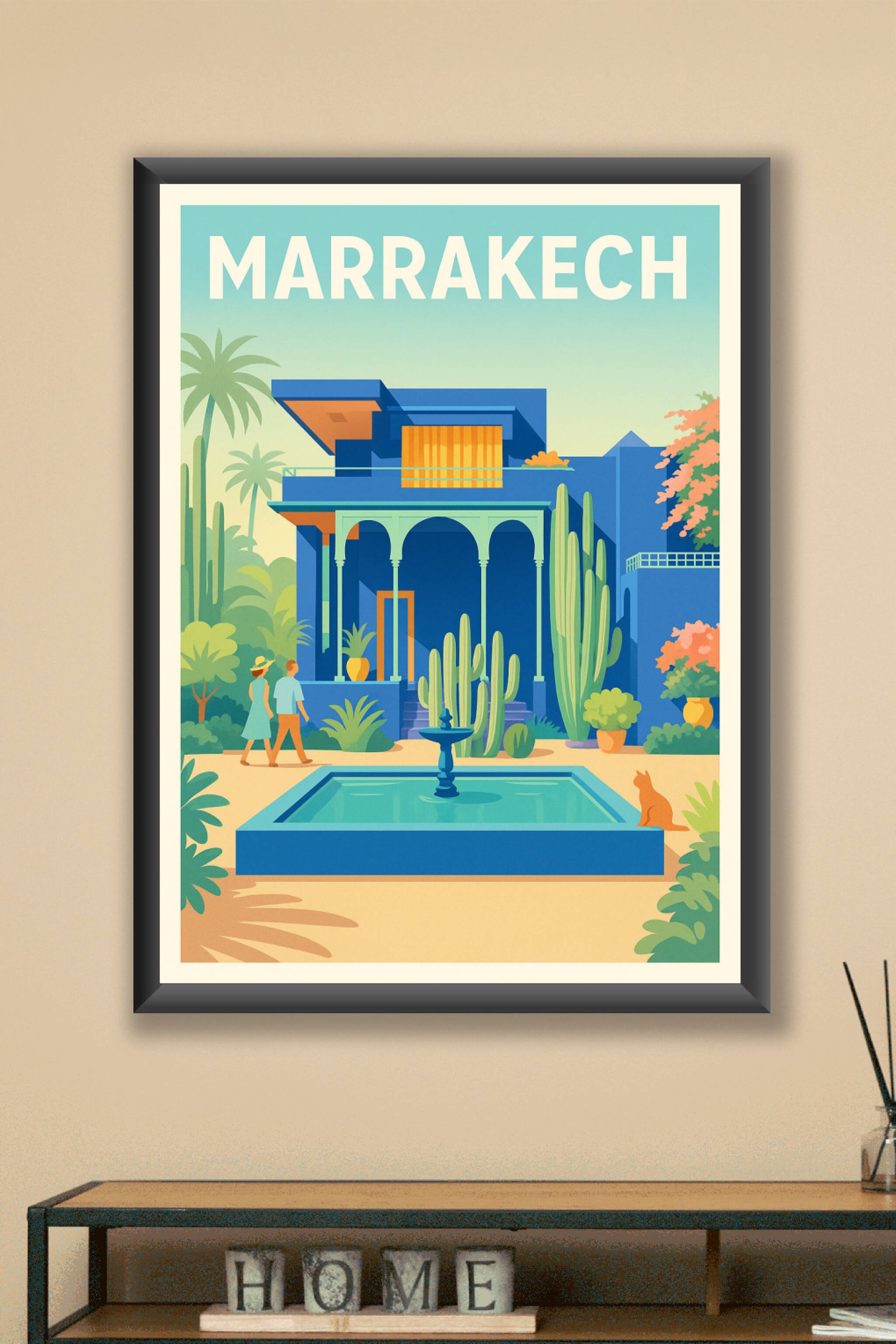 Découvrez l'élégance colorée de Marrakech avec cette affiche inspirée du célèbre Jardin Majorelle. Ce poster au style graphique met en lumière l'ar...
