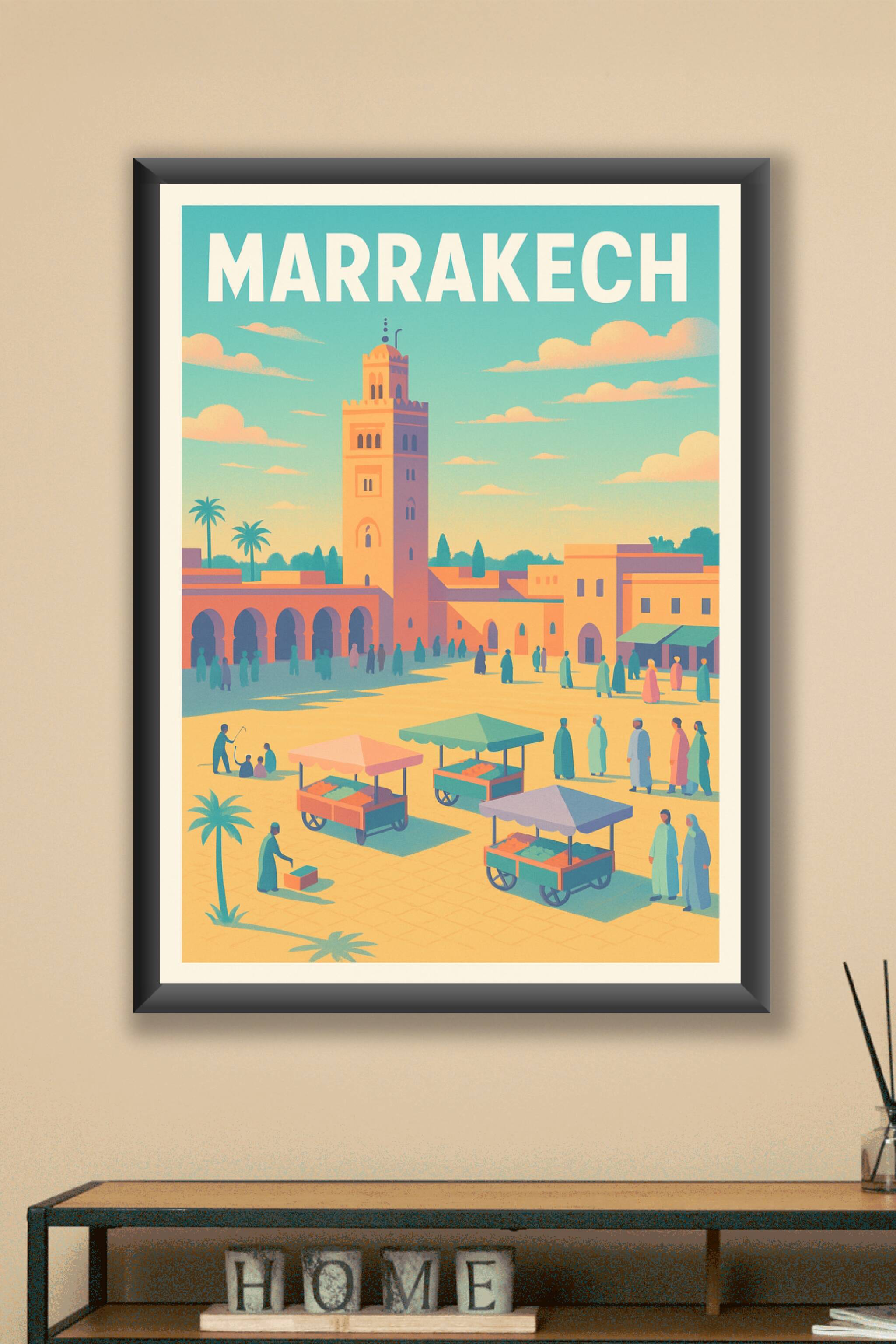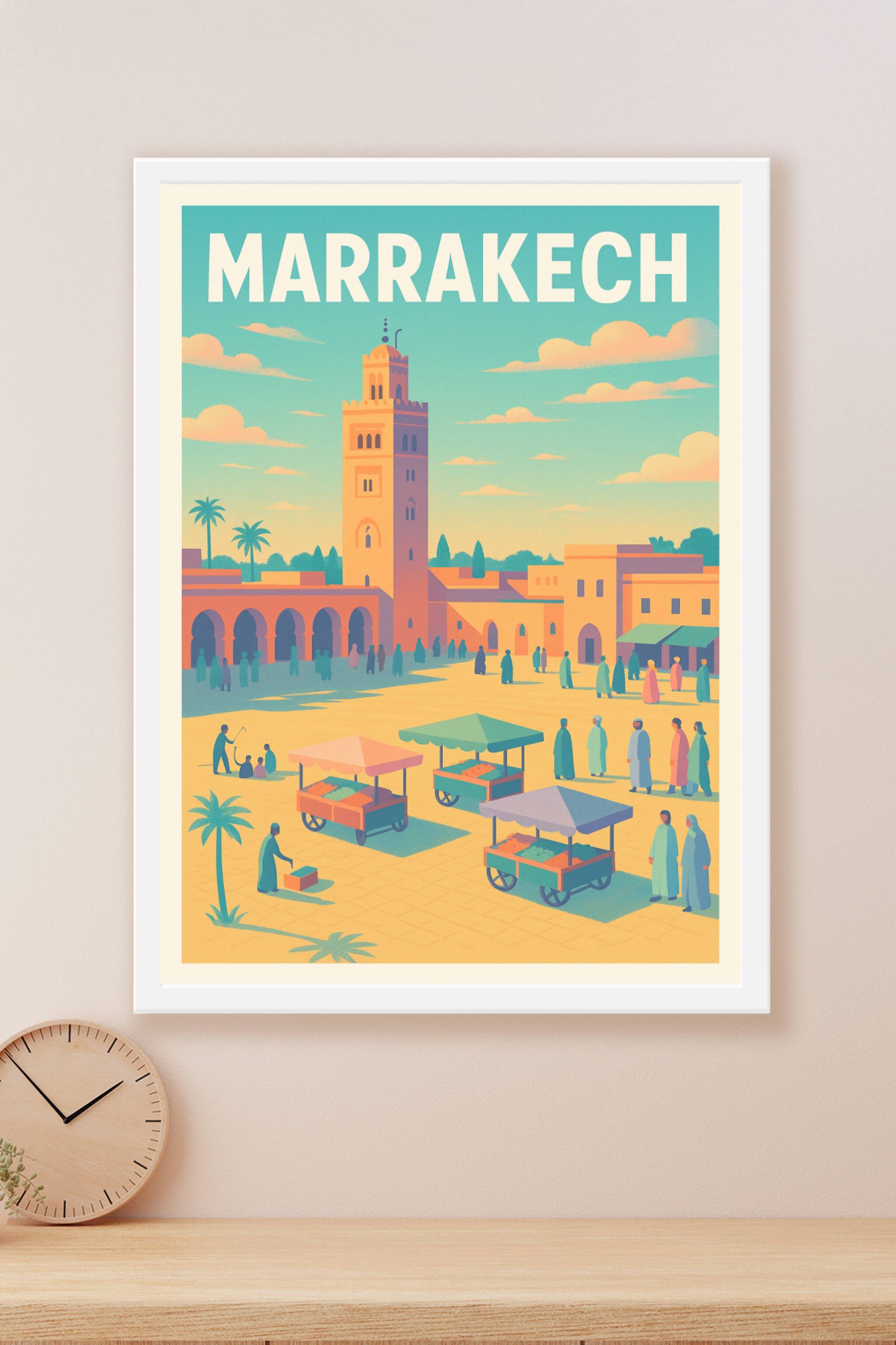 Découvrez la magie de Marrakech à travers cette affiche évoquant l'effervescence colorée des marchés traditionnels et l'architecture emblématique d...
