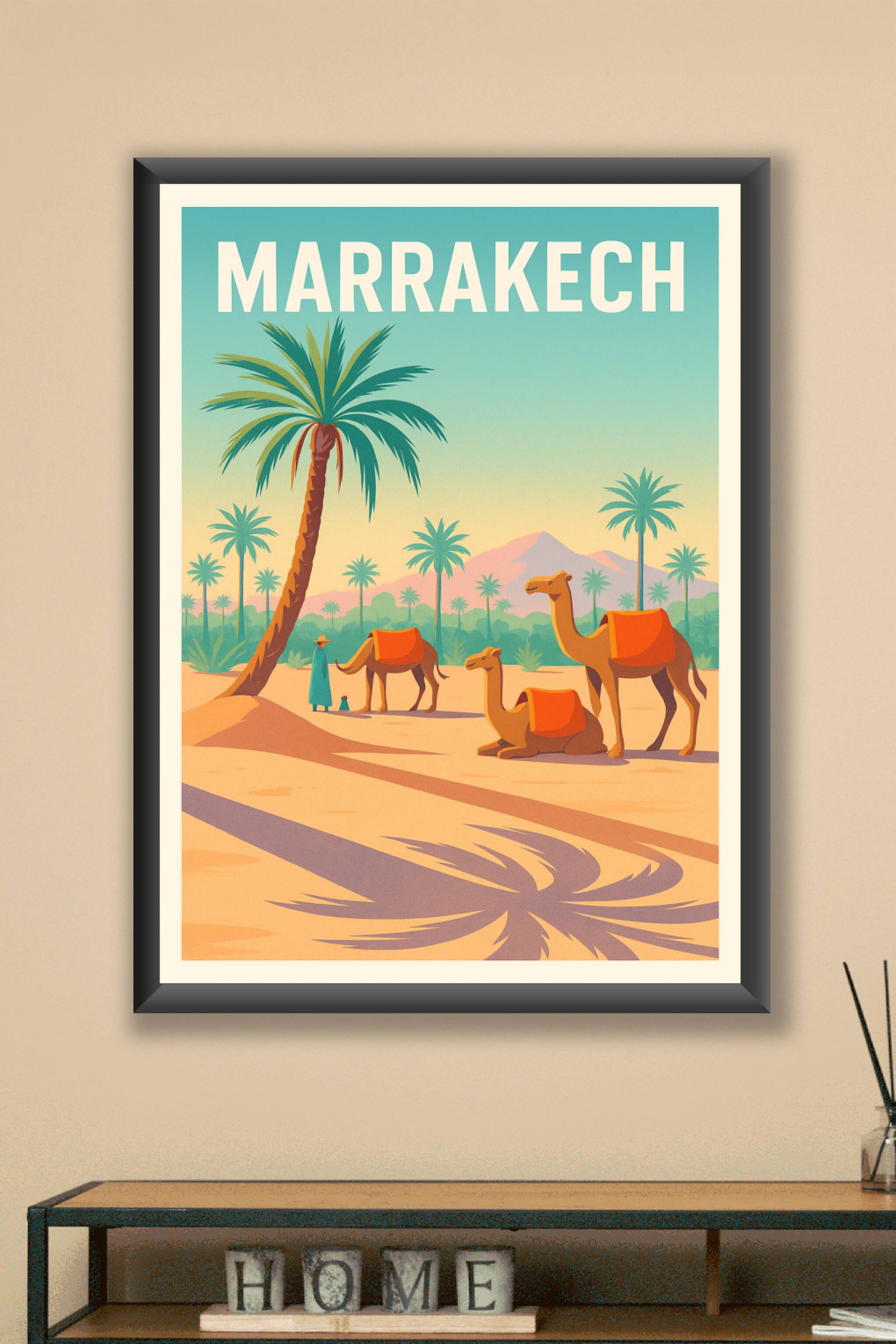 Découvrez la magie de Marrakech avec cette affiche vintage illustrant un paysage typique du désert marocain, où les palmiers majestueux côtoient le...