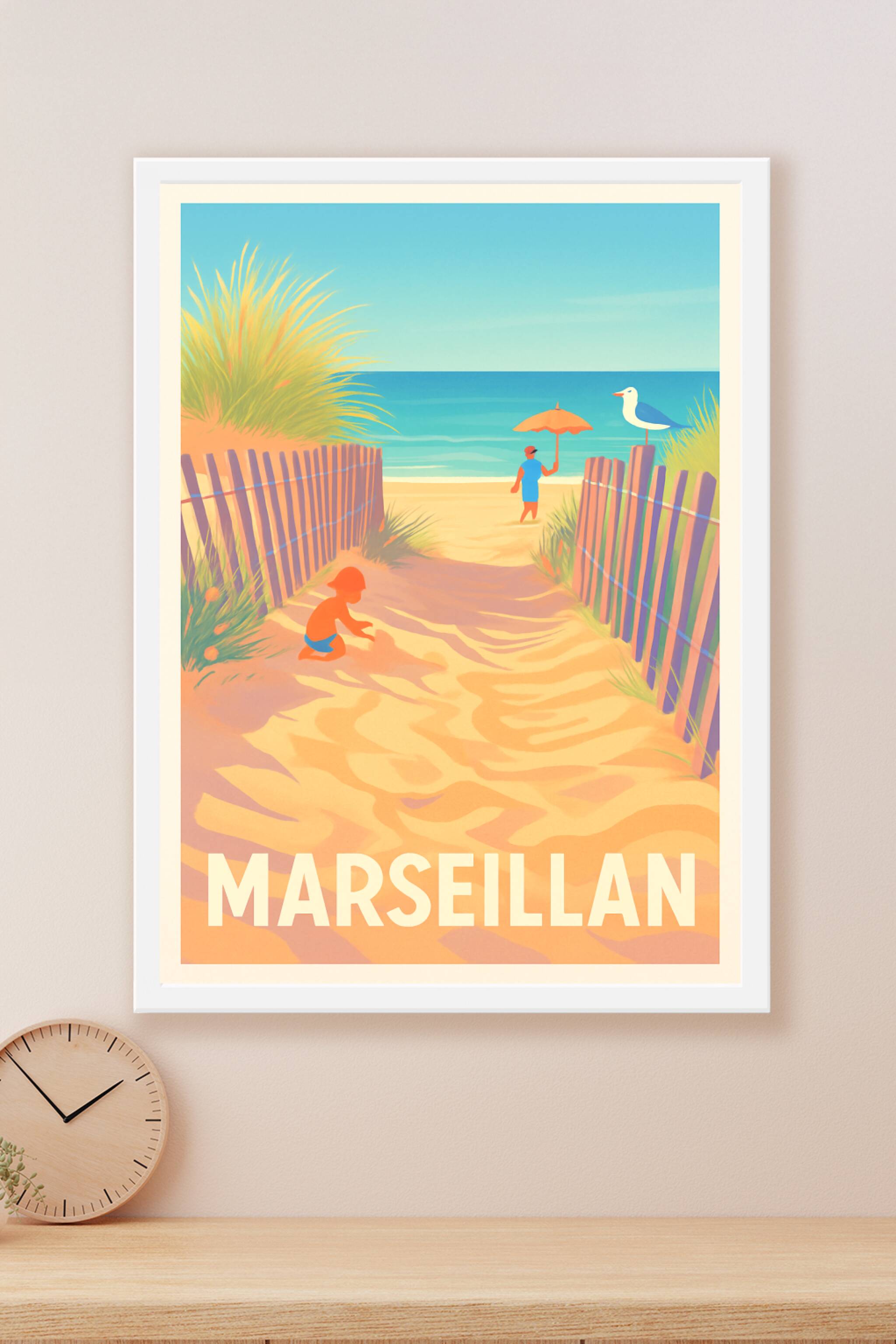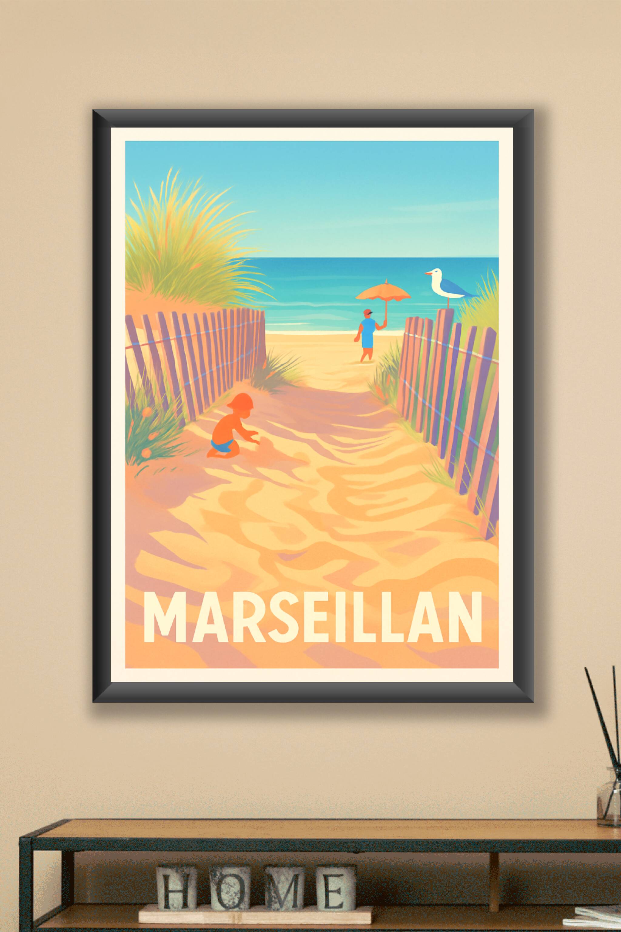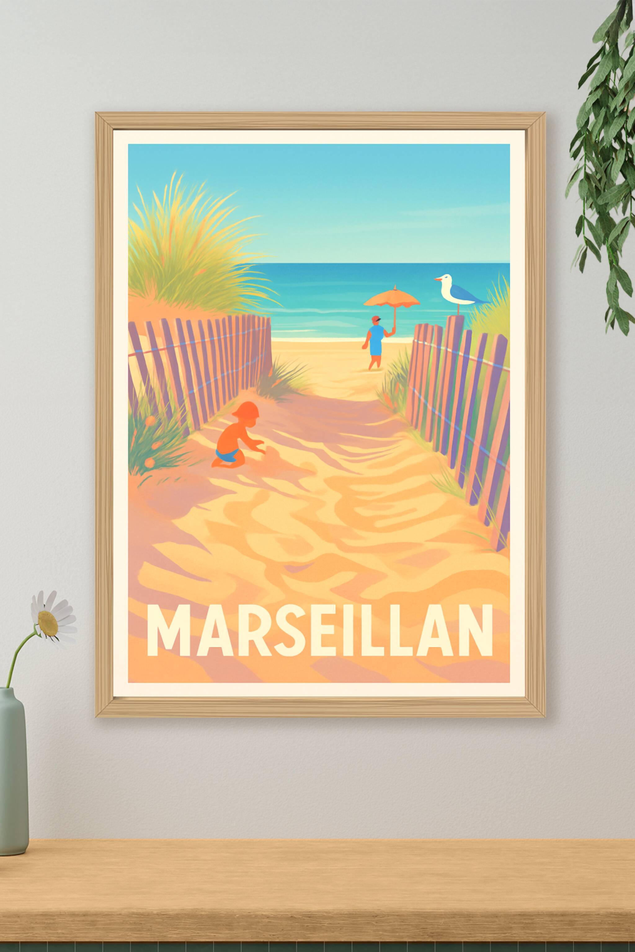 Découvrez la tranquillité et la douceur de vivre en bord de mer avec cette affiche illustrée représentant l'entrée de la plage de Marseillan, sous ...
