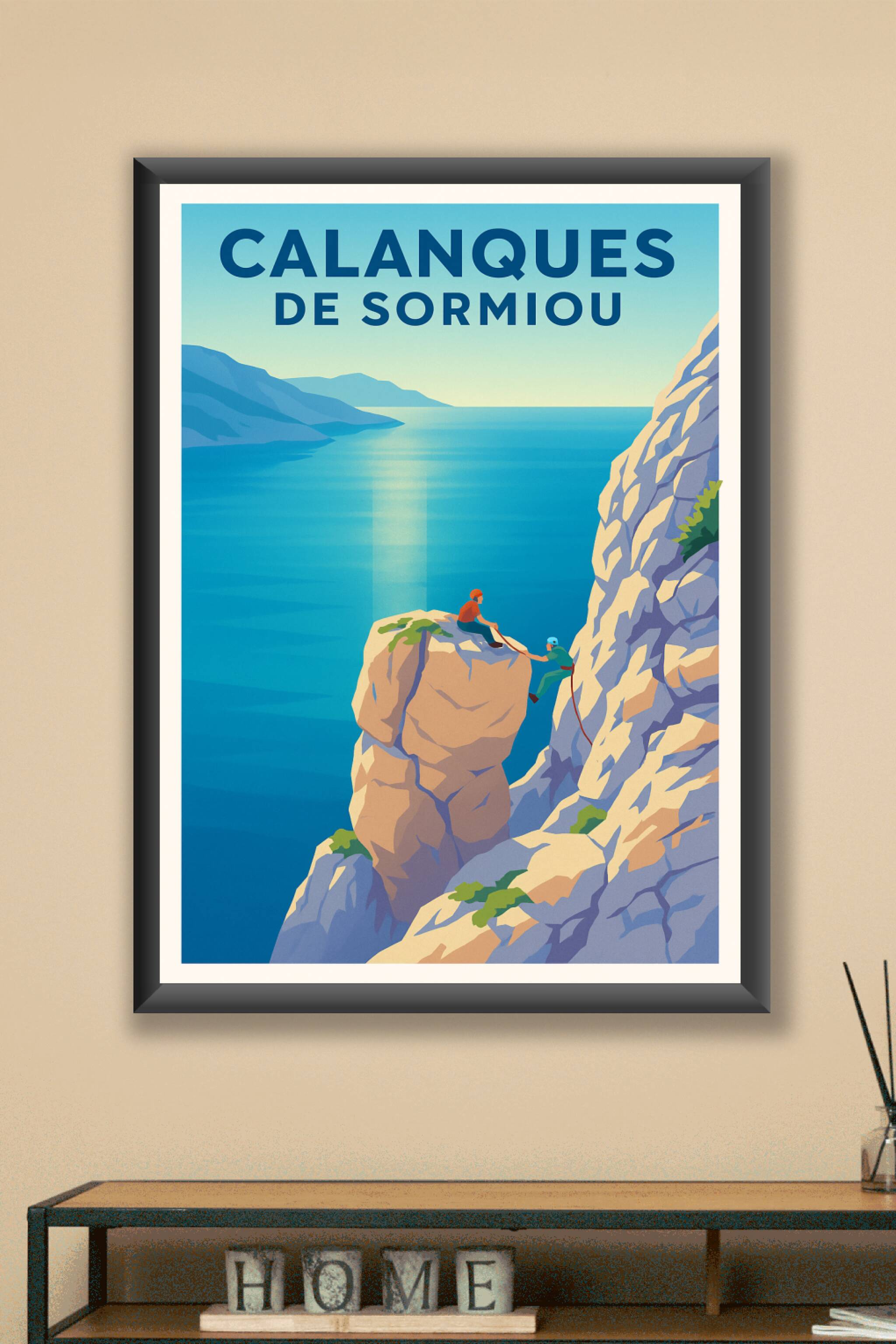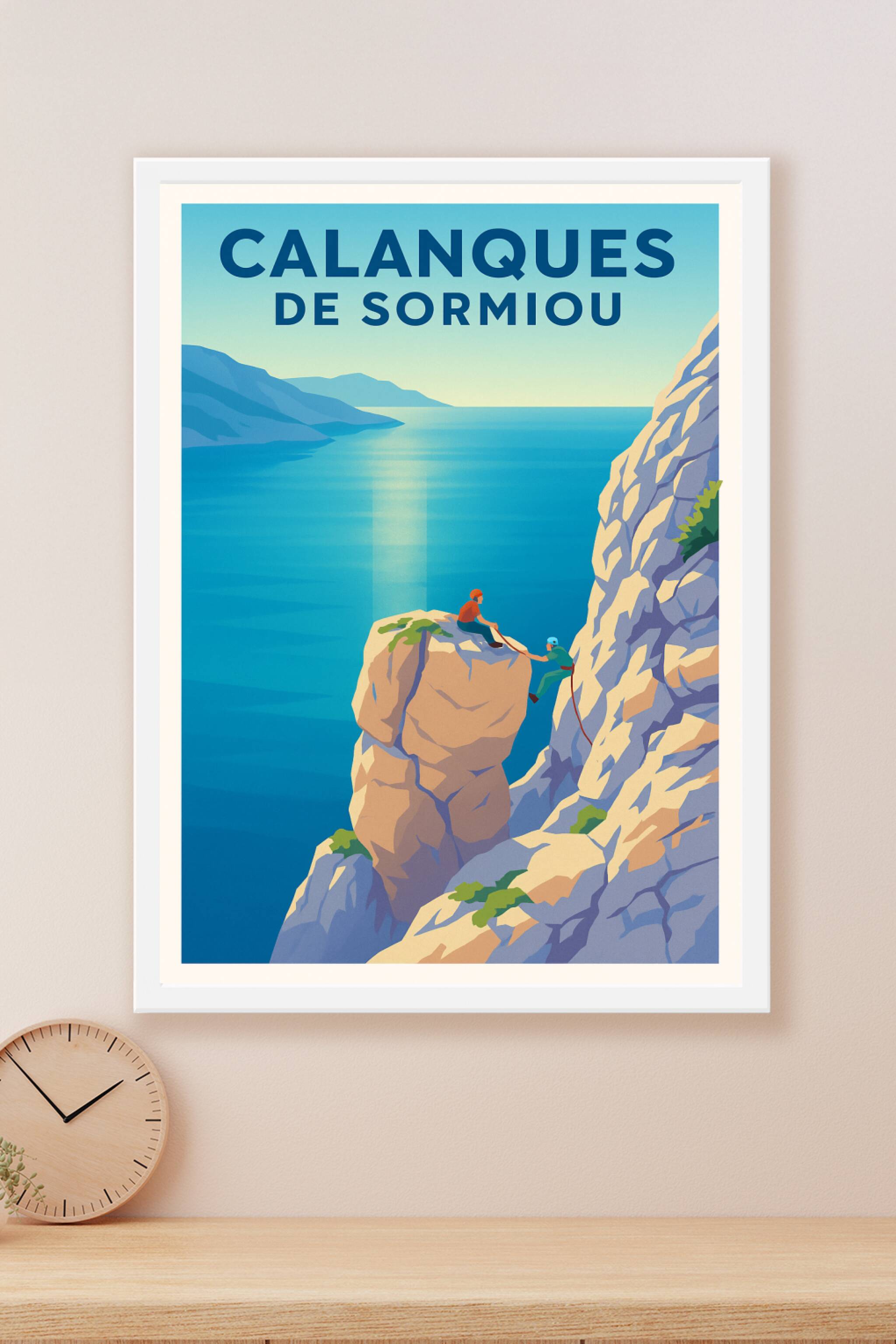Découvrez la beauté spectaculaire des Calanques de Sormiou avec cette affiche artistique inspirante représentant l'esprit d'aventure et la nature s...
