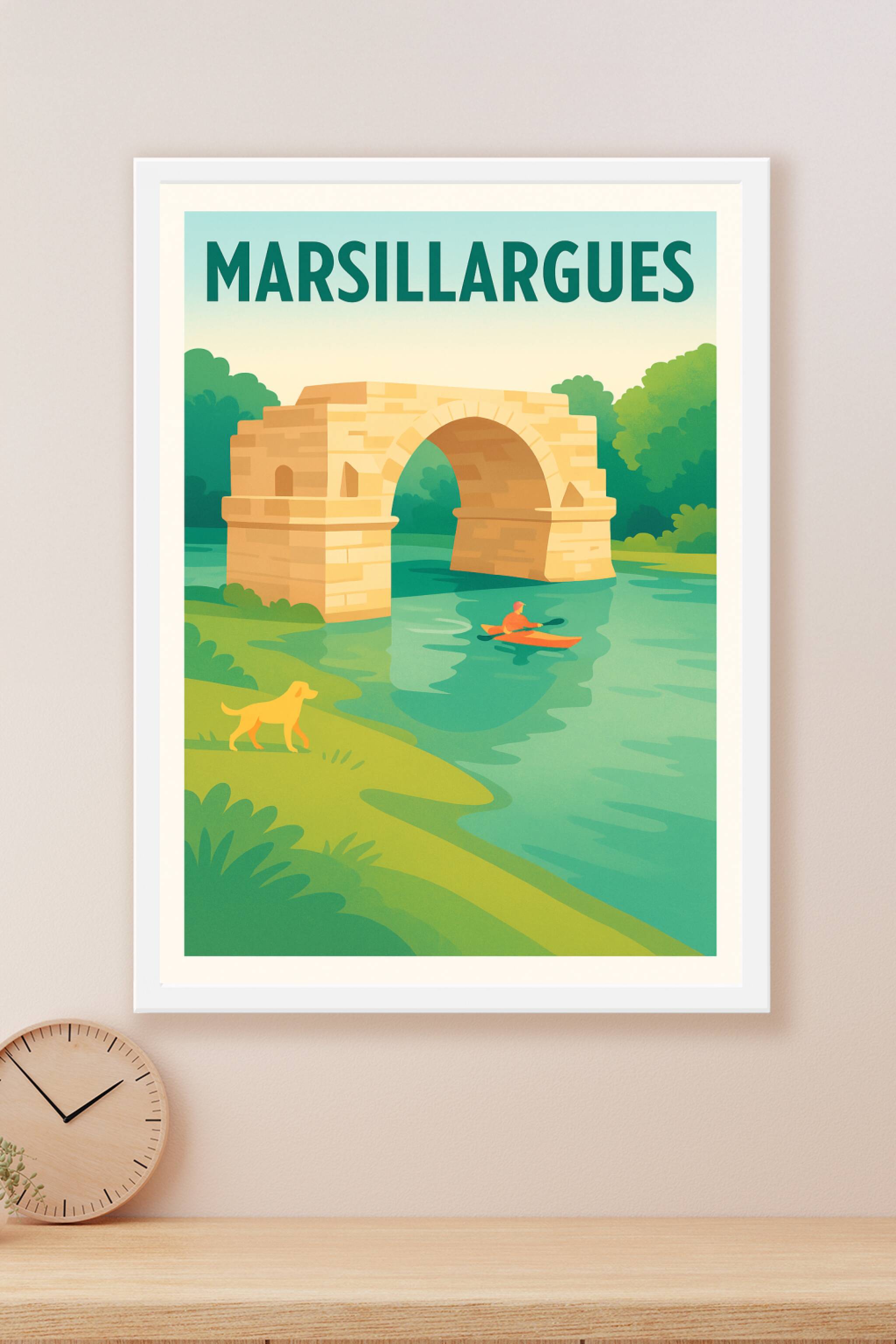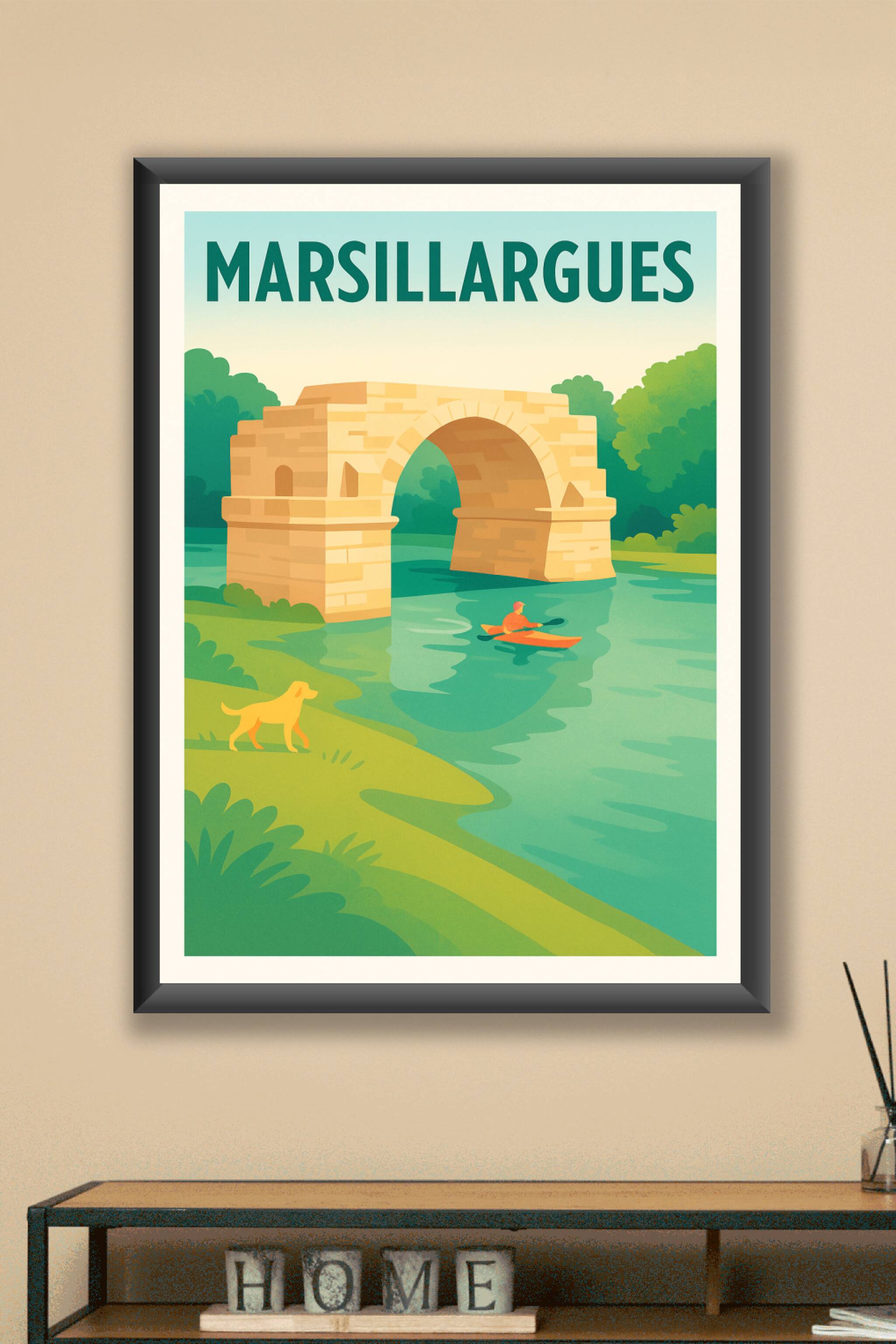 Découvrez le charme paisible de Marsillargues avec cette affiche illustrée, mettant en scène un pont en pierre sur une rivière tranquille, survolé ...
