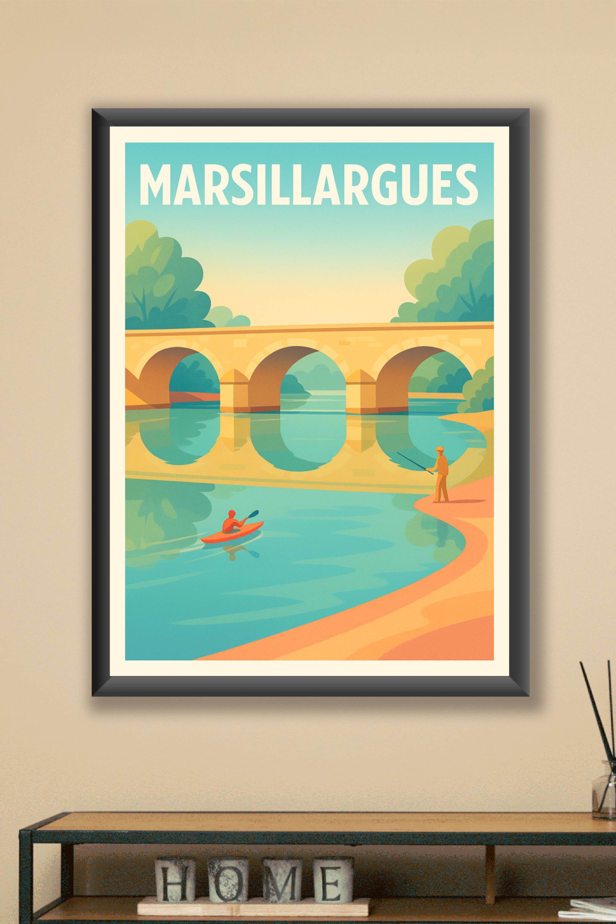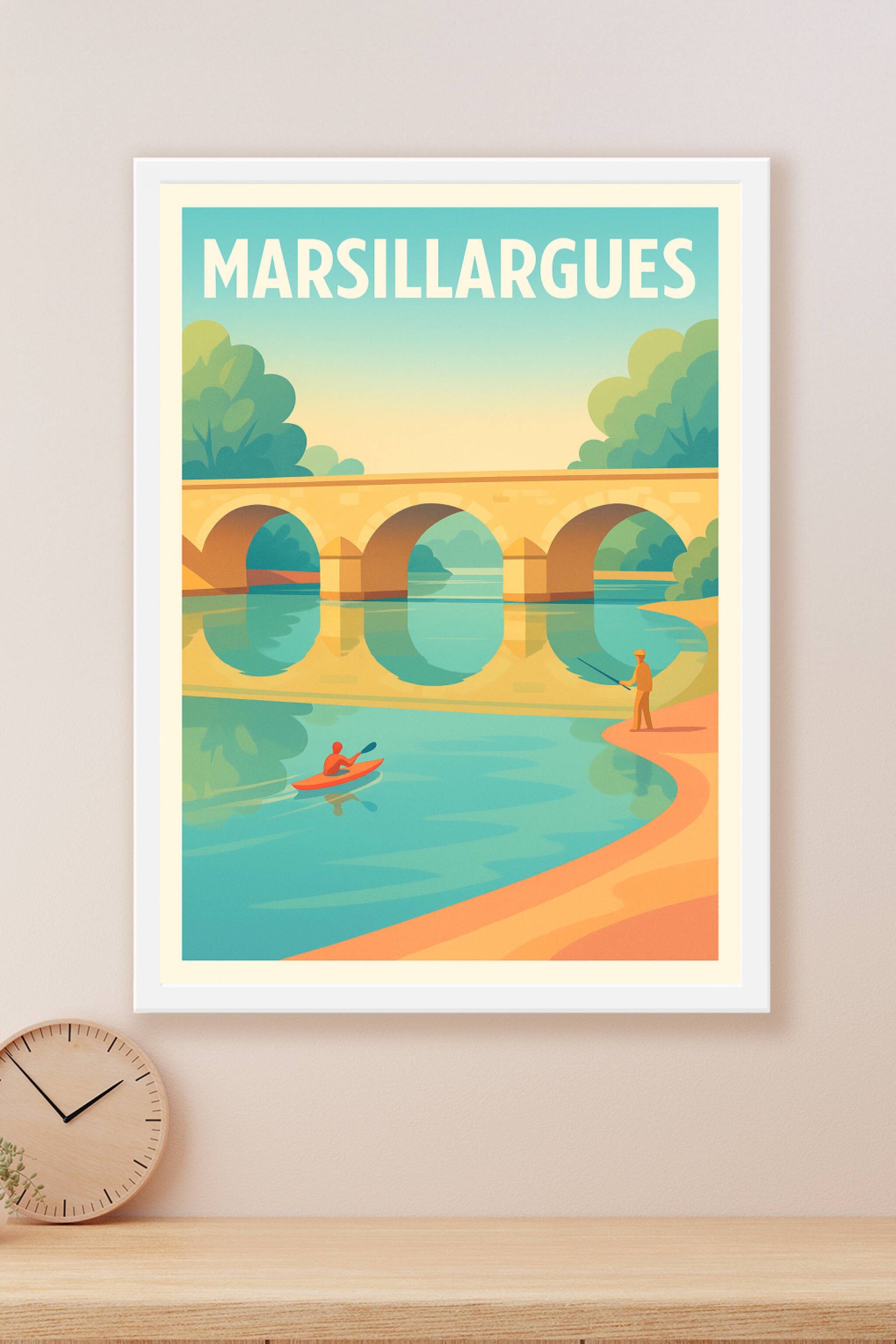 Découvrez l'élégance paisible de Marsillargues à travers cette affiche illustrée mettant en scène un pont historique et ses eaux tranquilles où un ...