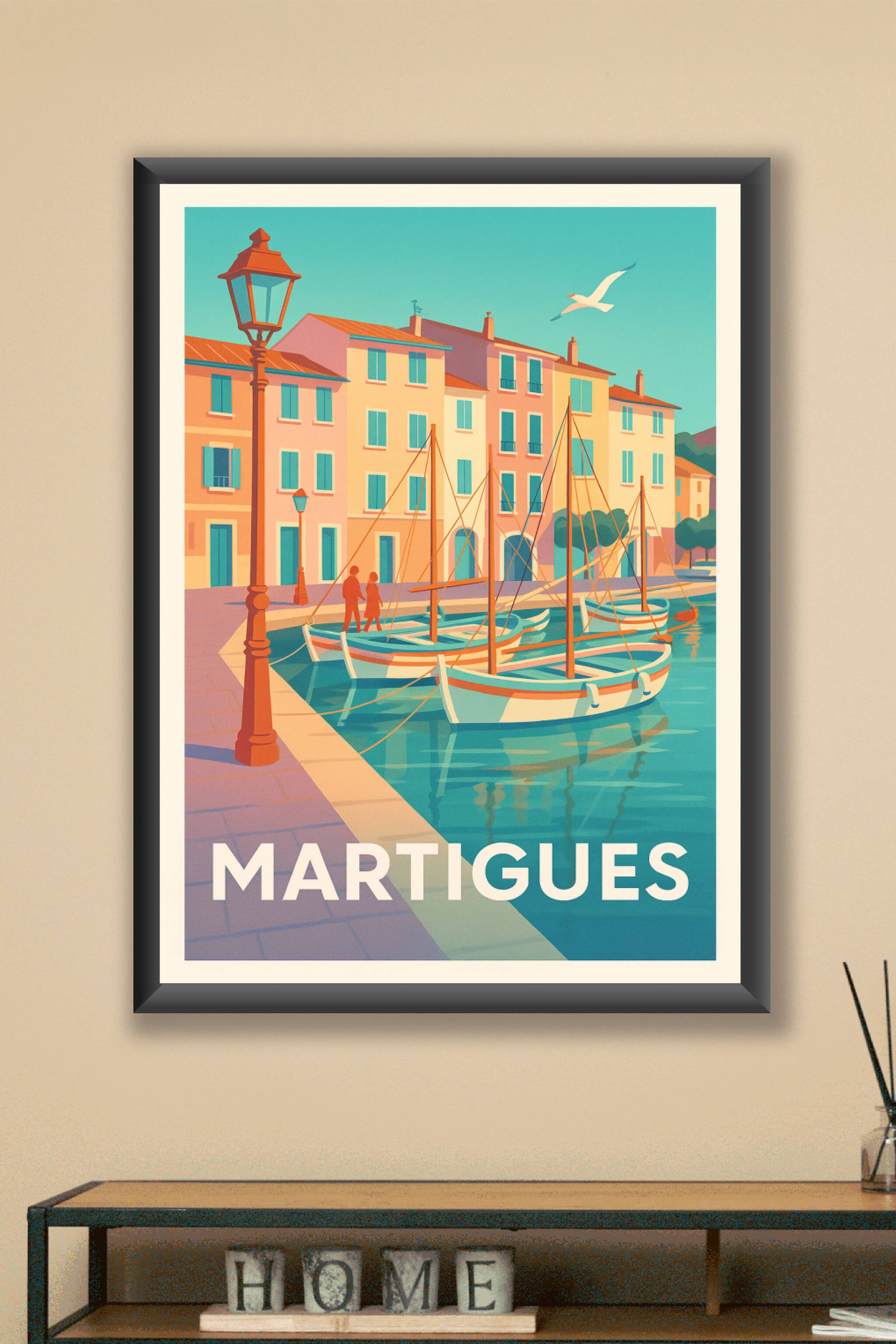 Découvrez l'élégance paisible du port de Martigues avec cette affiche au style rétro coloré qui capture la poésie des bateaux ancrés et des façades...