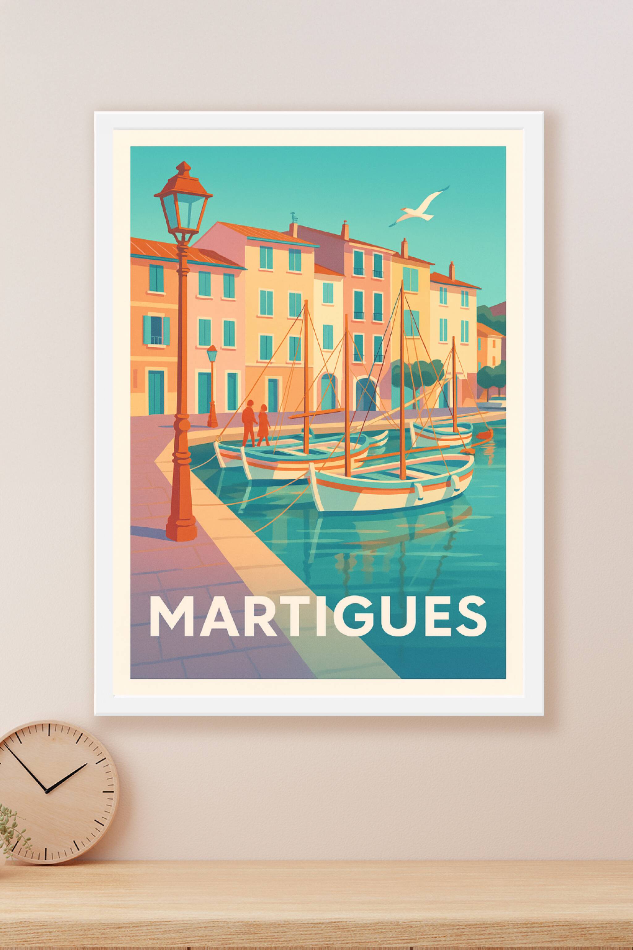 Découvrez l'élégance paisible du port de Martigues avec cette affiche au style rétro coloré qui capture la poésie des bateaux ancrés et des façades ensoleillées. Ce poster évoque l'atmosphère chaleureuse d'une promenade au bord de l'eau sous un ciel limpide.Ce tirage "Fine Art" est réalisé sur papier 305g coton pour une qualité d'impression exceptionnelle, garantissant des couleurs riches et des détails nets. Disponible en formats A1 à A4, avec ou sans cadre, cette affiche est idéale pour sublimer votre intérieur ou offrir un cadeau raffiné aux amoureux de la Provence.L'impression premium, 100% fabriquée en France, assure la durabilité et l'esthétique de votre poster Martigues, créant un véritable hommage décoratif à cette charmante ville portuaire.