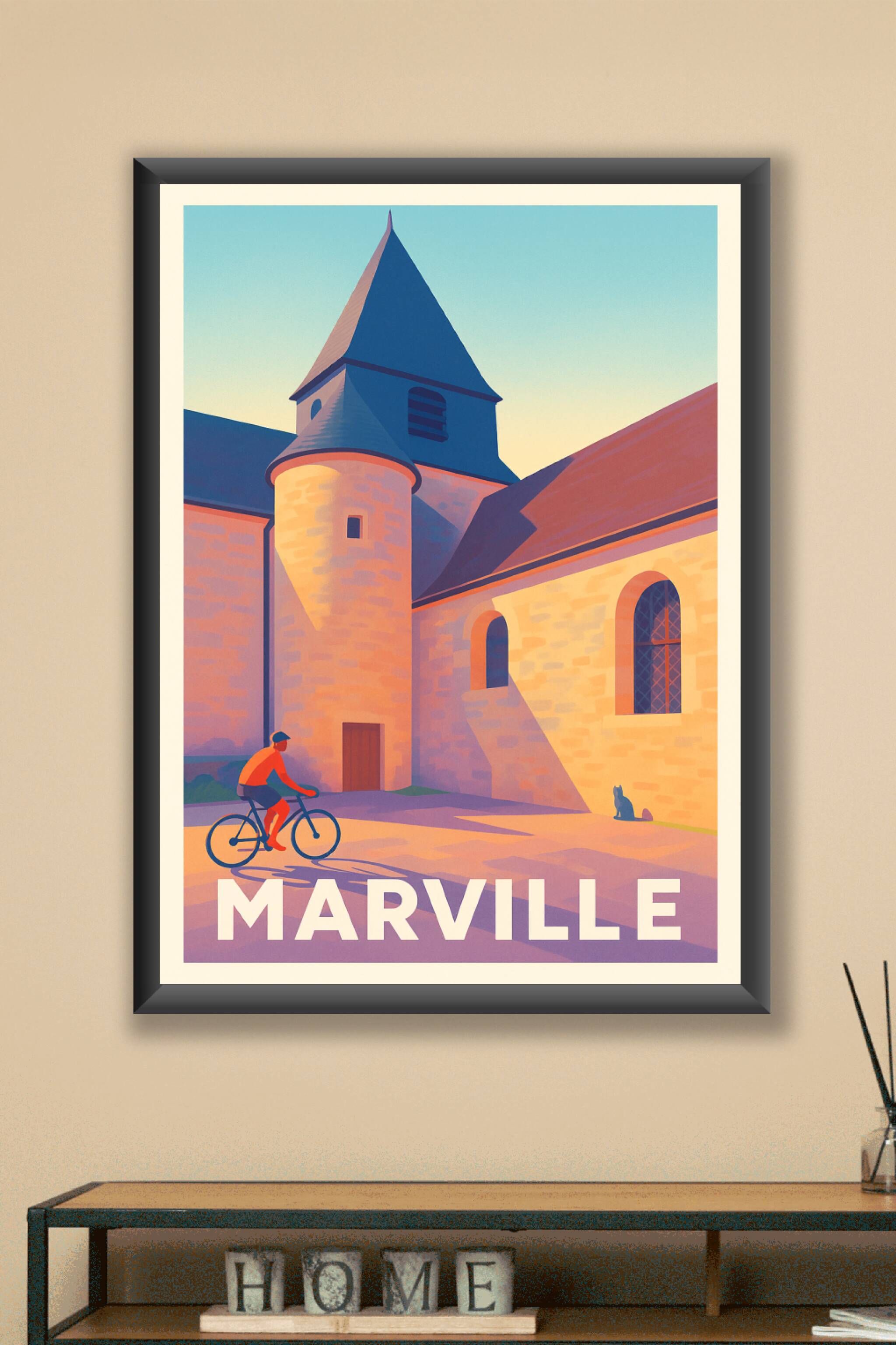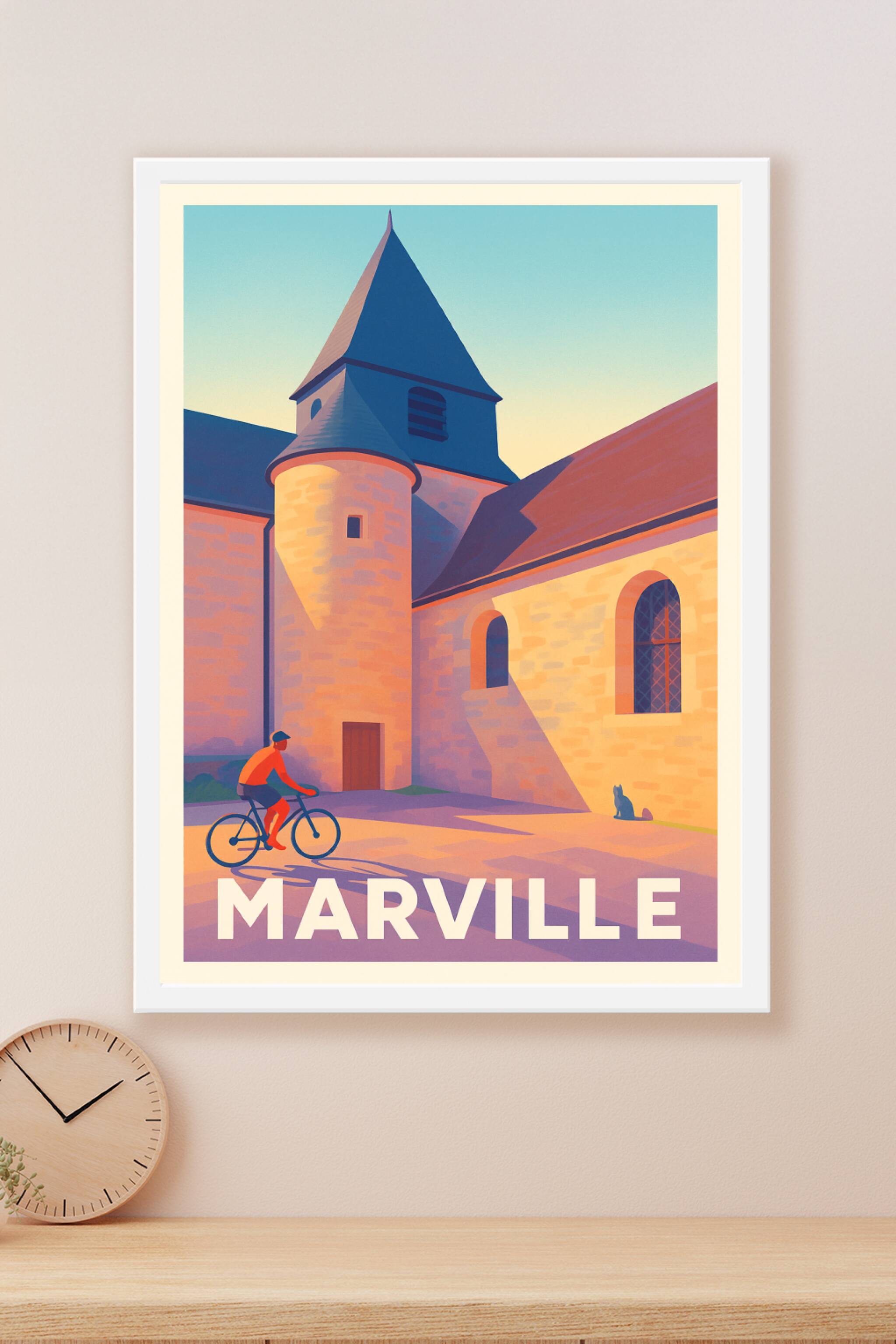 Découvrez l'élégance intemporelle de Marville avec cette affiche illustrée mettant en scène un coin tranquille du village baigné par une douce lumi...