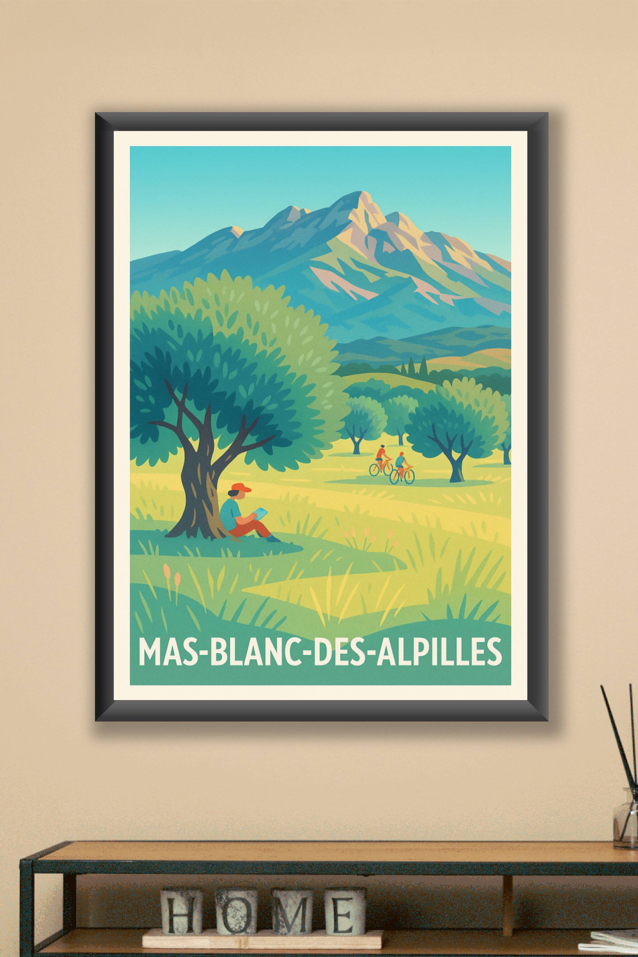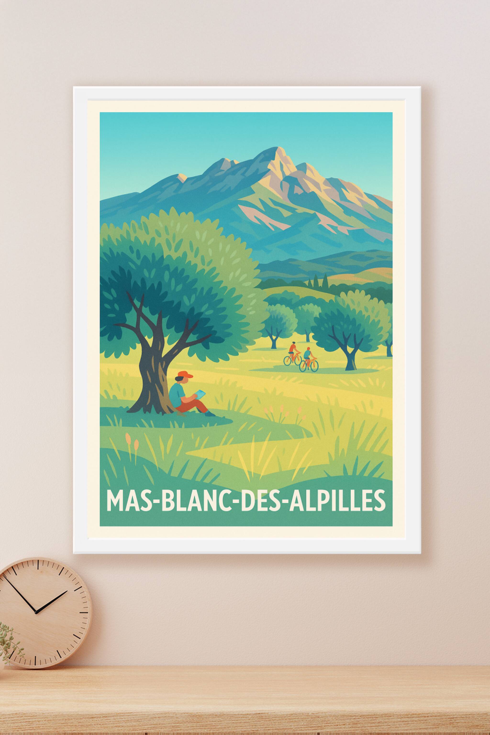 Découvrez la beauté sereine de Mas-Blanc-des-Alpilles avec cette affiche illustrée aux couleurs douces et apaisantes, mettant en scène la montagne ...