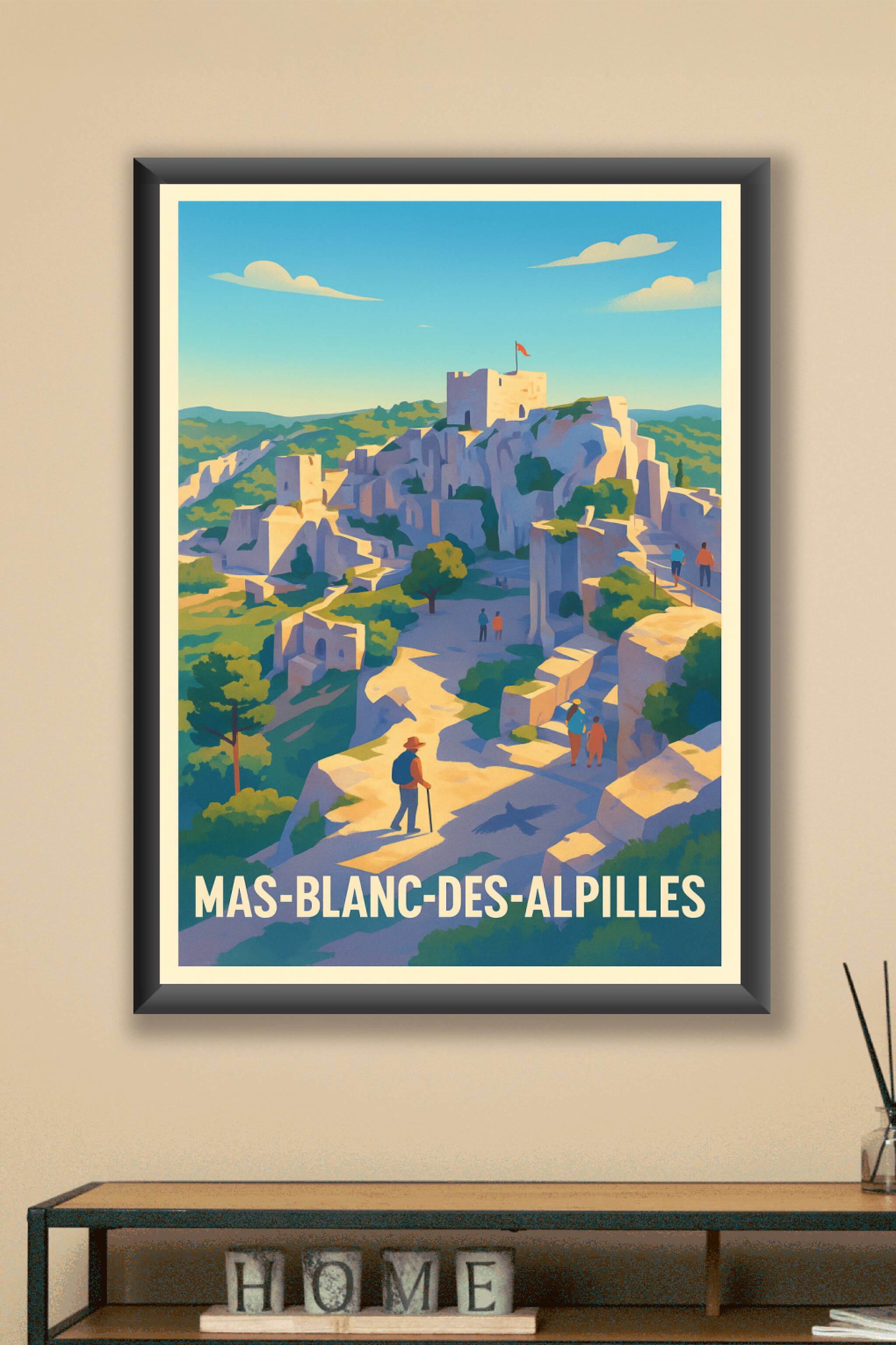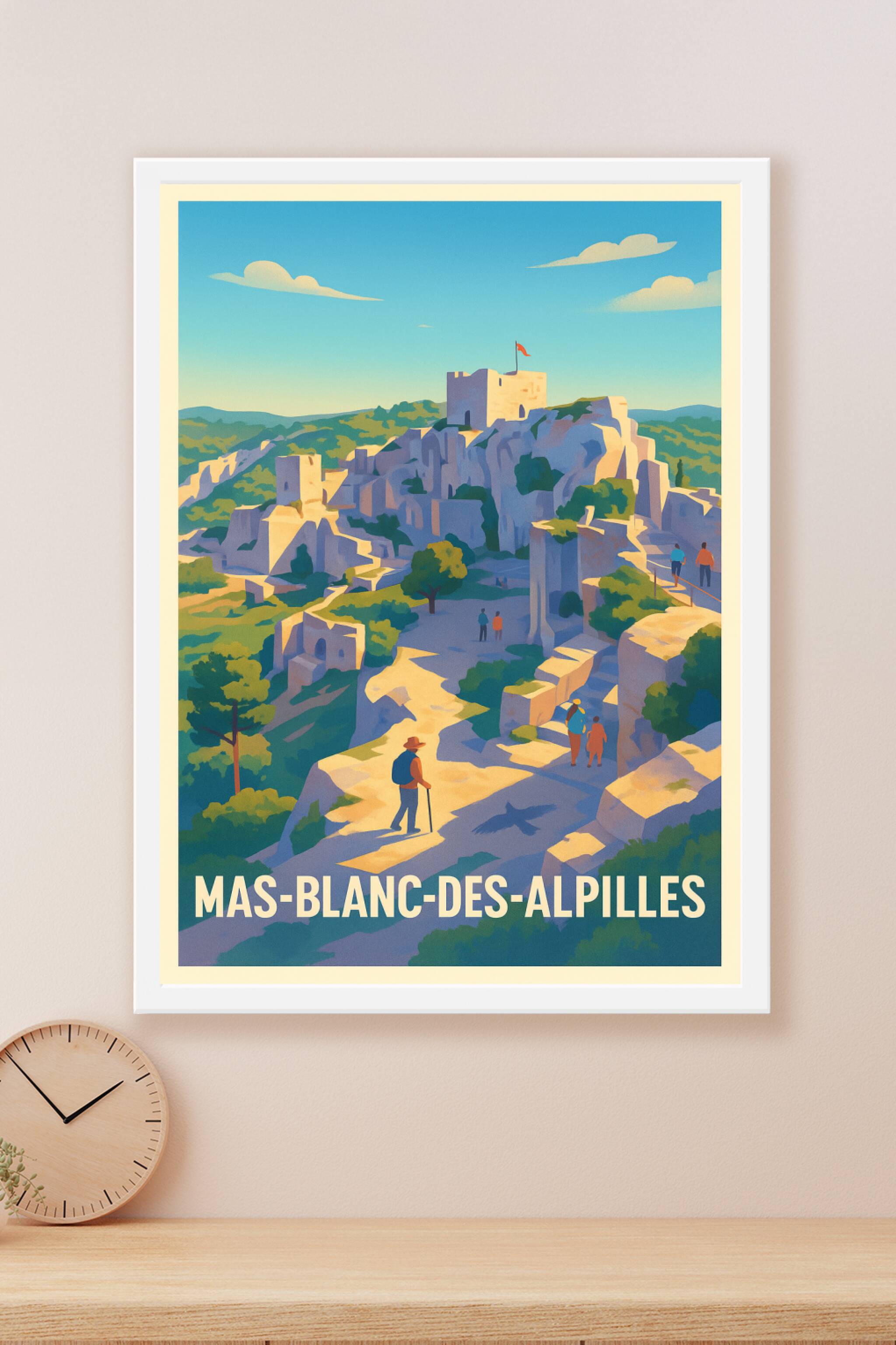 Découvrez le charme unique de Mas-Blanc-des-Alpilles avec cette affiche illustrative captivante représentant les magnifiques ruines perchées au som...