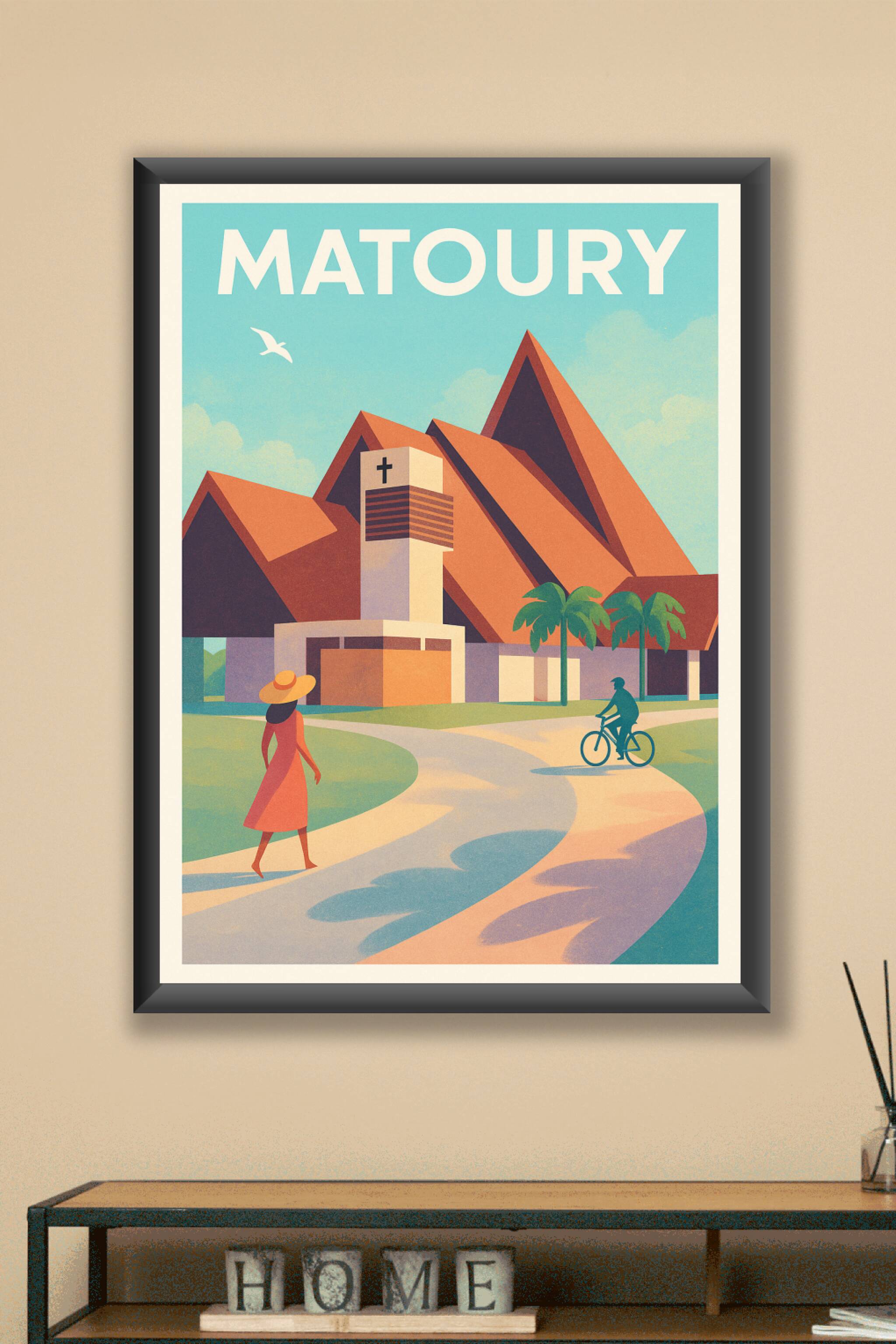 Découvrez cette affiche illustrée représentant l'architecture emblématique de Matoury sous un ciel azur, sublimée par des personnages qui apportent...