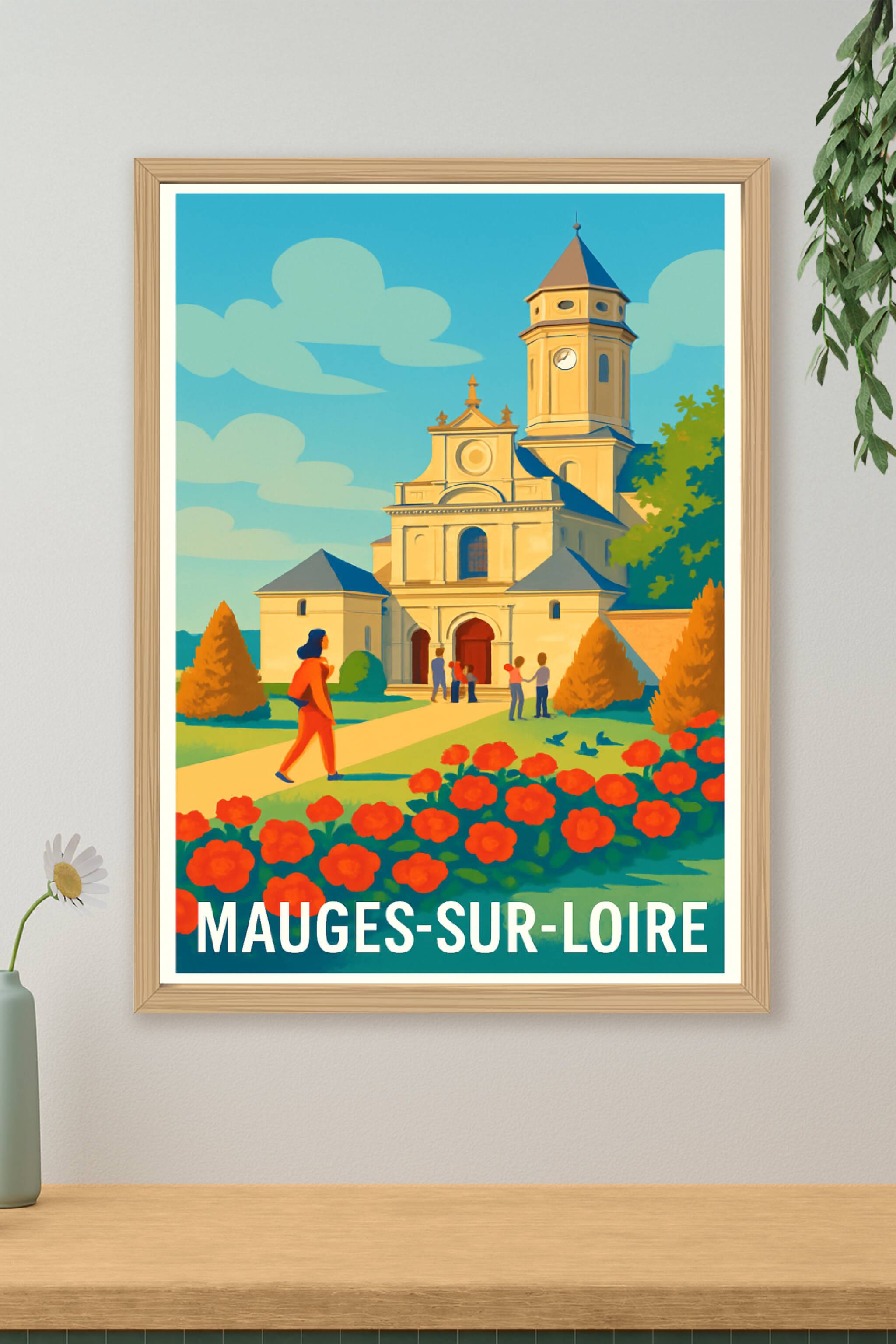 Découvrez la douceur de vivre à Mauges-sur-Loire à travers cette affiche illustrée mettant en avant l'architecture remarquable d'un édifice histori...