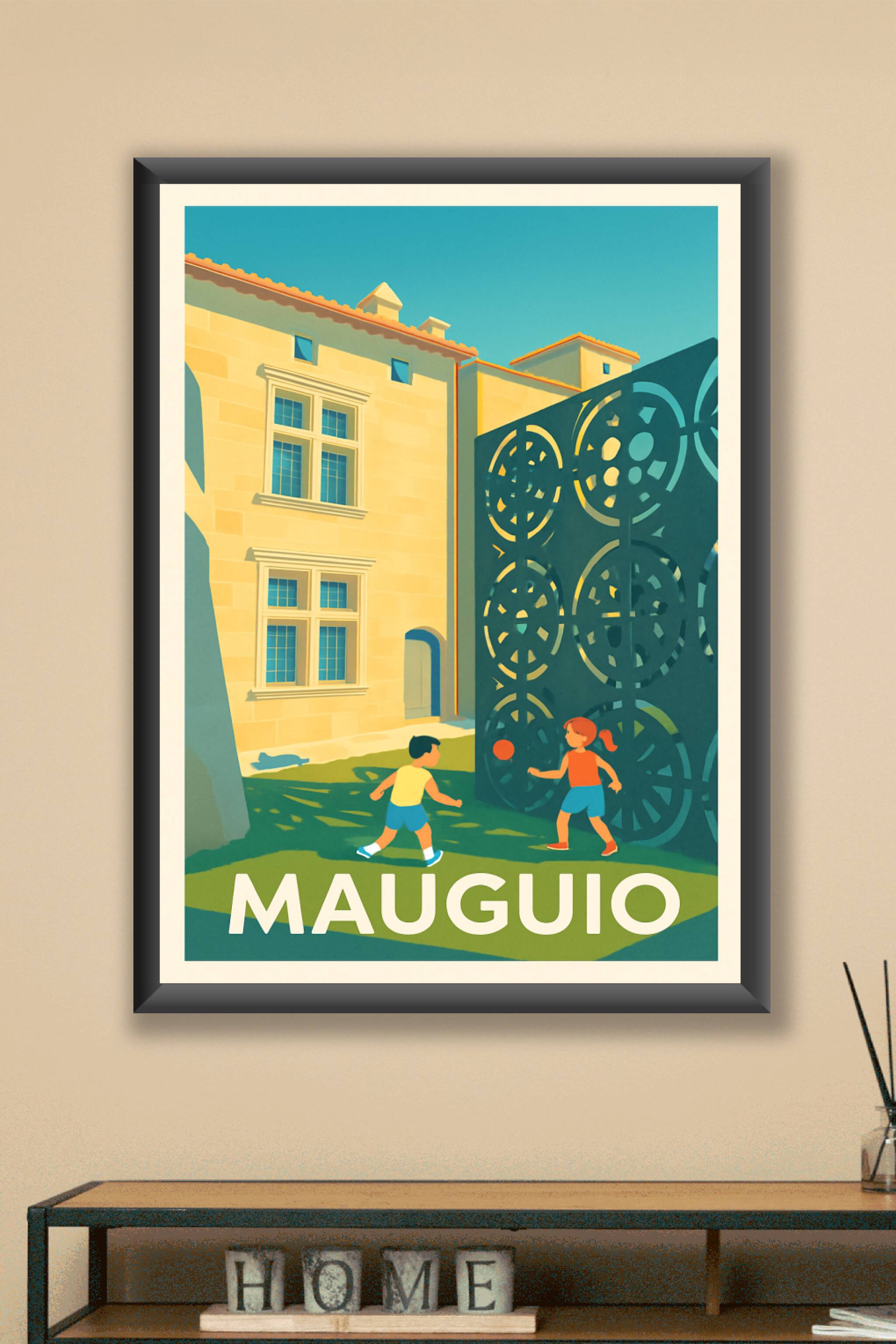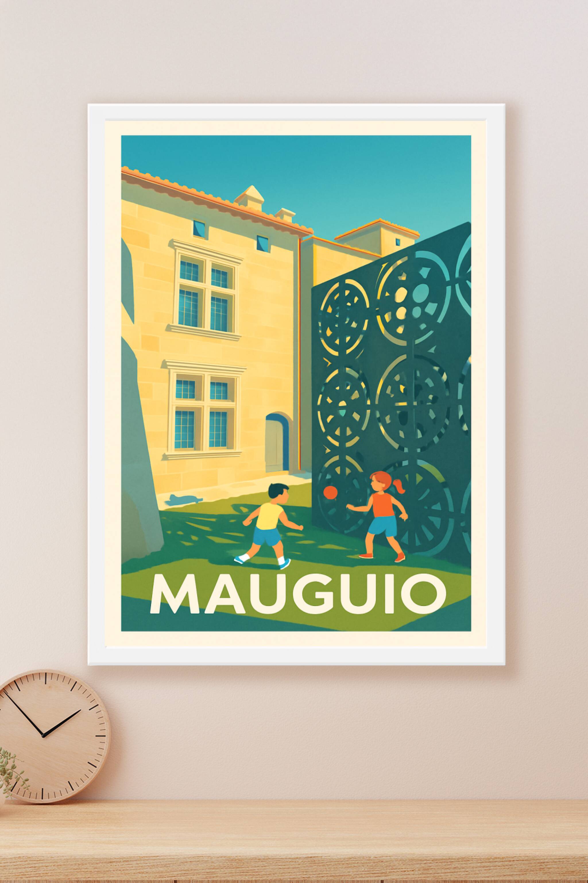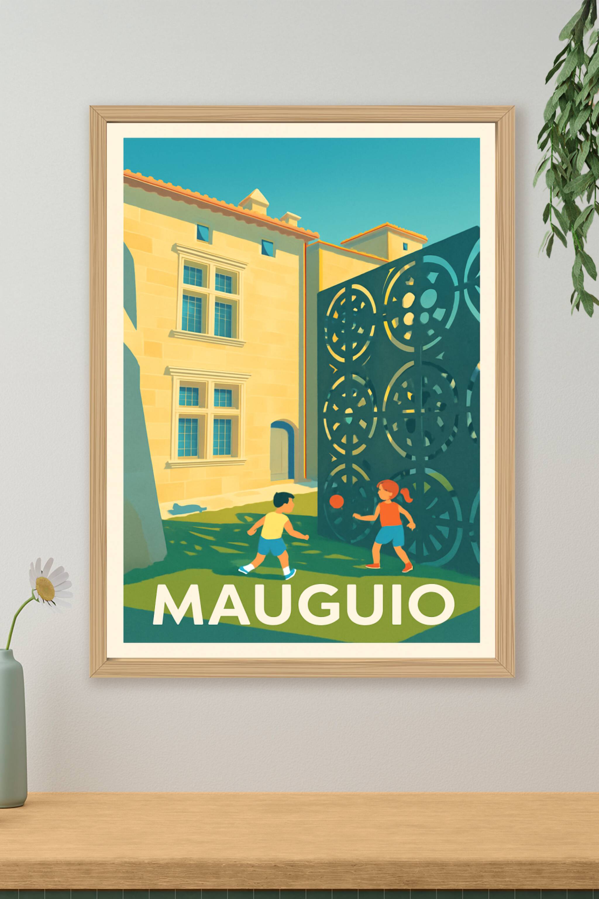 Découvrez la douceur de vivre de Mauguio avec cette affiche vintage qui capture un moment de joie enfantine dans un cadre architectural typique. Ce...