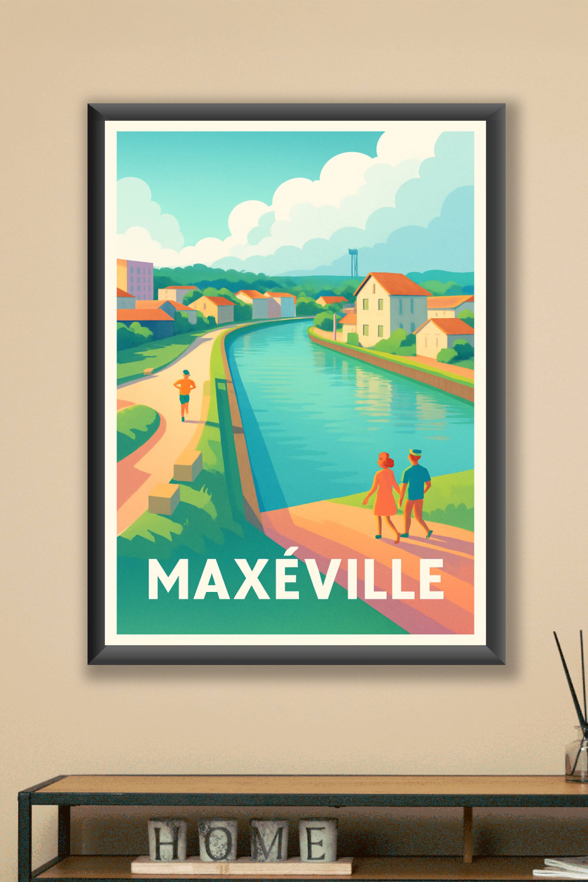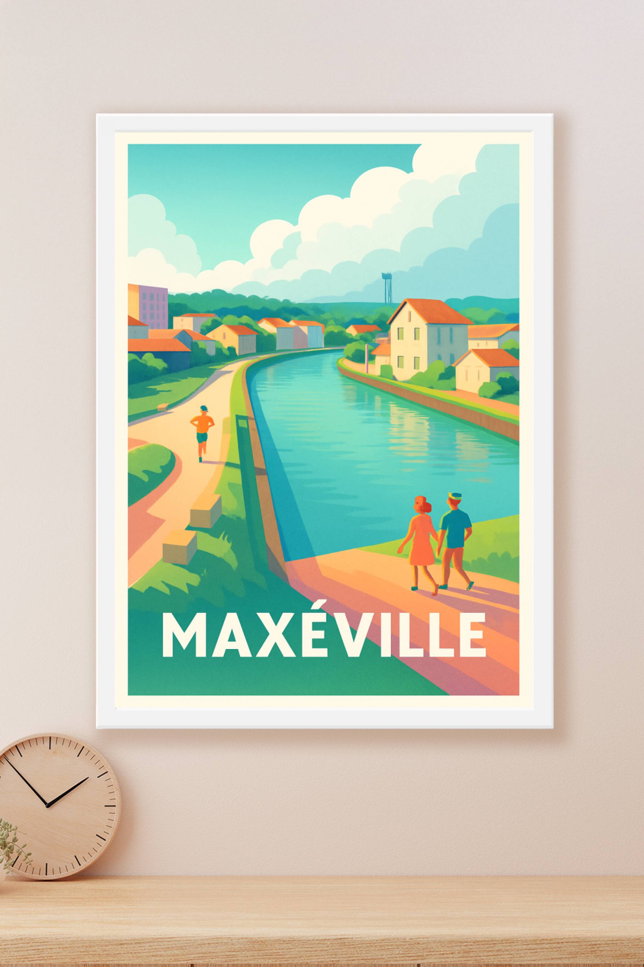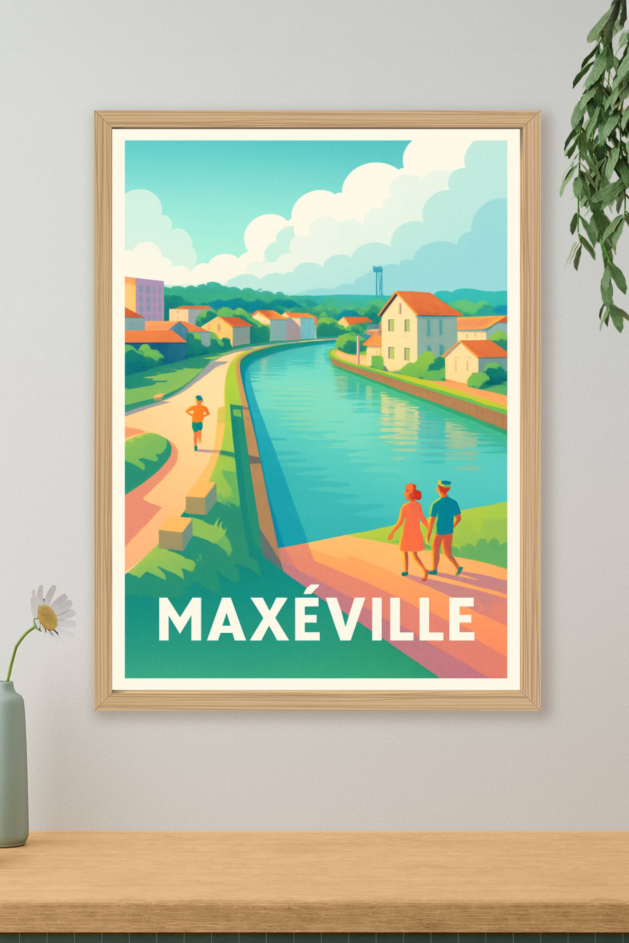 Découvrez l'atmosphère paisible de Maxéville avec cette affiche illustrée, représentant une balade le long du canal dans un cadre verdoyant et lumi...