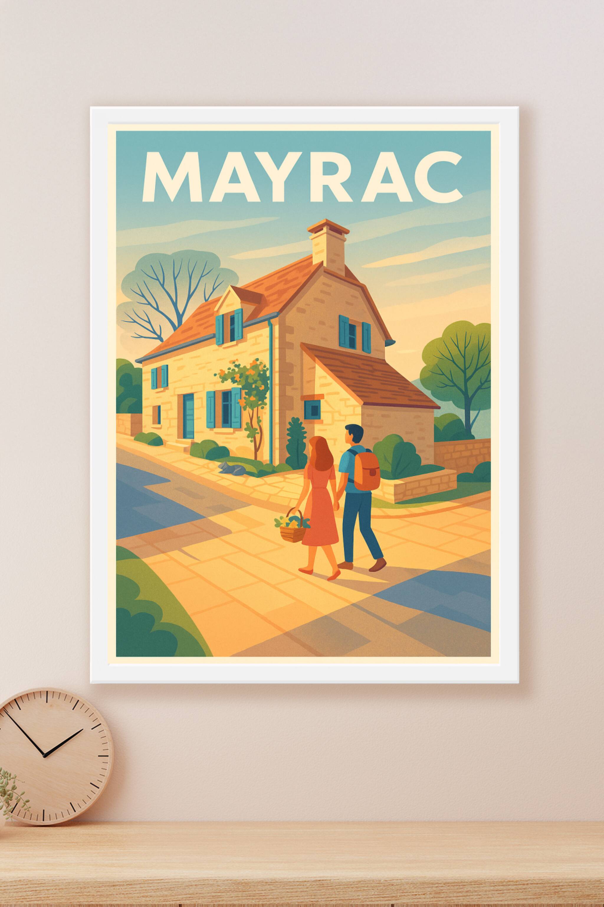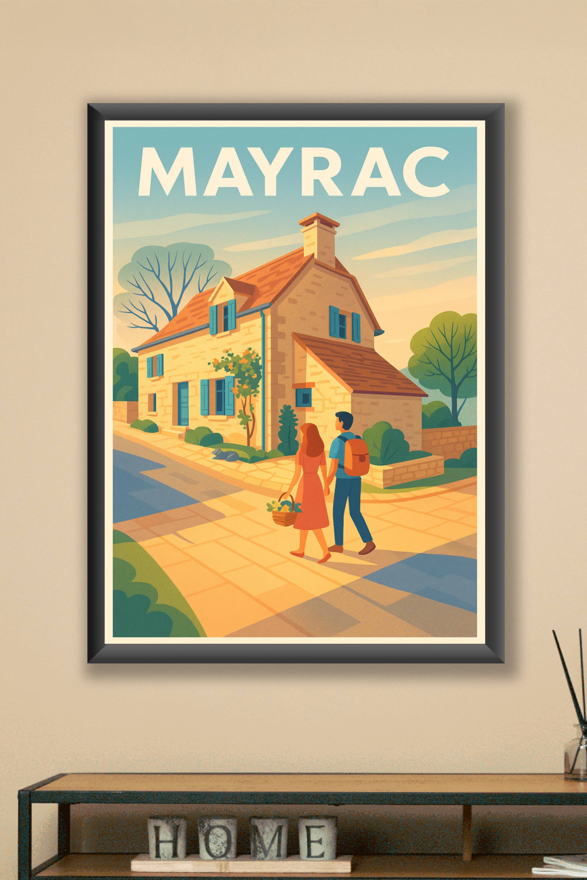 Découvrez l'atmosphère sereine et chaleureuse de Mayrac avec cette affiche au style vintage, représentant une charmante maison en pierre baignée pa...