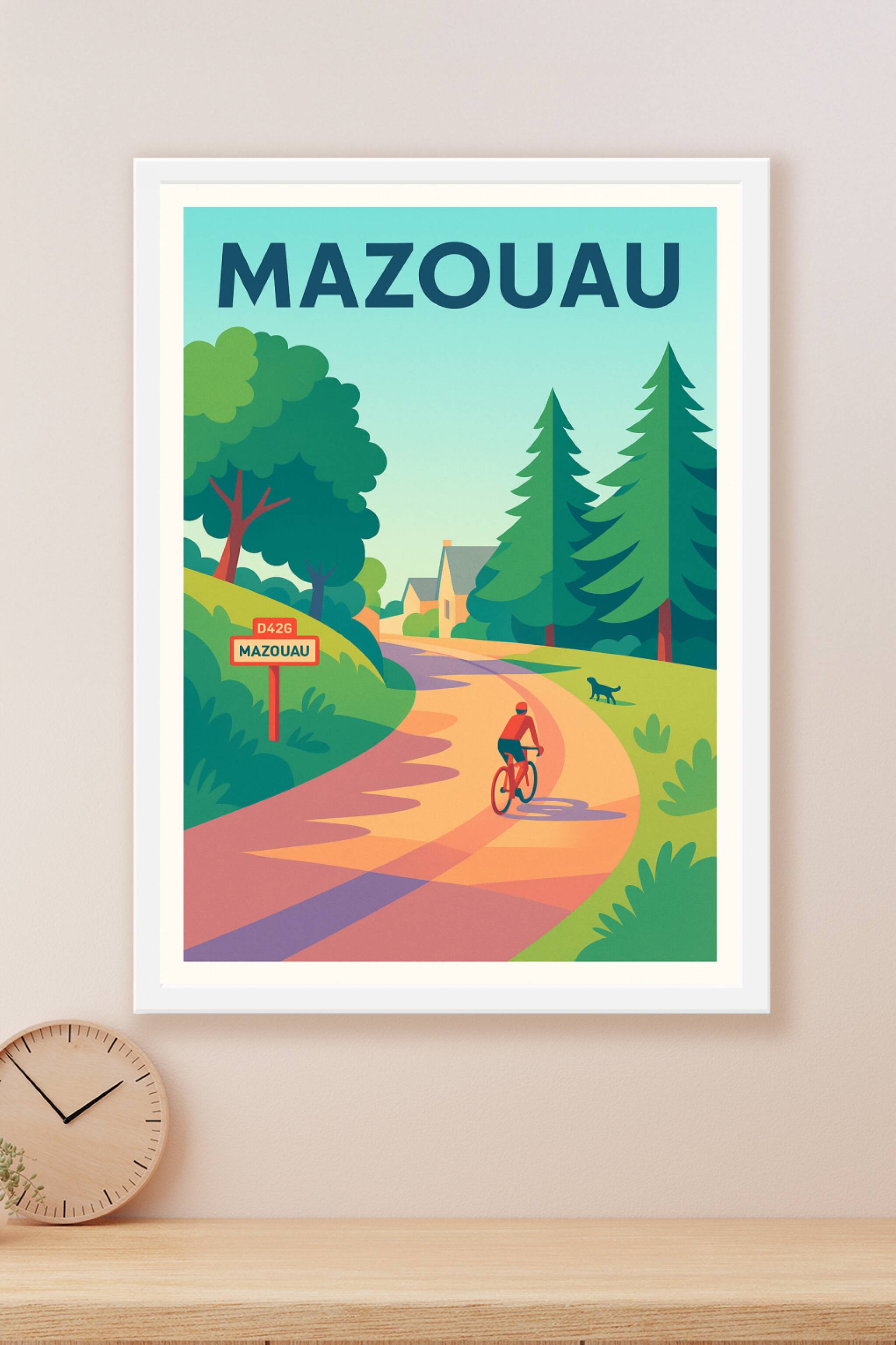 Découvrez le charme bucolique de Mazouau avec cette affiche au style vintage et coloré. L'illustration met en scène une route sinueuse bordée d'arb...