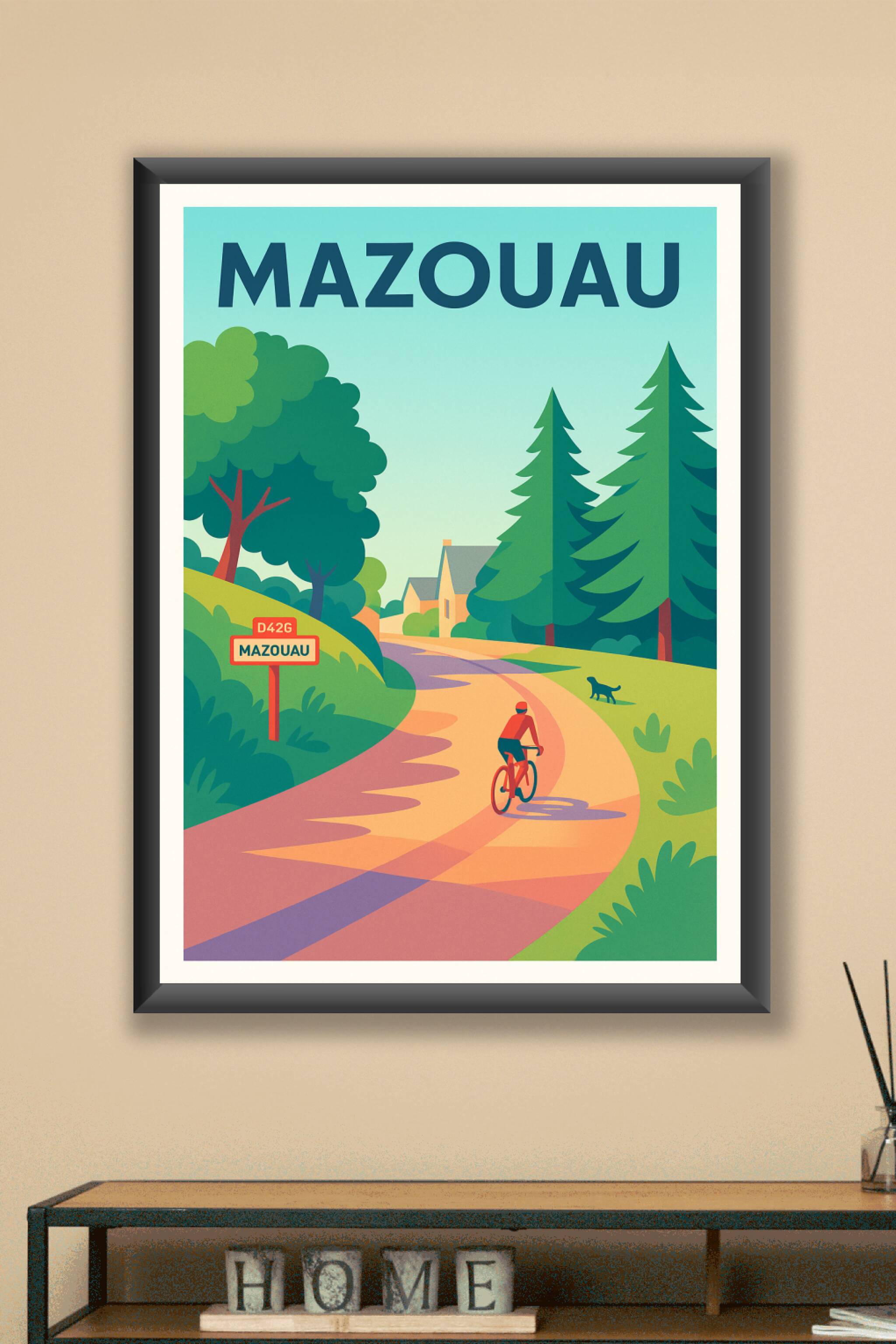 Découvrez le charme bucolique de Mazouau avec cette affiche au style vintage et coloré. L'illustration met en scène une route sinueuse bordée d'arbres majestueux, où un cycliste profite d'une balade tranquille au cœur d'un paysage paisible. Ce poster est imprimé en tirage "Fine Art" sur un papier 305g coton, garantissant une qualité d'impression exceptionnelle et des couleurs éclatantes. Disponible en formats A1 à A4, avec ou sans cadre, cette affiche apportera une touche de sérénité et de nature à votre décoration intérieure. Profitez d'une fabrication 100% française pour un rendu haut de gamme et durable.