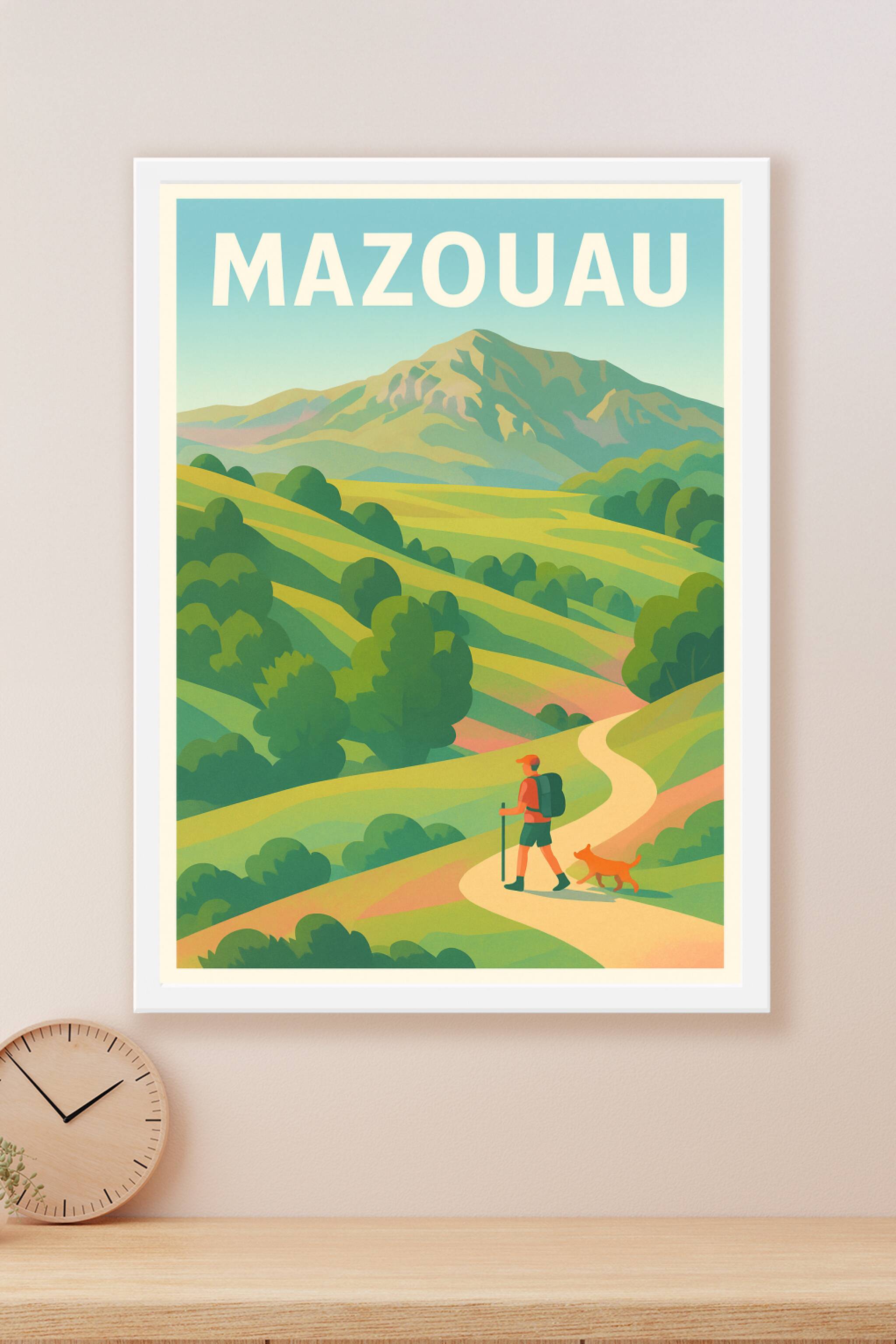 Découvrez l'esprit d'aventure et de tranquillité avec ce poster illustré mettant en scène une randonnée dans les paysages vallonnés de Mazouau. Cet...