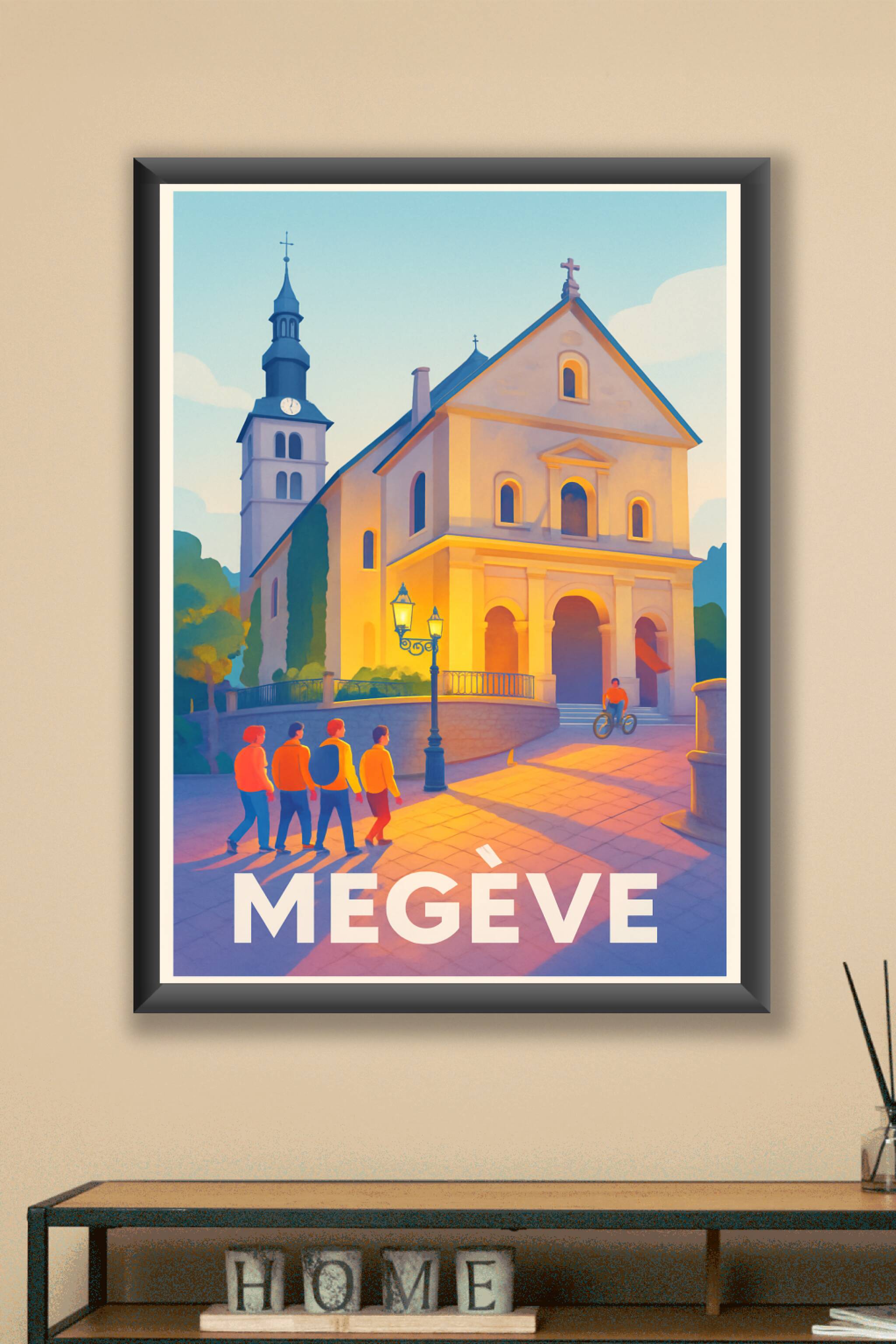 Découvrez l'élégance intemporelle de Megève à travers cette affiche illustrée mettant en avant une scène chaleureuse au coucher du soleil. Le charm...