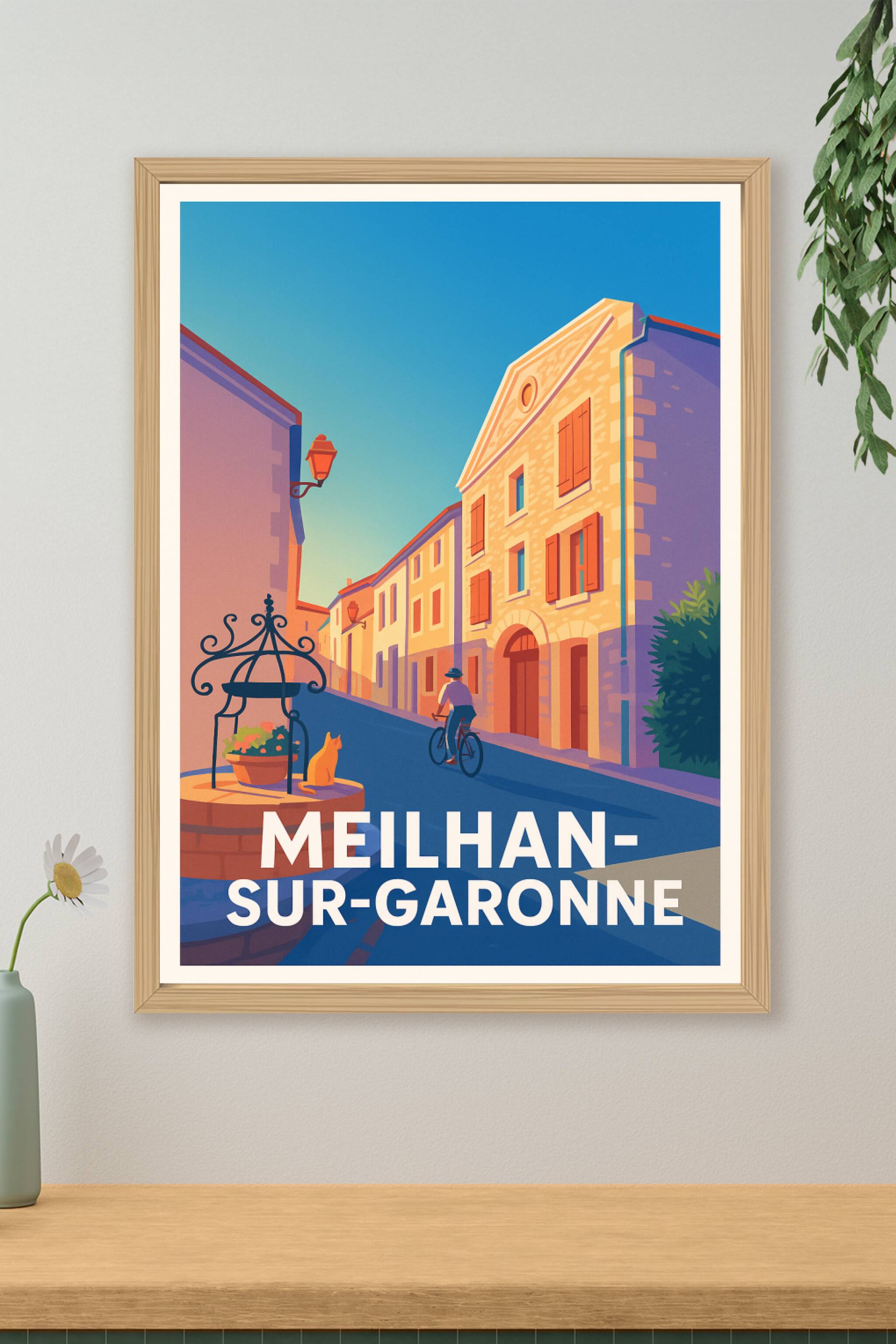 Découvrez l'élégance intemporelle de Meilhan-sur-Garonne à travers cette affiche illustrée aux couleurs chaudes et apaisantes. Le village se dévoile sous un soleil radieux, mettant en valeur ses ruelles pleines de caractère, où un cycliste s'évade en toute sérénité. Ce poster, imprimé en tirage "Fine Art" sur un papier coton 305g de haute qualité, assure des couleurs éclatantes et une durabilité optimale. Disponible en formats A1 à A4, avec ou sans cadre, cette affiche est parfaite pour apporter une touche authentique et chaleureuse à votre décoration intérieure. Fabriquée en France avec un soin artisanal, elle fera également un cadeau idéal pour les amoureux des villages de charme et de l'art déco vintage.