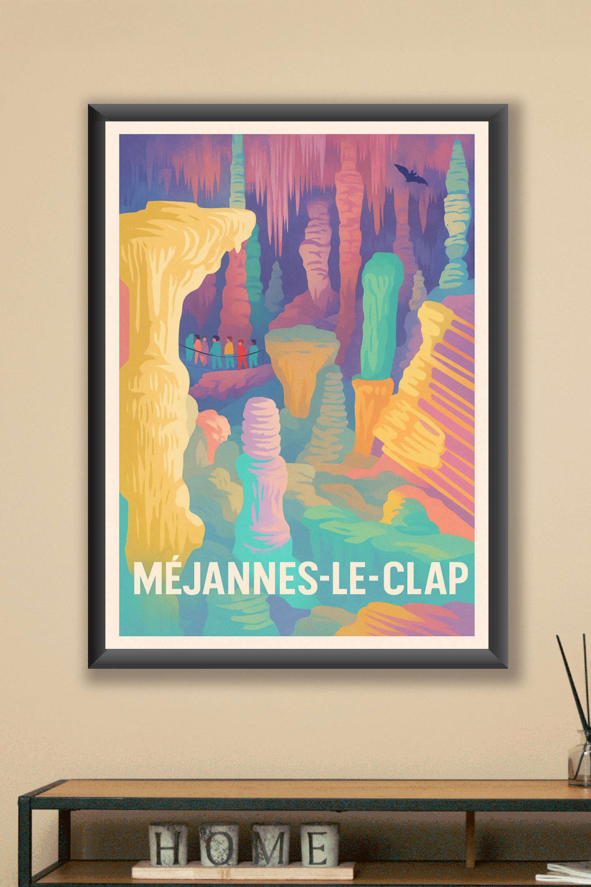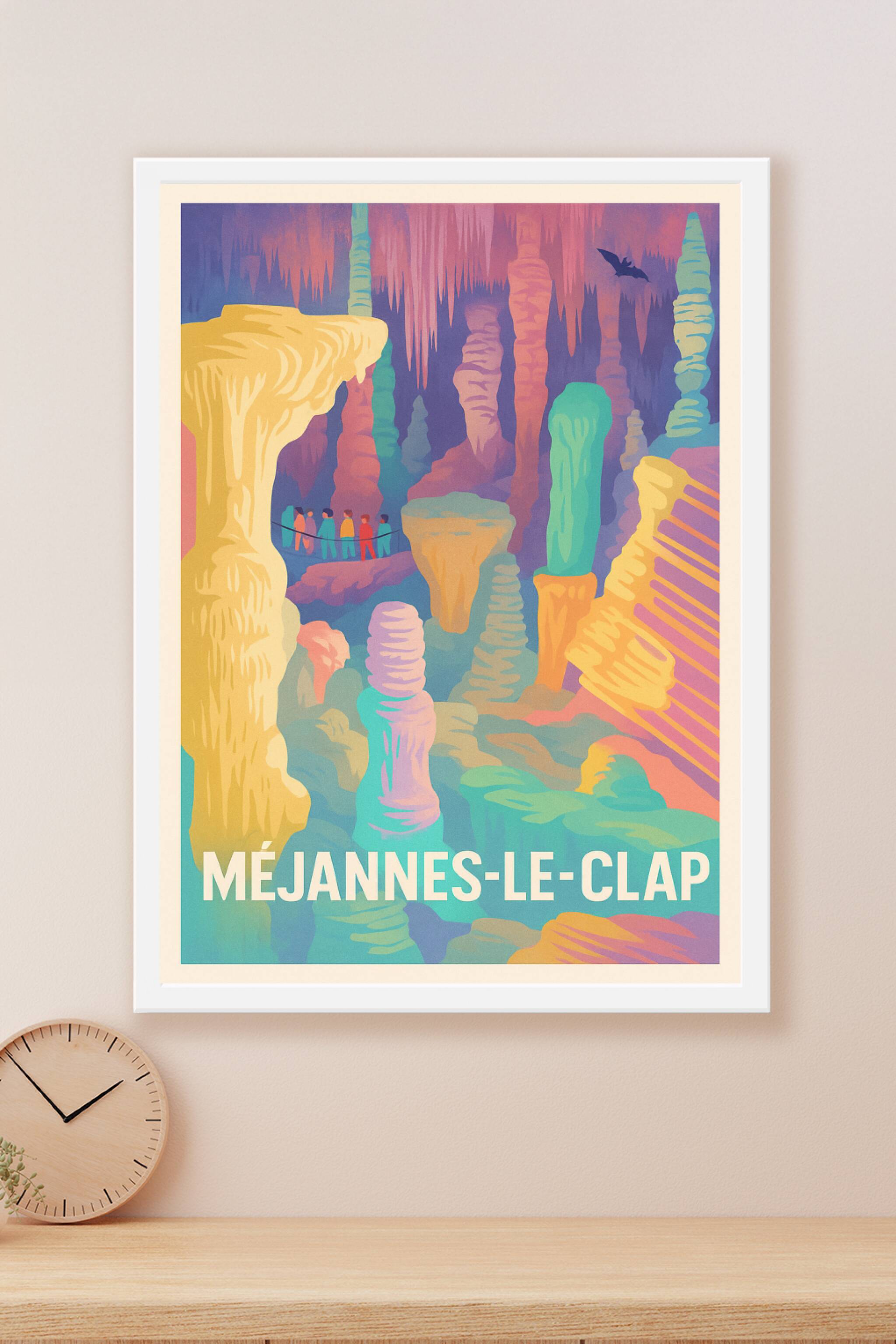 Découvrez la majesté des grottes de Méjannes-le-Clap avec cette affiche artistique aux teintes pastel et au style rétro unique. Ce poster met en lu...