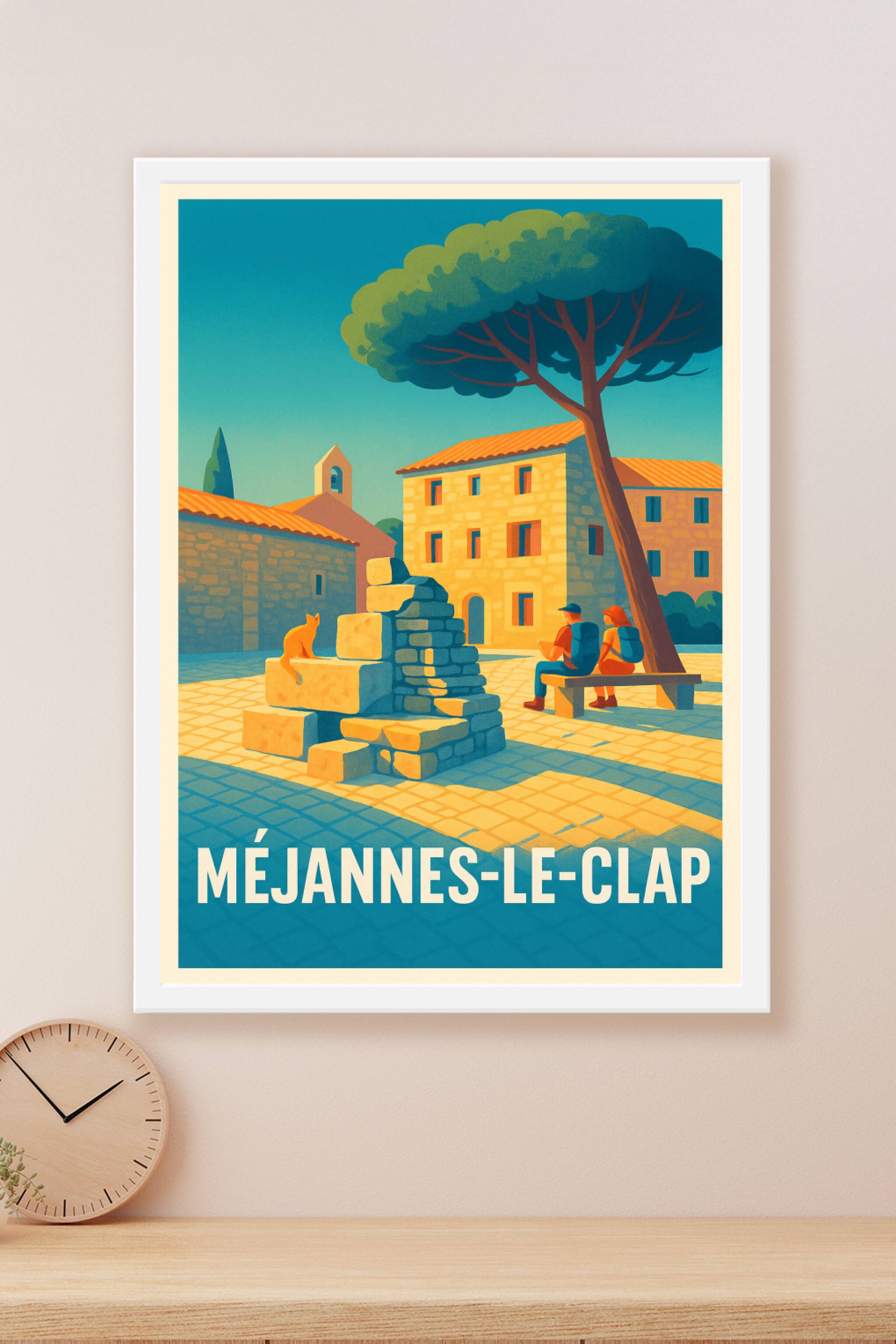 Découvrez la sérénité emblématique de Méjannes-le-Clap avec cette affiche rétro illustrant une scène paisible dans la place du village, baignée par la lumière douce du soleil et dominée par son architecture typique. Ce poster au style vintage est imprimé en tirage "Fine Art" sur papier 305g coton, garantissant une qualité d'impression et de rendu des couleurs optimale. Disponible en plusieurs formats de A1 à A4, avec ou sans cadre, cette affiche est parfaite pour sublimer votre décoration intérieure ou offrir un souvenir authentique de ce charmant village du sud de la France. Profitez d'une impression haut de gamme, 100% fabriquée en France, pour une décoration élégante et durable.
