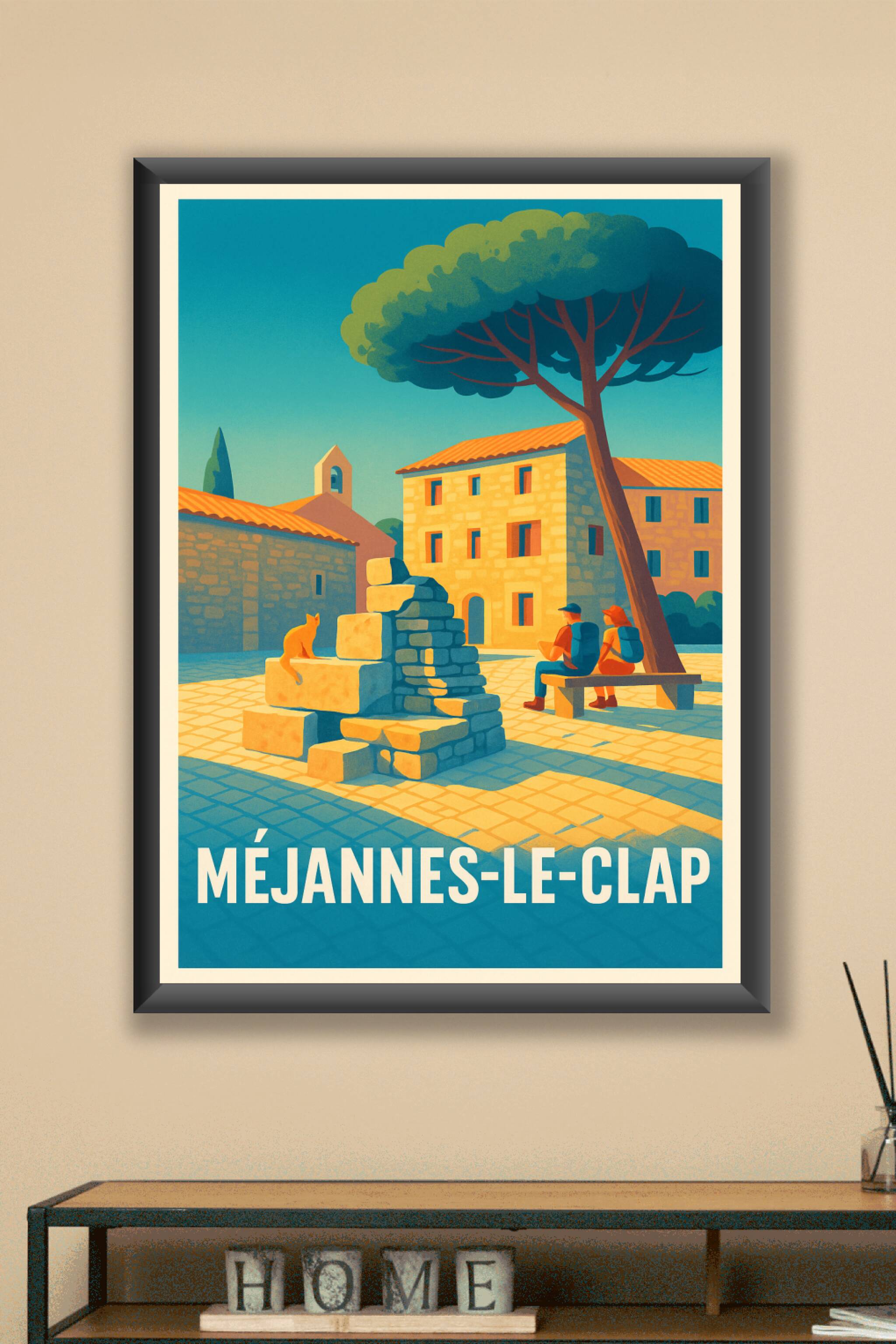 Découvrez la sérénité emblématique de Méjannes-le-Clap avec cette affiche rétro illustrant une scène paisible dans la place du village, baignée par...