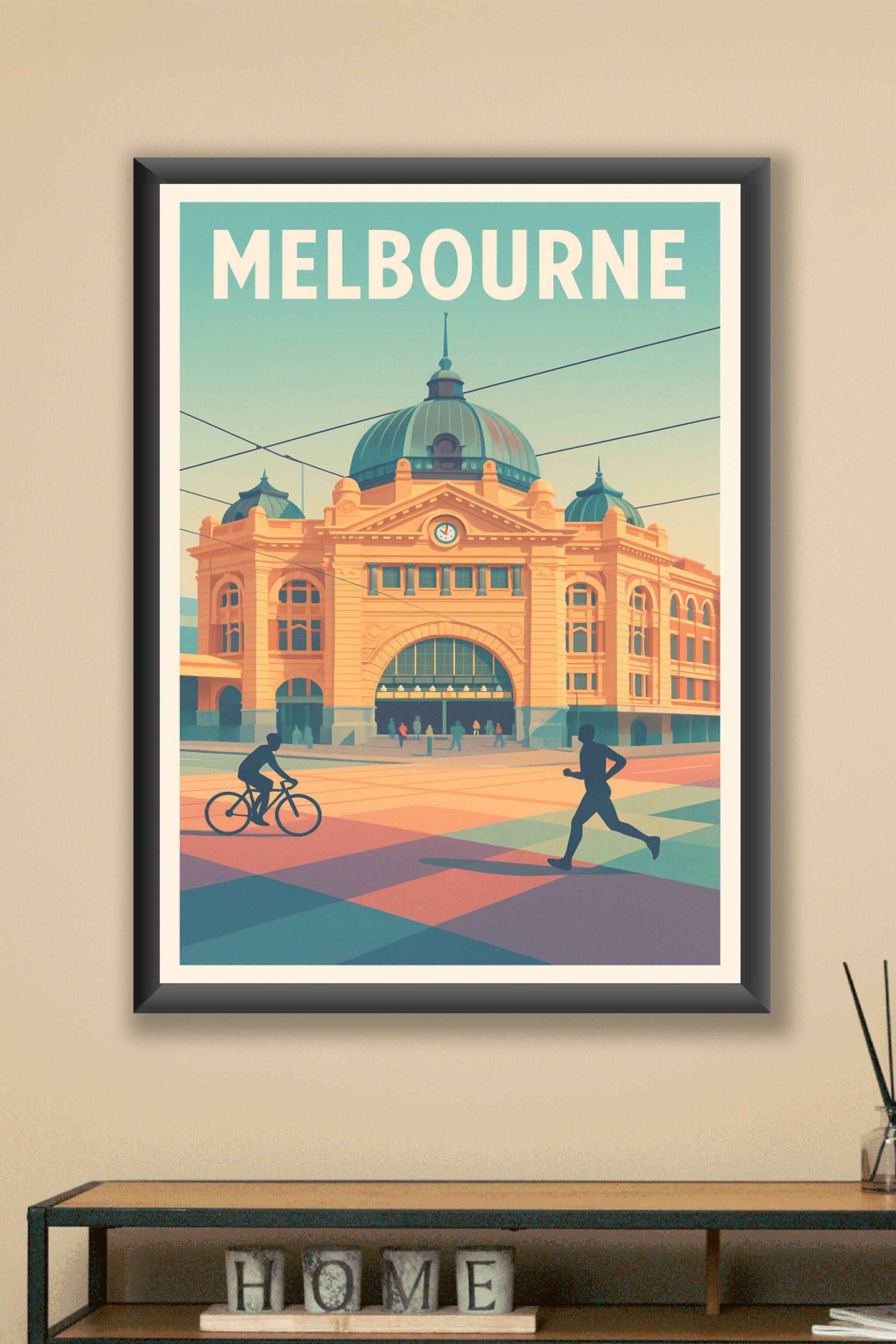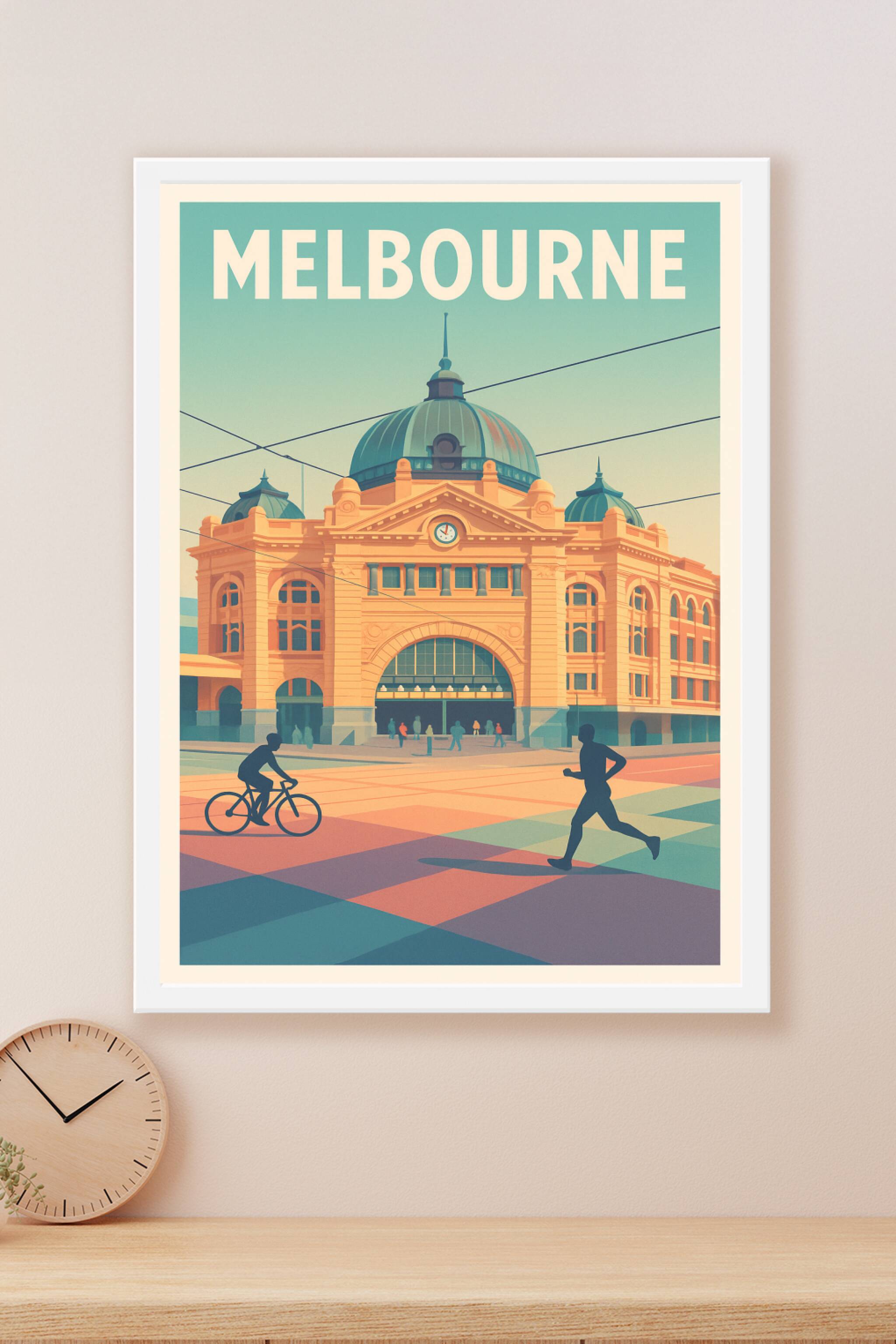 Découvrez l'animation et le charme architectural de Melbourne avec cette affiche illustrée mettant en avant un monument emblématique de la ville. C...