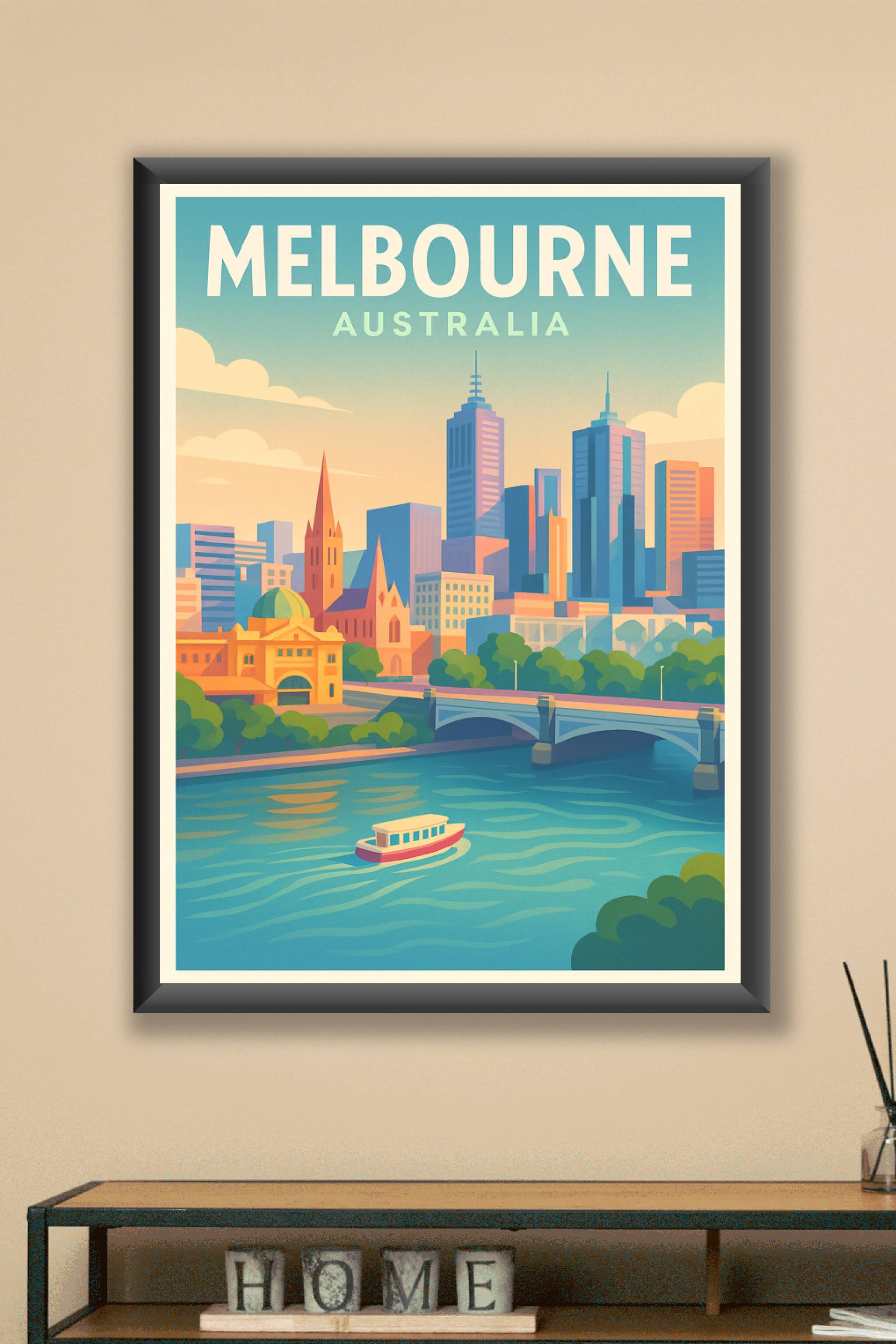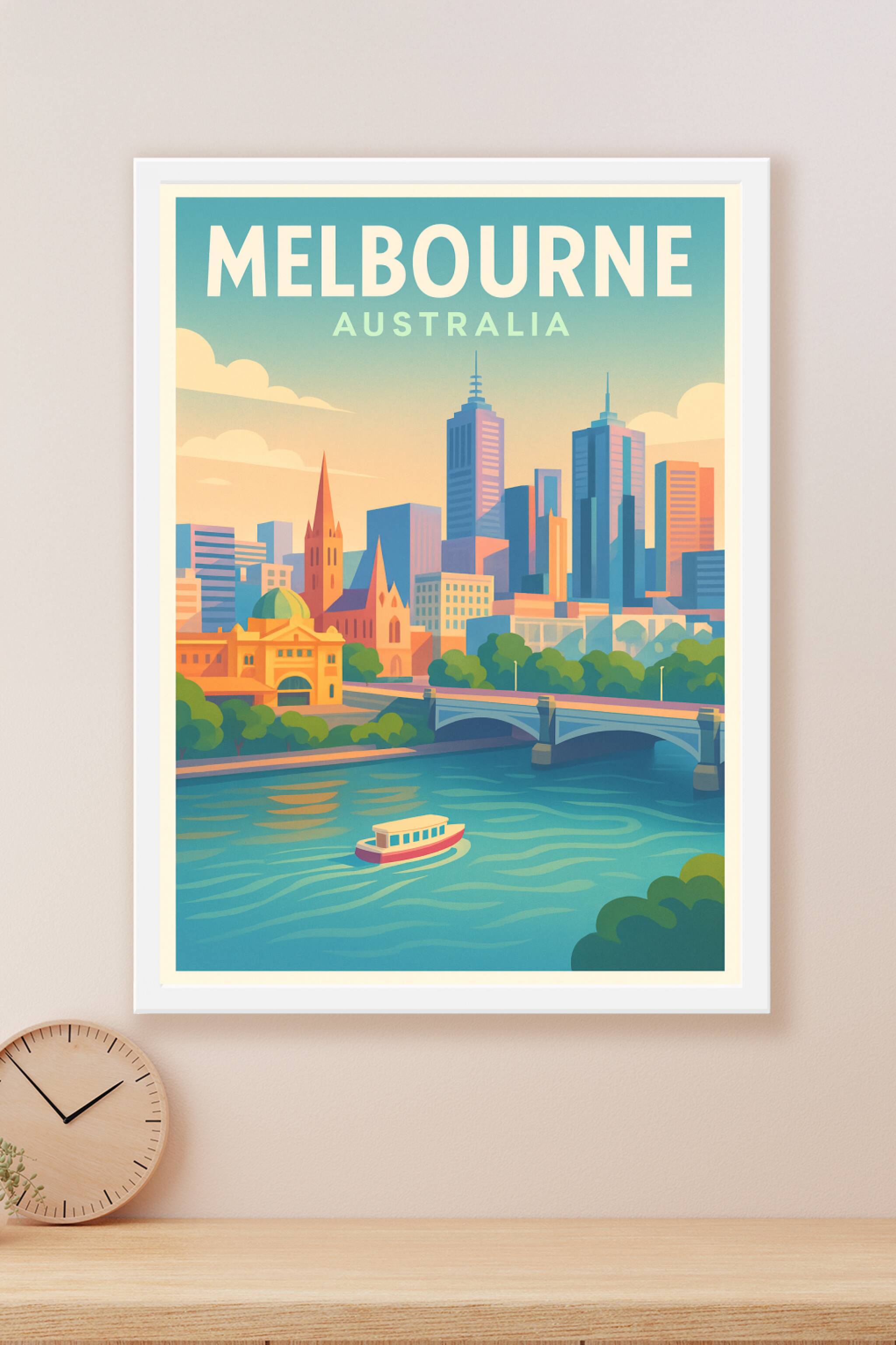 Découvrez l'élégance et le charme de Melbourne avec cette affiche au style vintage moderne, illustrant le paysage urbain iconique baigné dans une l...