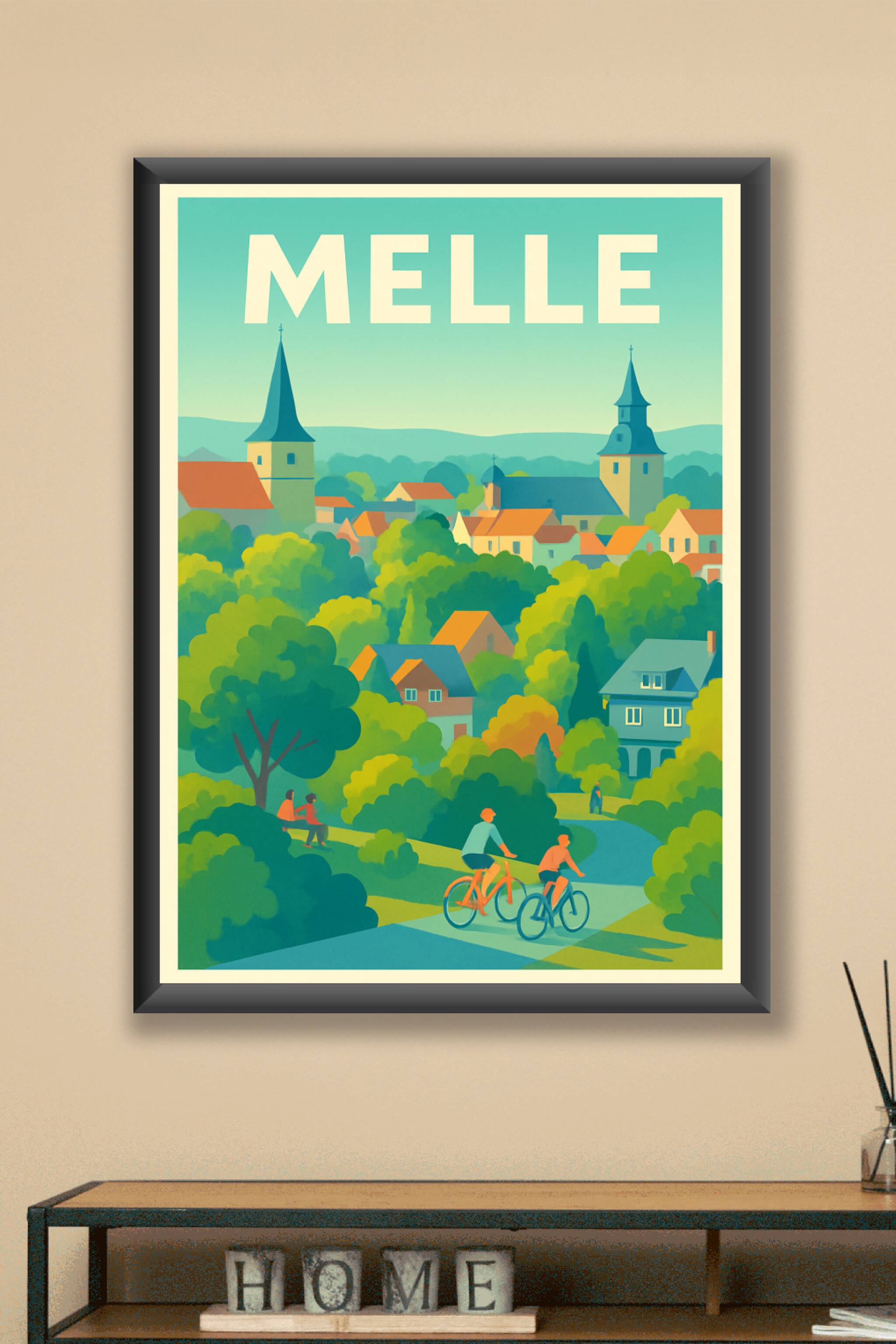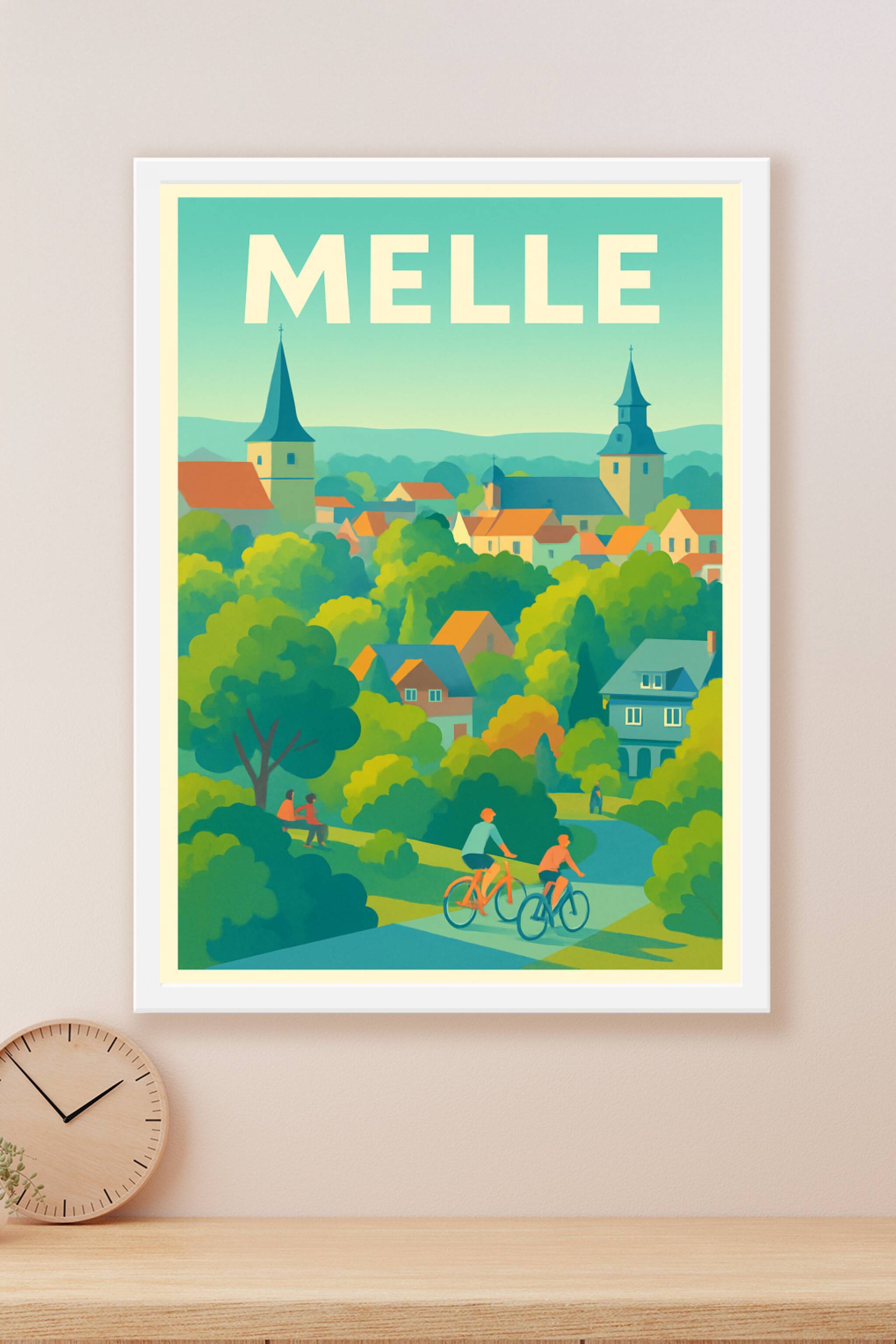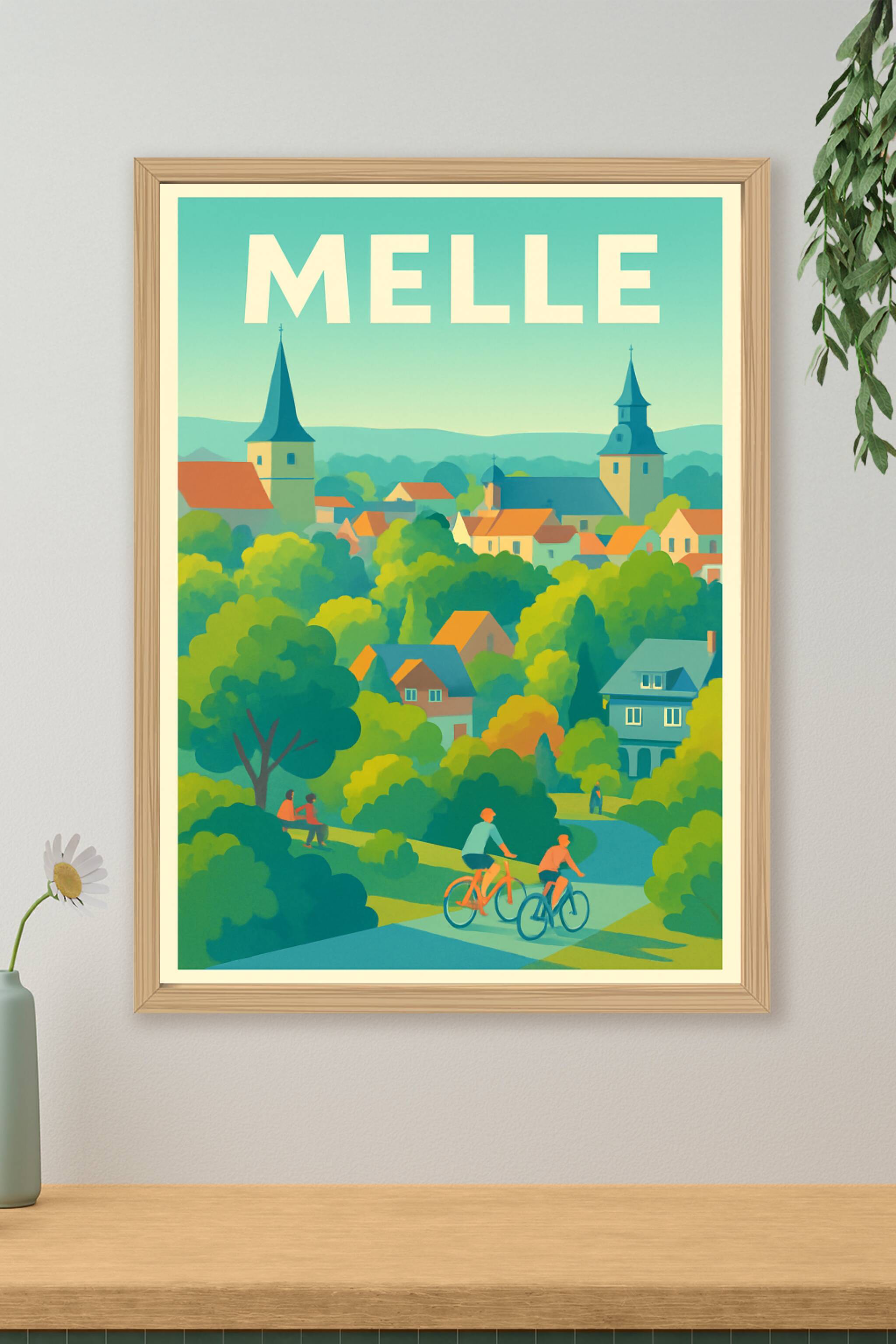 Découvrez le charme paisible de Melle à travers cette affiche illustrée pleine de couleurs douces et de sérénité. Cette scène bucolique met en vale...