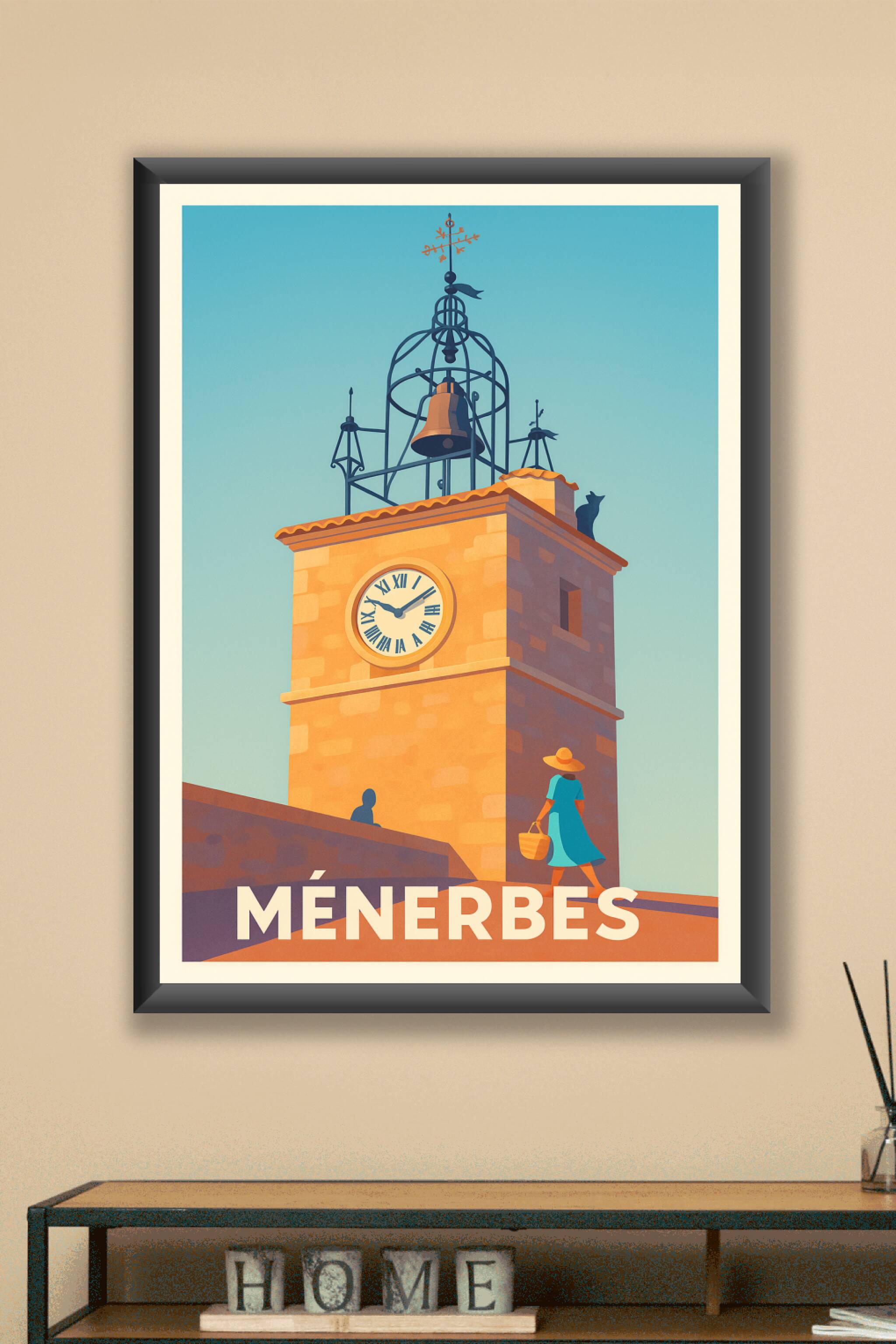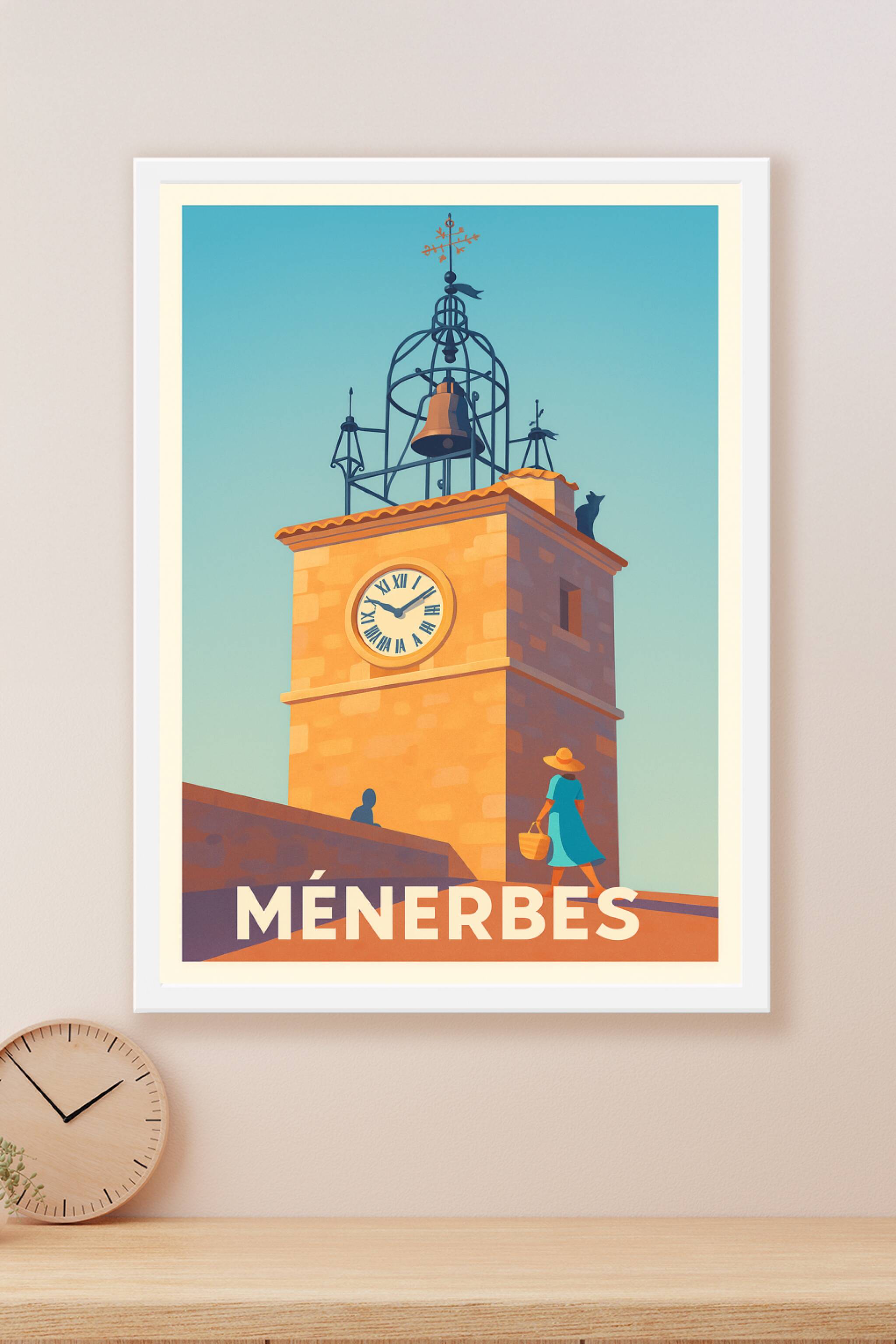 Découvrez l'élégance et la sérénité du village de Ménerbes avec cette affiche au style rétro illustré, mettant en valeur l'emblématique horloge de ...