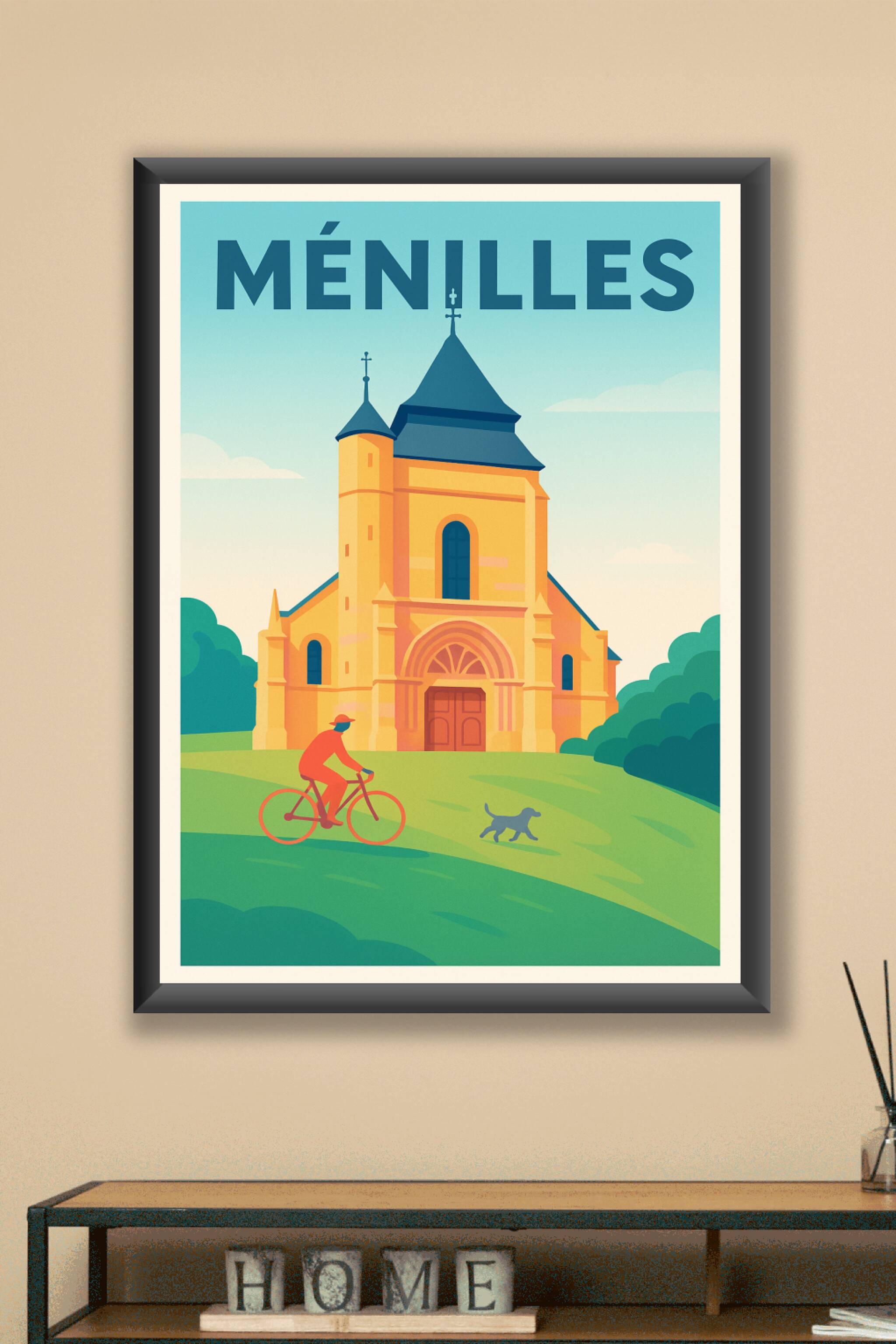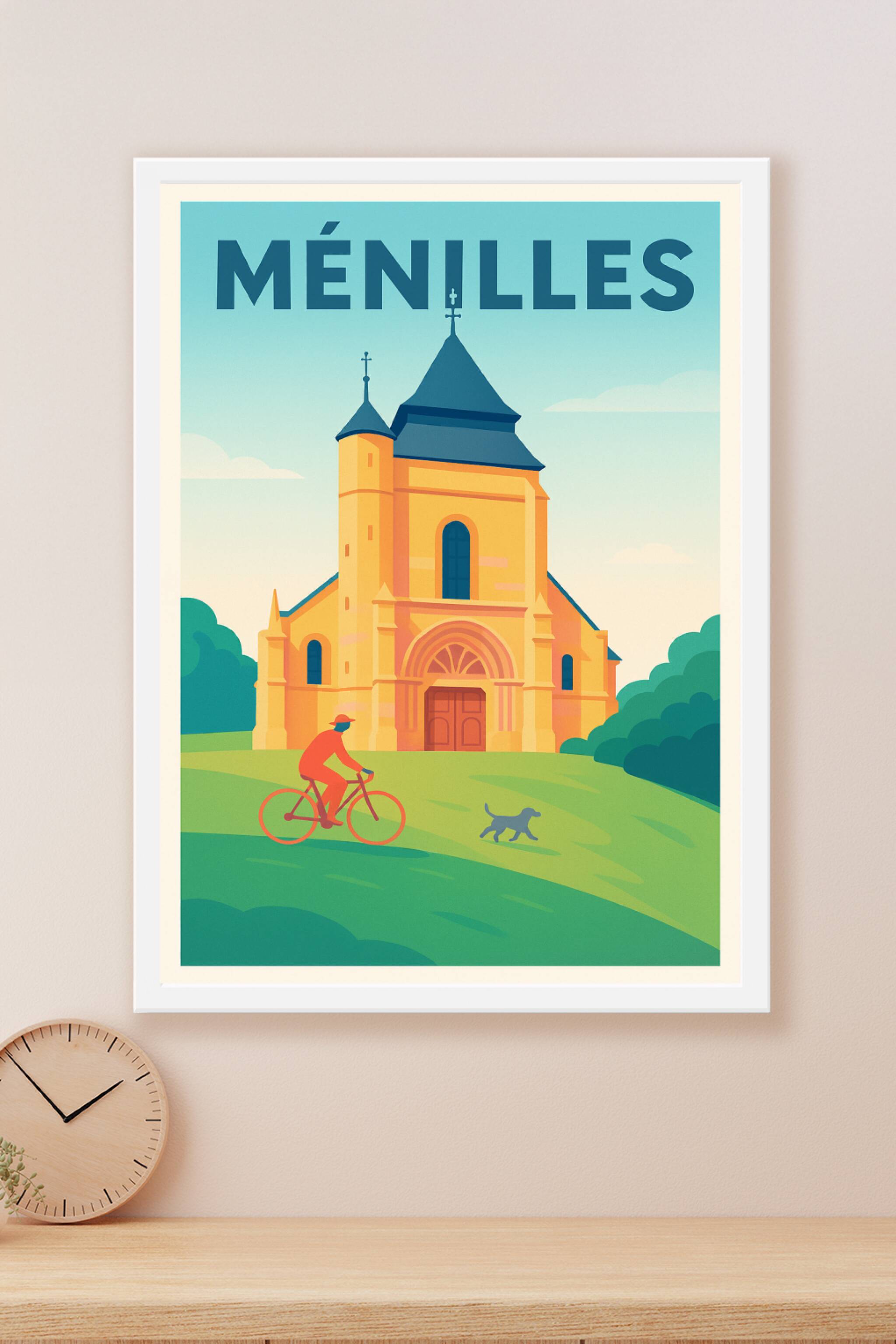 Découvrez la sérénité de Ménilles à travers cette magnifique affiche illustrant un instant de calme devant son architecture emblématique. Ce poster capture l'essence tranquille de la commune, avec un cycliste et son chien sur un fond verdoyant, donnant une atmosphère douce et accueillante. Imprimée en tirage "Fine Art" sur papier 305g coton, cette affiche vous garantit une qualité d'impression exceptionnelle, fidèle aux couleurs et aux détails. Disponible en formats A1 à A4, avec ou sans cadre, elle s'adapte parfaitement à tous types d'intérieurs. Sublimez votre décoration ou offrez un souvenir unique de Ménilles grâce à ce poster de haute qualité, intégralement imprimé en France.