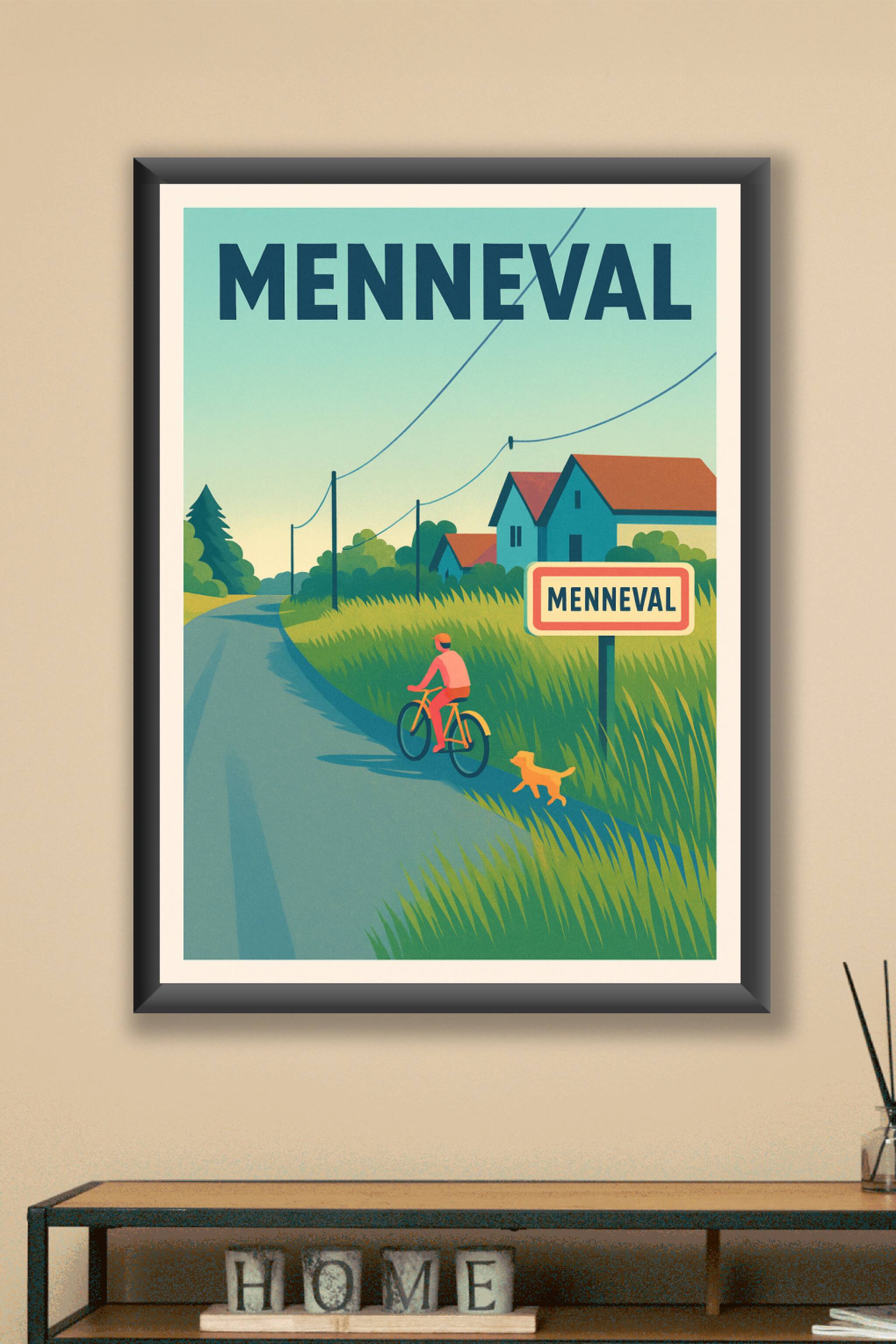Découvrez l'ambiance sereine et intemporelle de Menneval avec cette affiche illustrée au style vintage chaleureux. Un cycliste et son chien travers...
